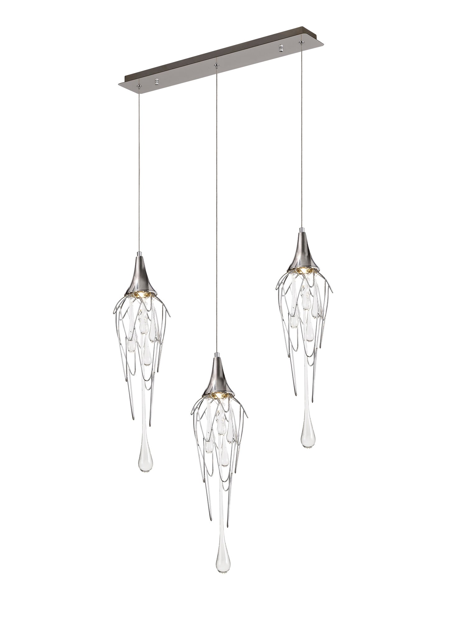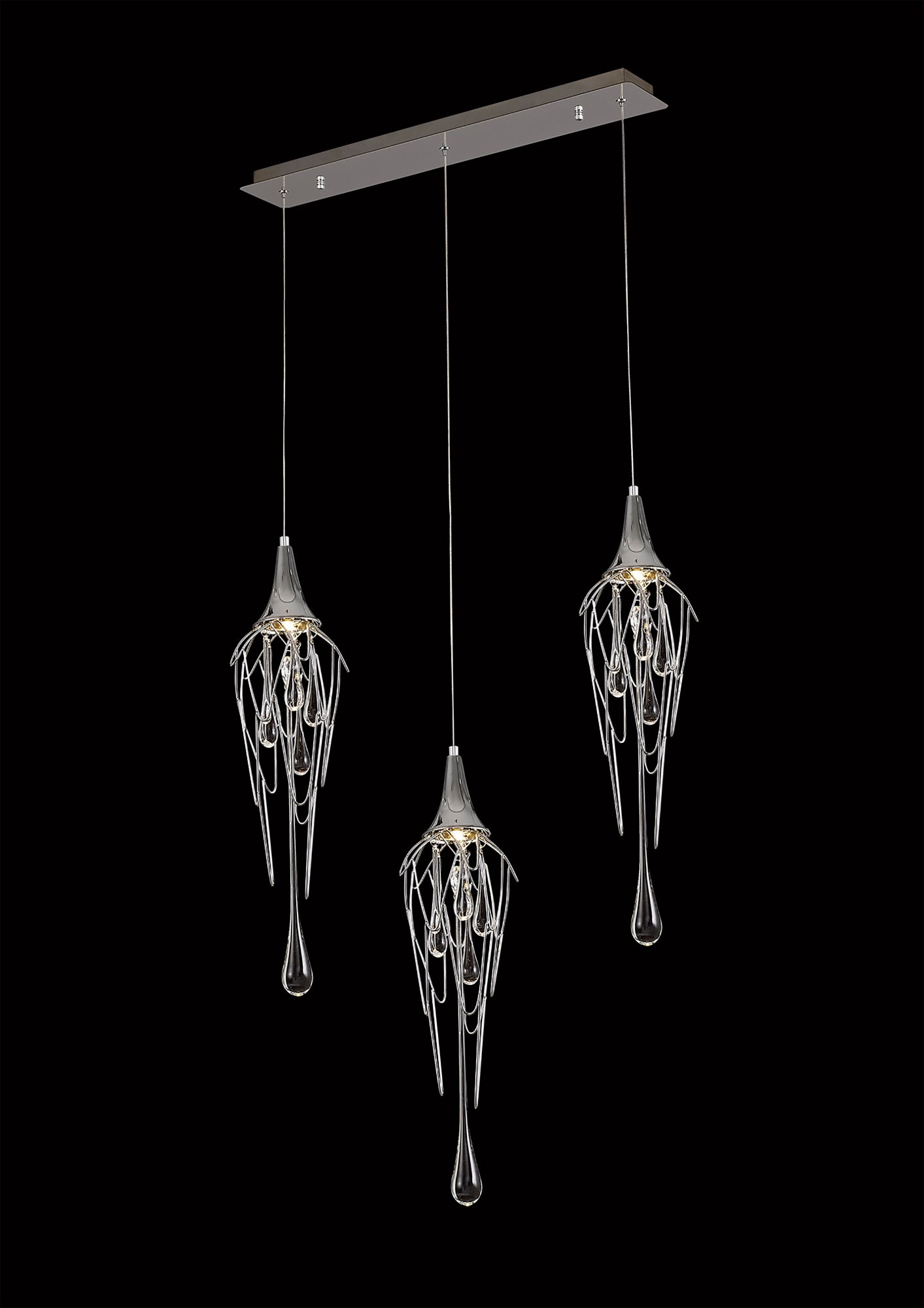 isotope is a range of multiple pendants and complementing wall lamp, that takes the concept of a melting icicle one step further, not only using long clear crystal drops that mimic a falling drop of water but also shaping the frame which hosts them into a similar statement. The polished chrome metal frames are bent and curved like slowly cascading water which the smaller crystal drops and GU10 lampholders sit inside.