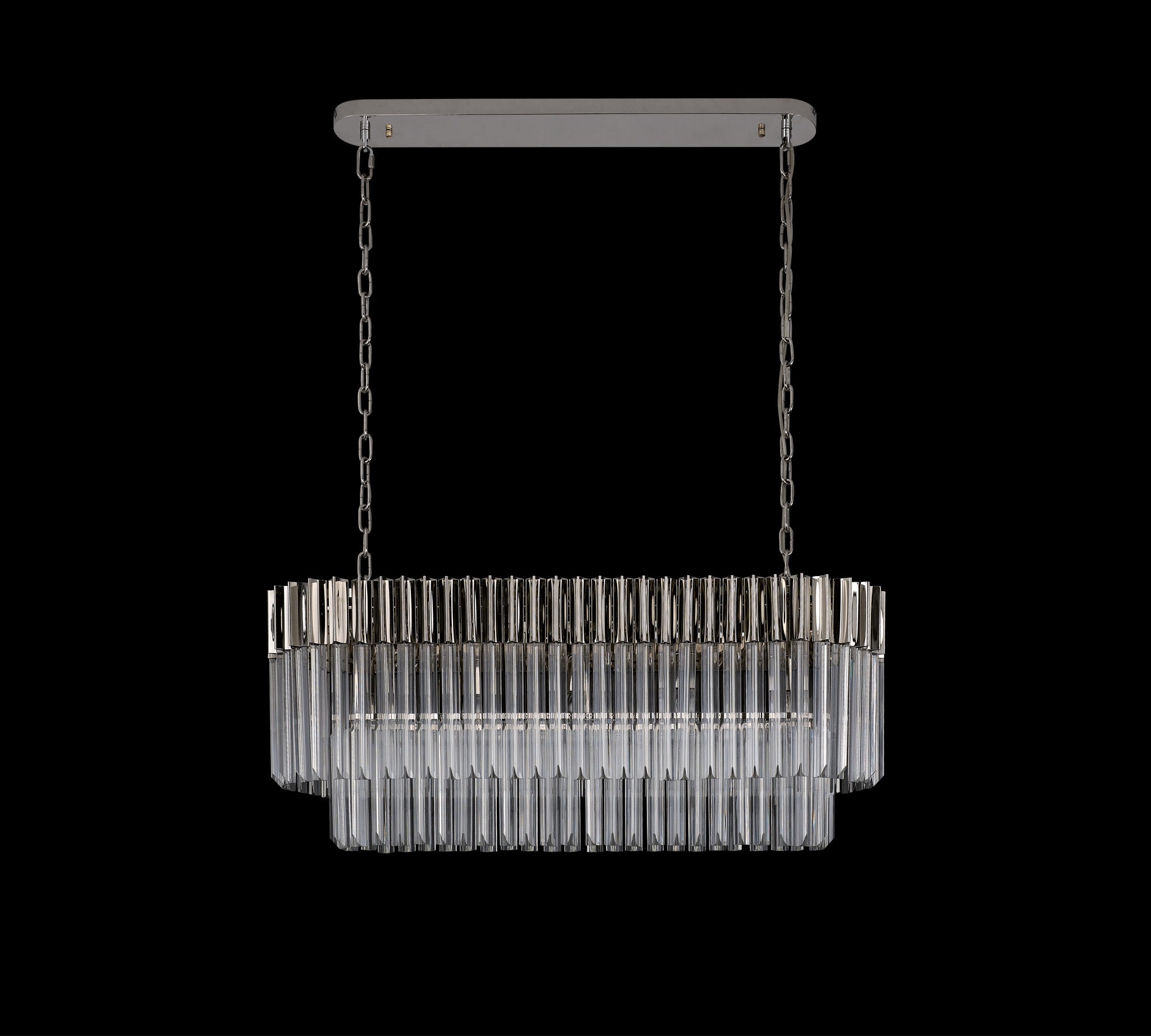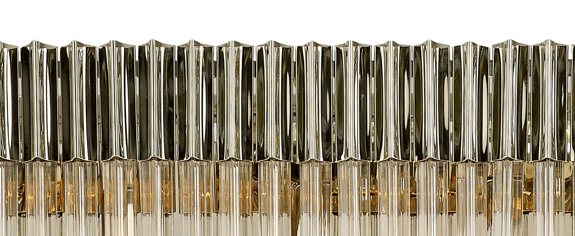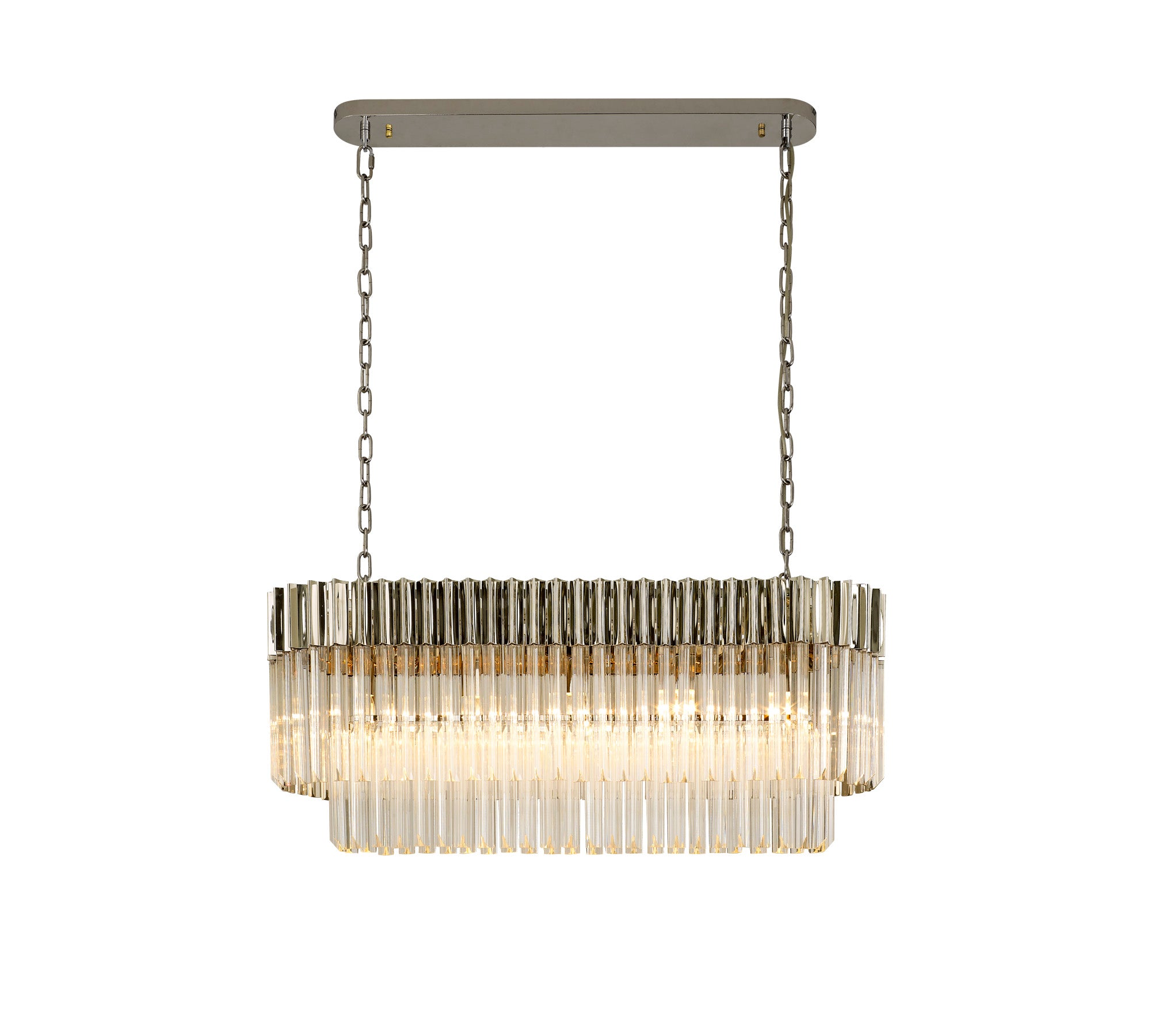 The popularity of the Knightsbridge collections initial release has been so overwhelming that the collection has now been extensively expanded to meet a wider range of specification needs. This contemporary design which originally combined a traditional brass finish with clear crystal glass pieces, now offers a polished nickel finish with either clear or smoked glass. The long angular shape of the glass which are in a tiered form, can now be found on larger more dramatic designs including a five tier and rectangular pendant to name only a few. Knightsbridge has a traditional noble effect composed with modern materials to create a range suitable for either a modern or more traditional room setting. The unique pyramid forms protruding from the frame provide an intriguing overall shape across this comprehensive collection.