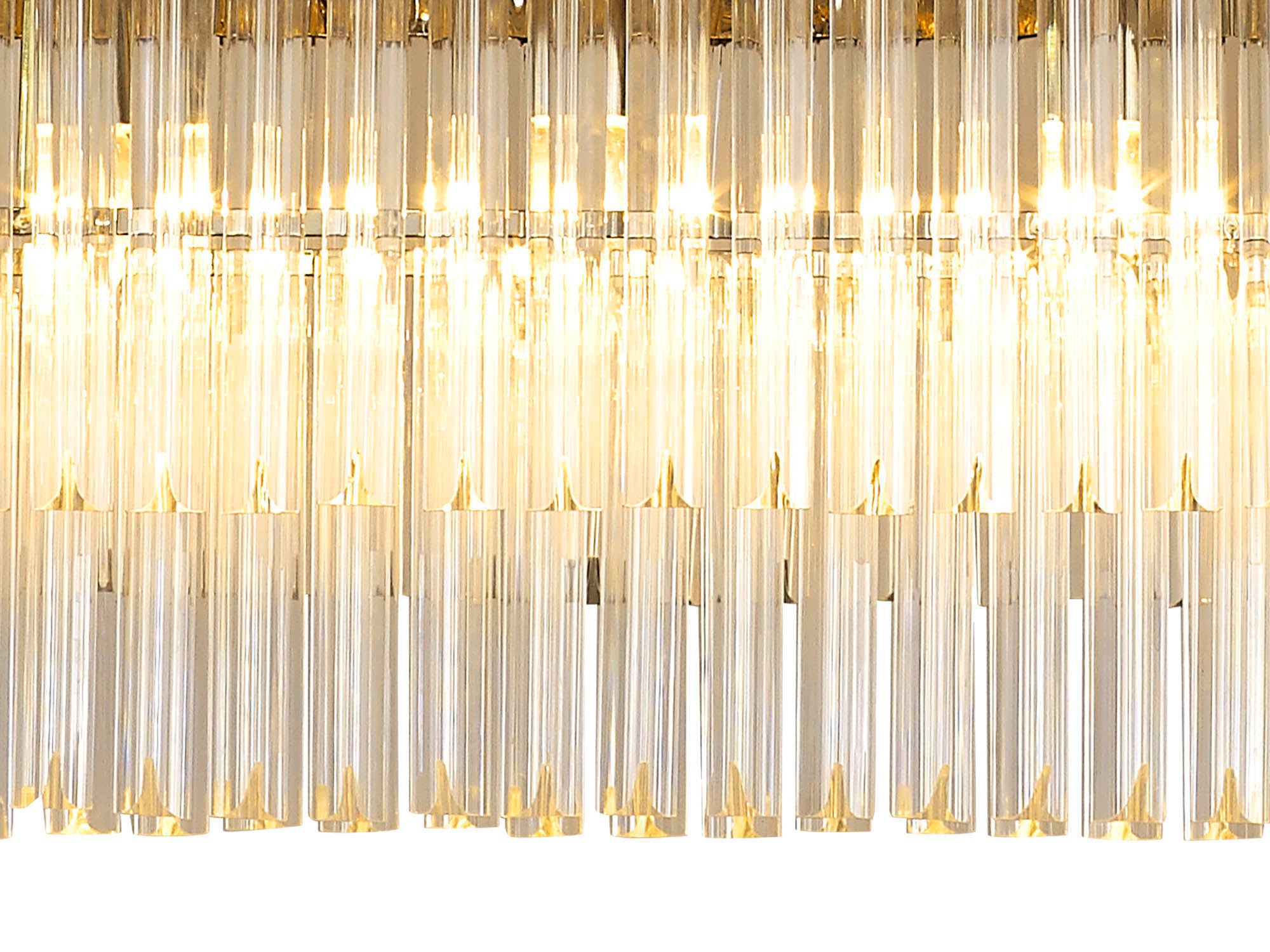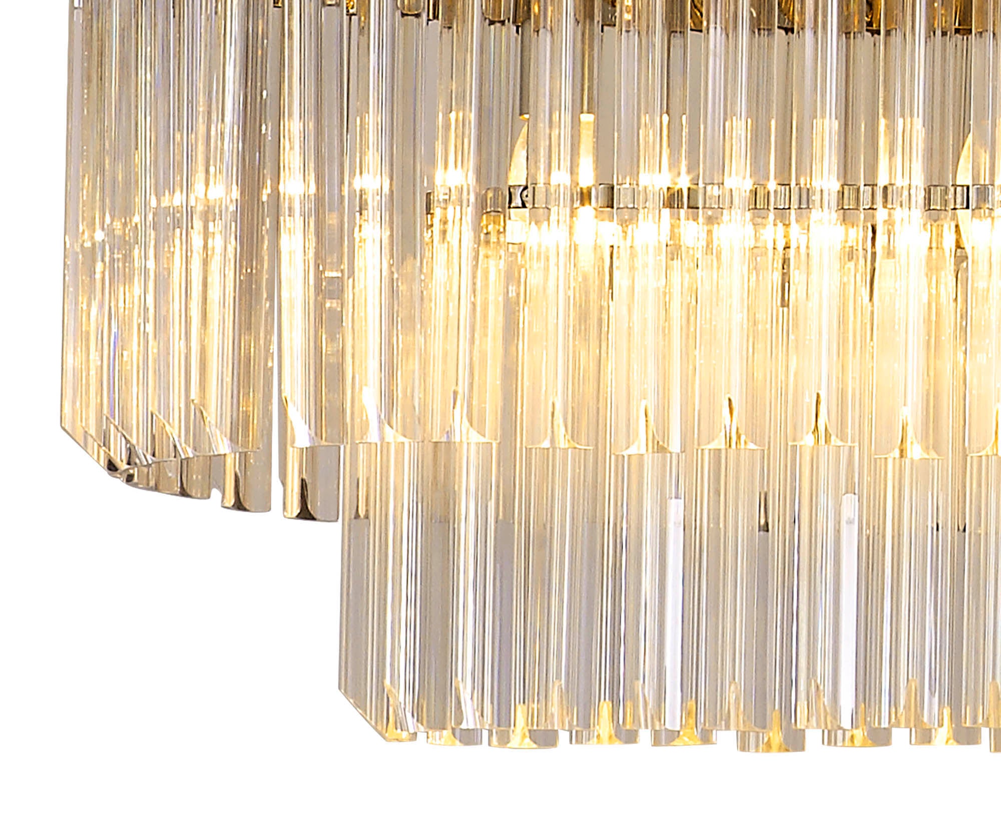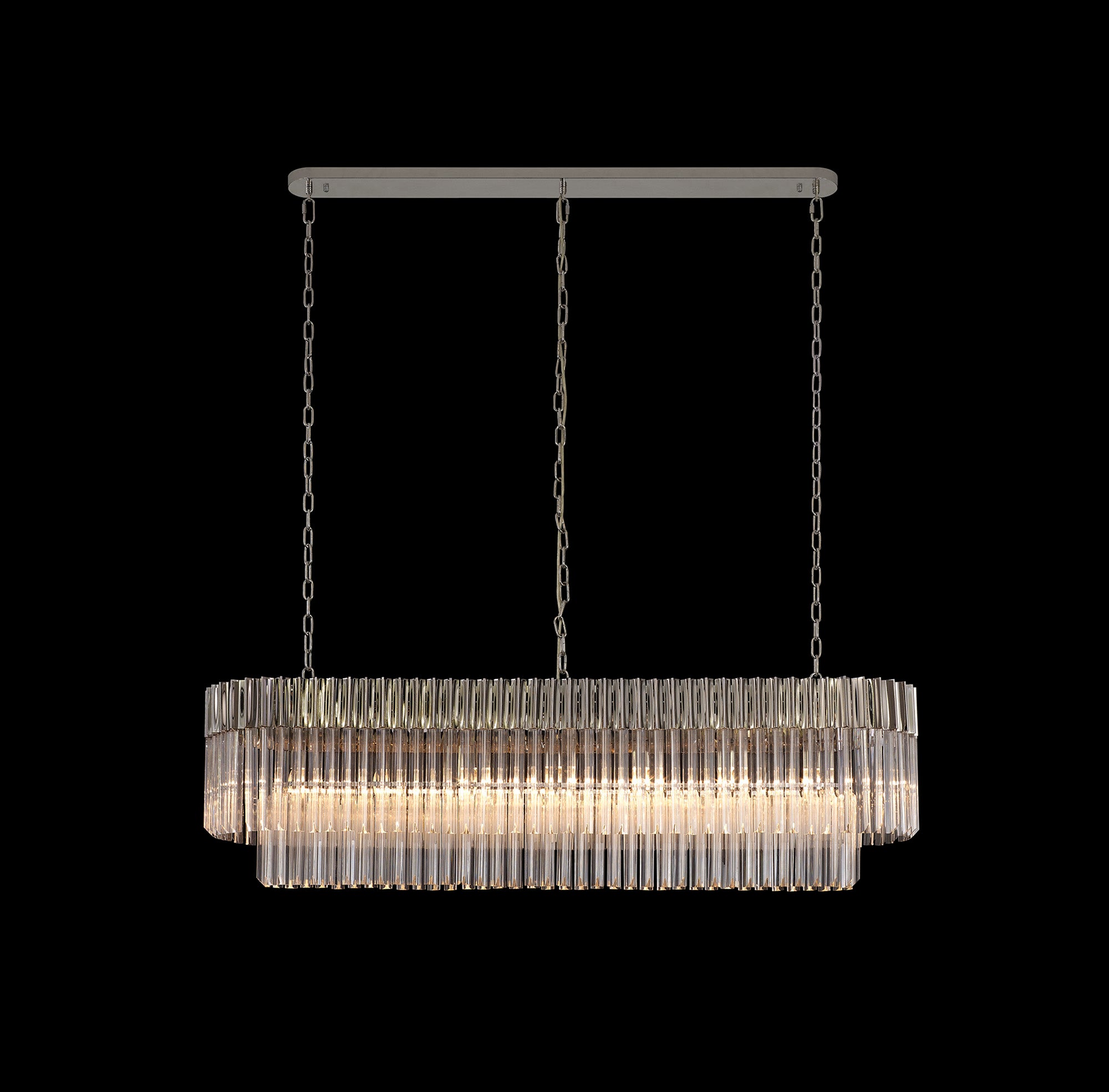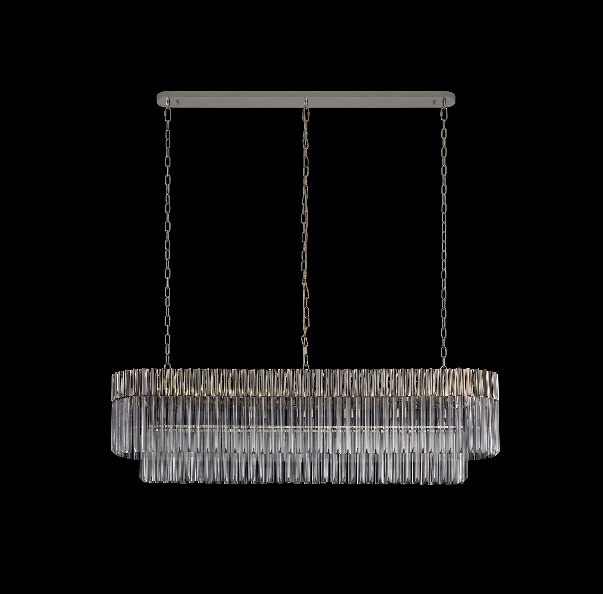 The popularity of the Knightsbridge collections initial release has been so overwhelming that the collection has now been extensively expanded to meet a wider range of specification needs. This contemporary design which originally combined a traditional brass finish with clear crystal glass pieces, now offers a polished nickel finish with either clear or smoked glass. The long angular shape of the glass which are in a tiered form, can now be found on larger more dramatic designs including a five tier and rectangular pendant to name only a few. Knightsbridge has a traditional noble effect composed with modern materials to create a range suitable for either a modern or more traditional room setting. The unique pyramid forms protruding from the frame provide an intriguing overall shape across this comprehensive collection.