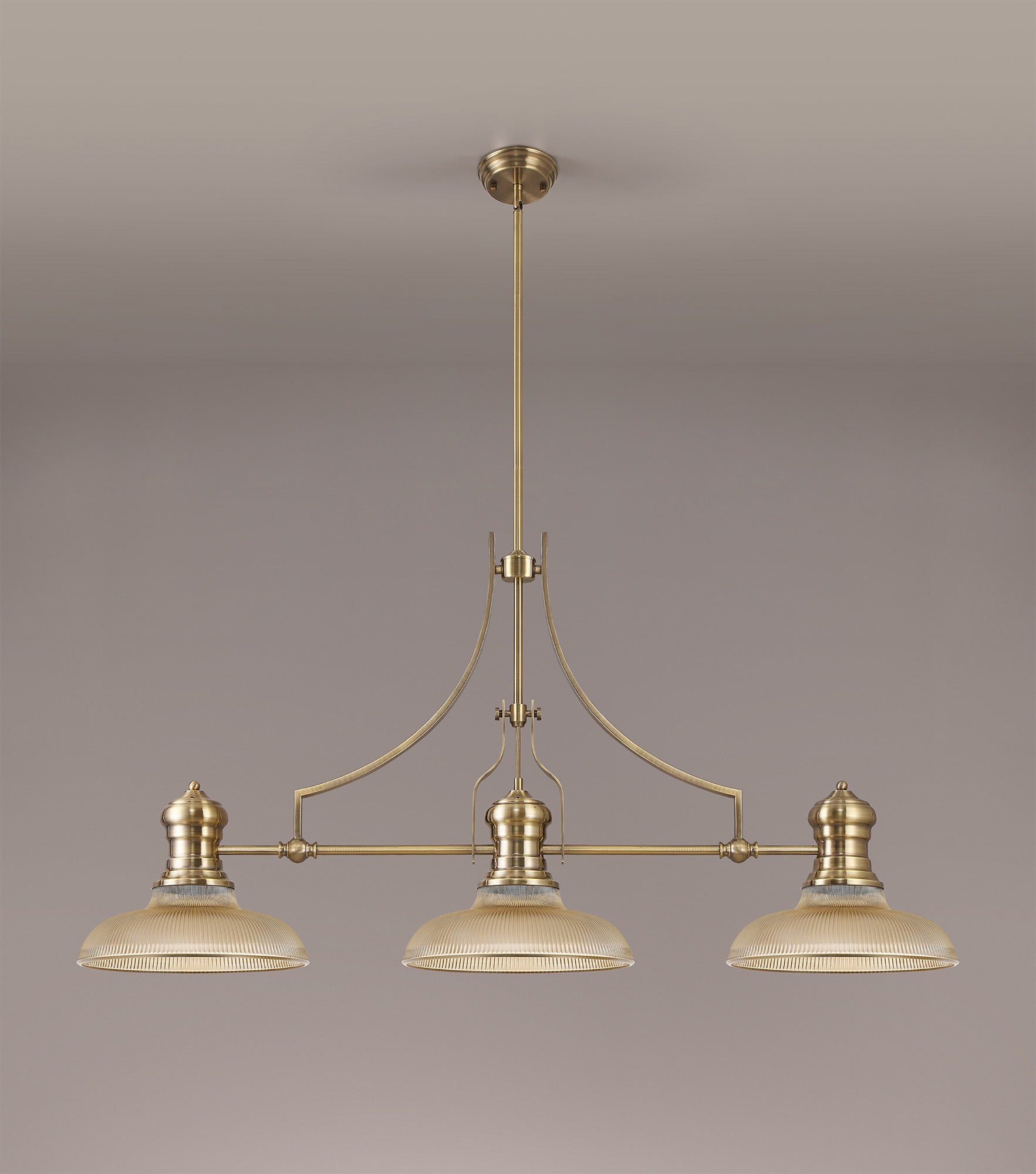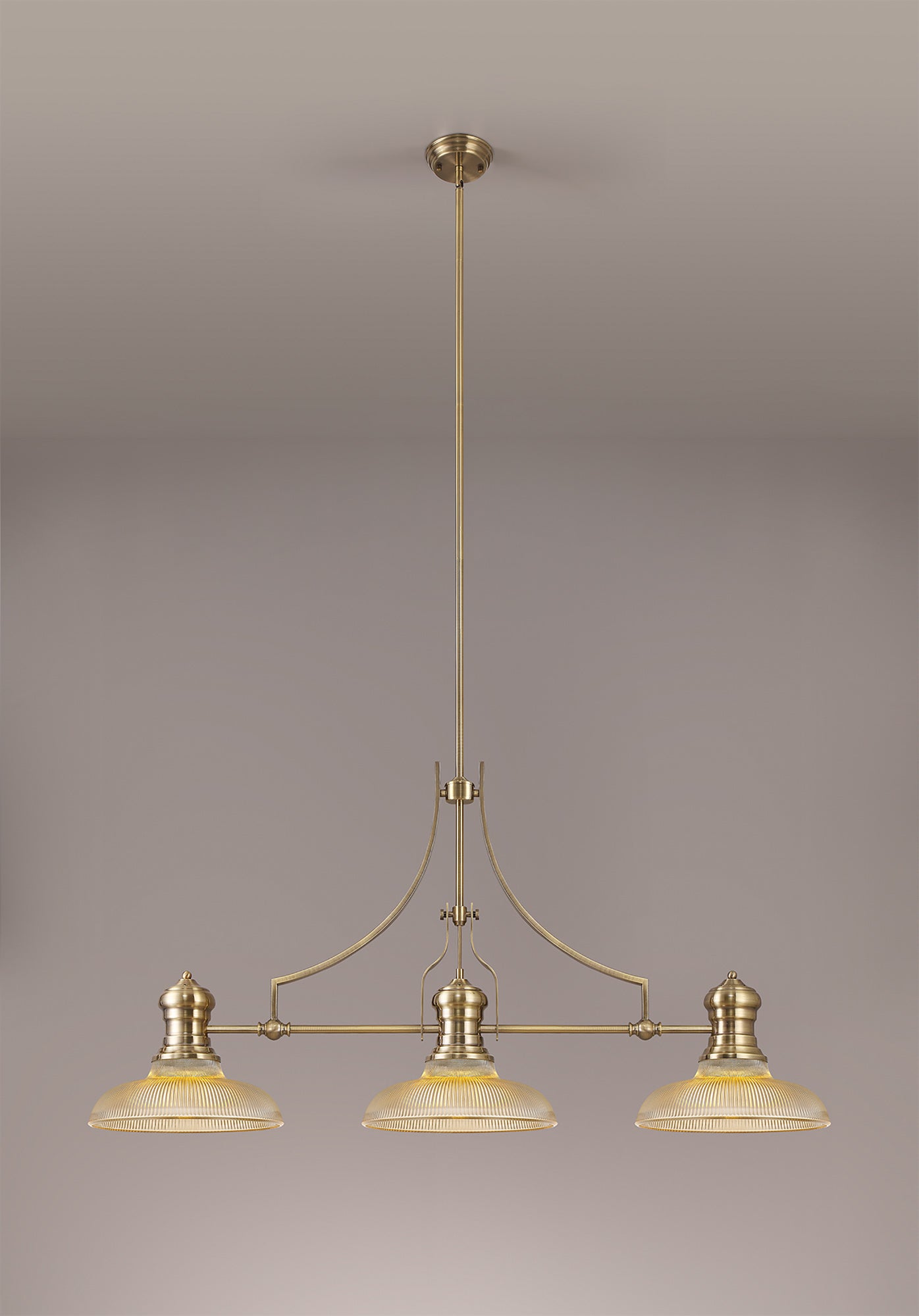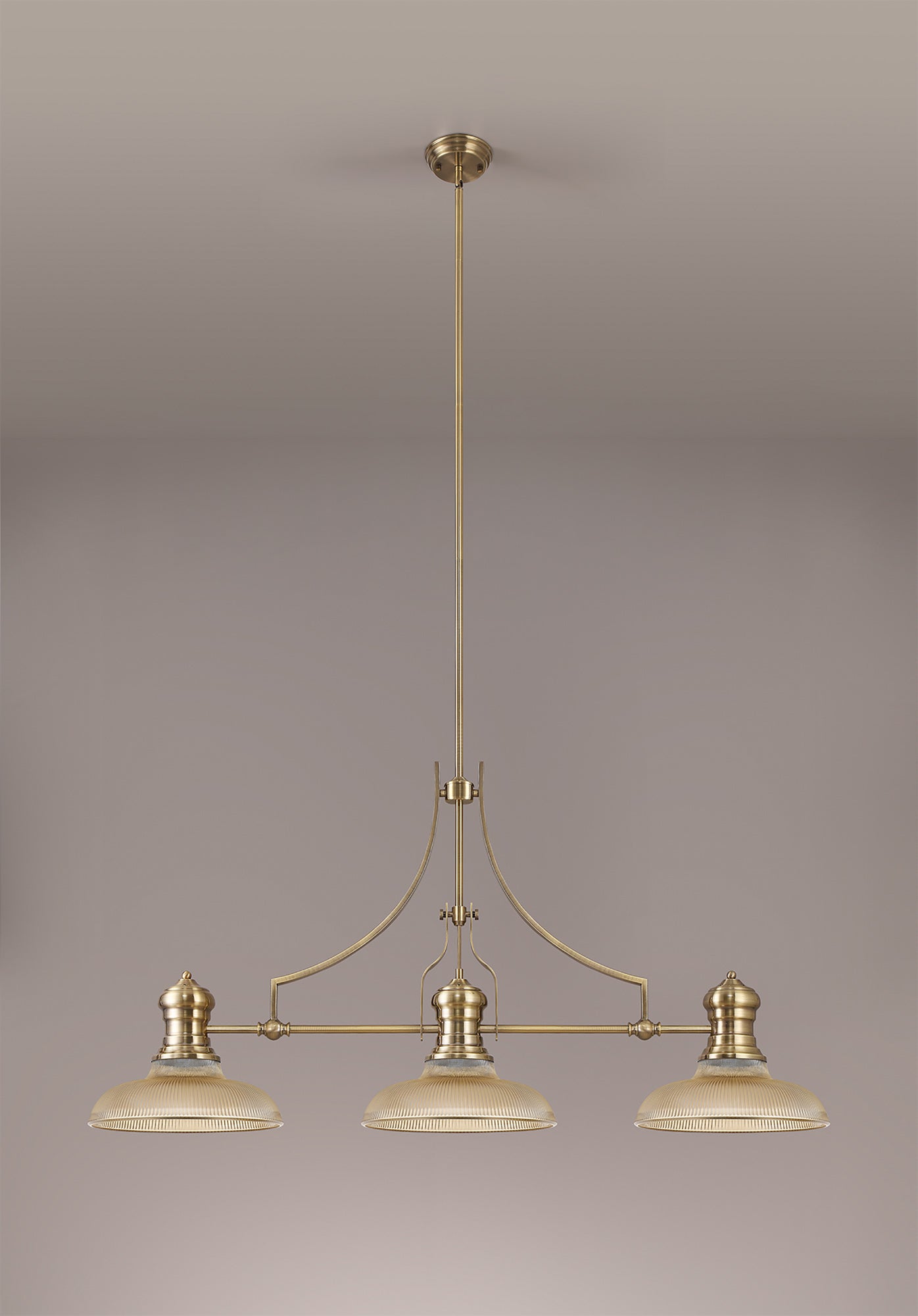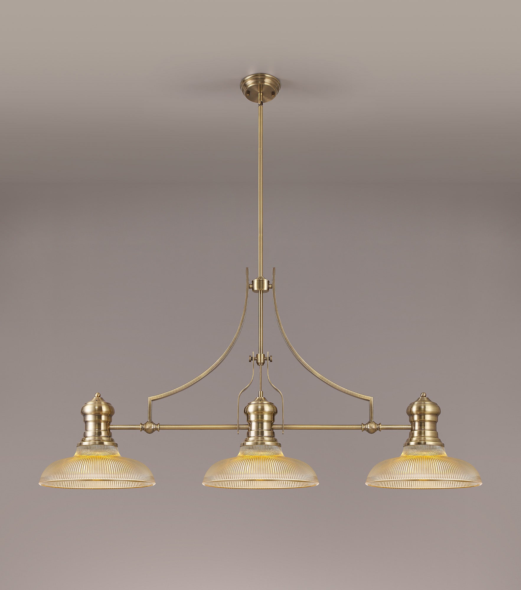 Docker 3 Light Linear Pendant E27 With 30cm Round Glass Shade, Antique Brass, Amber
