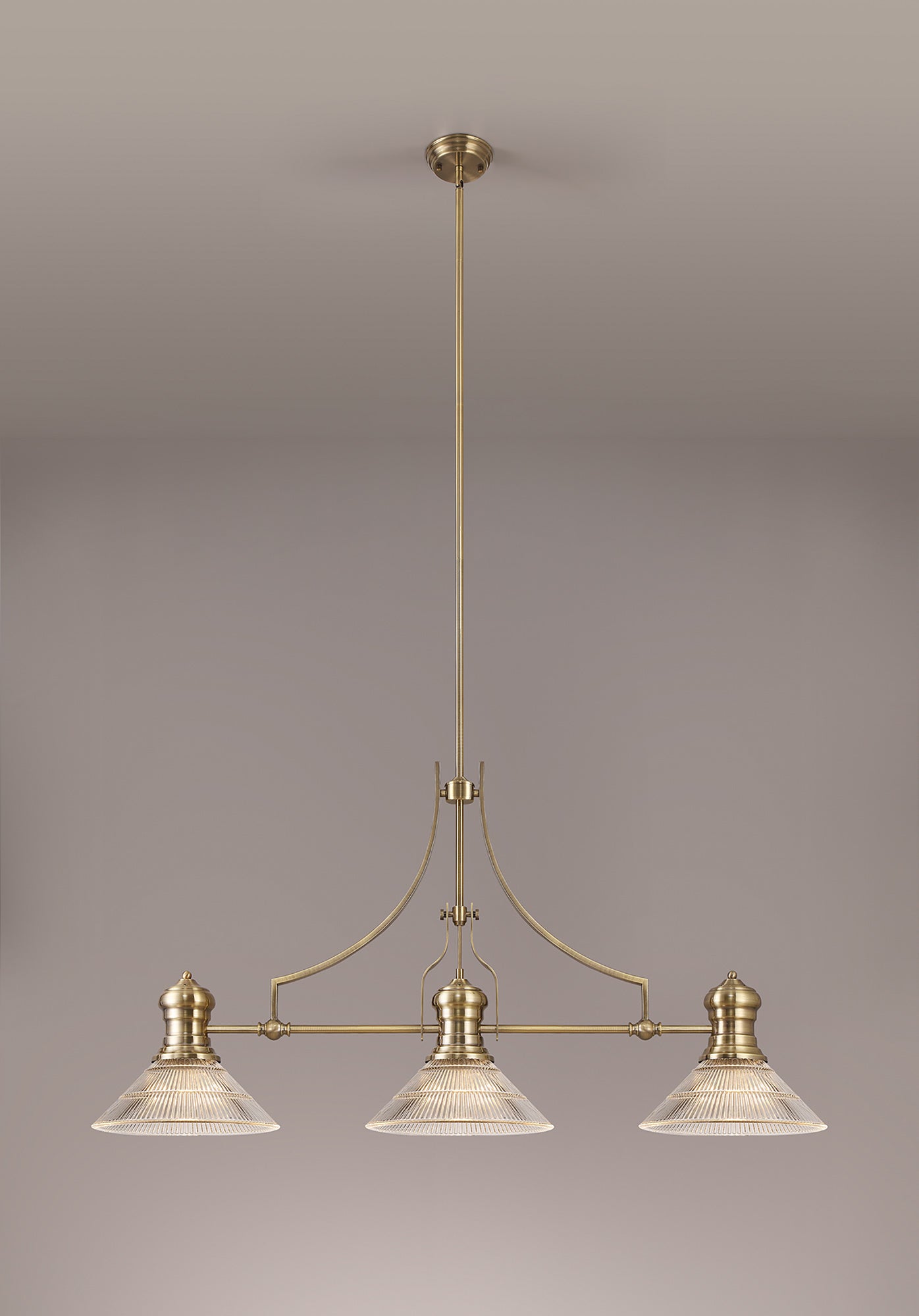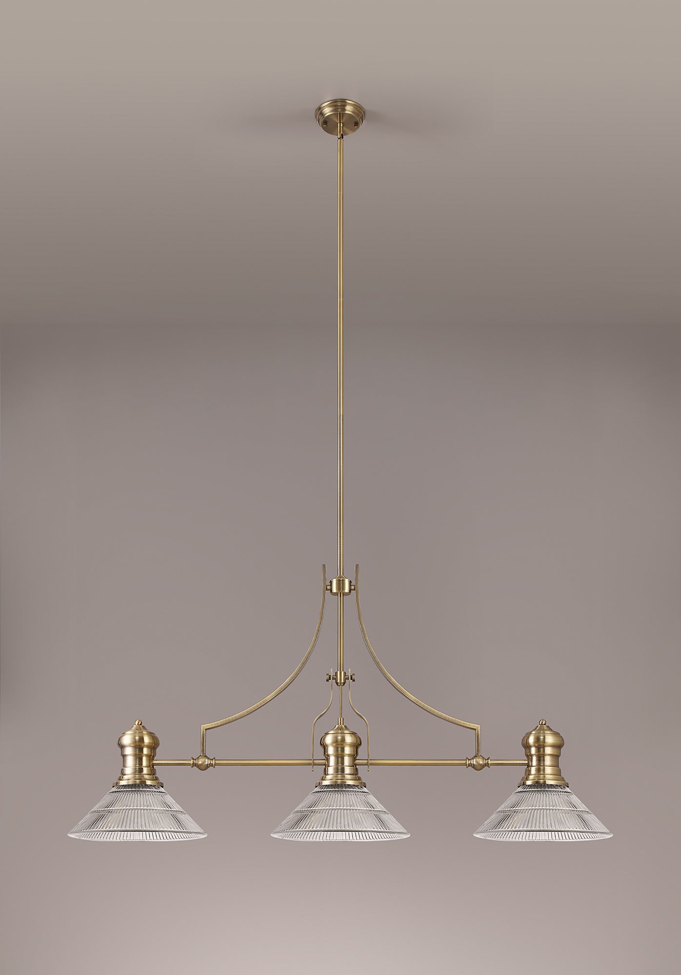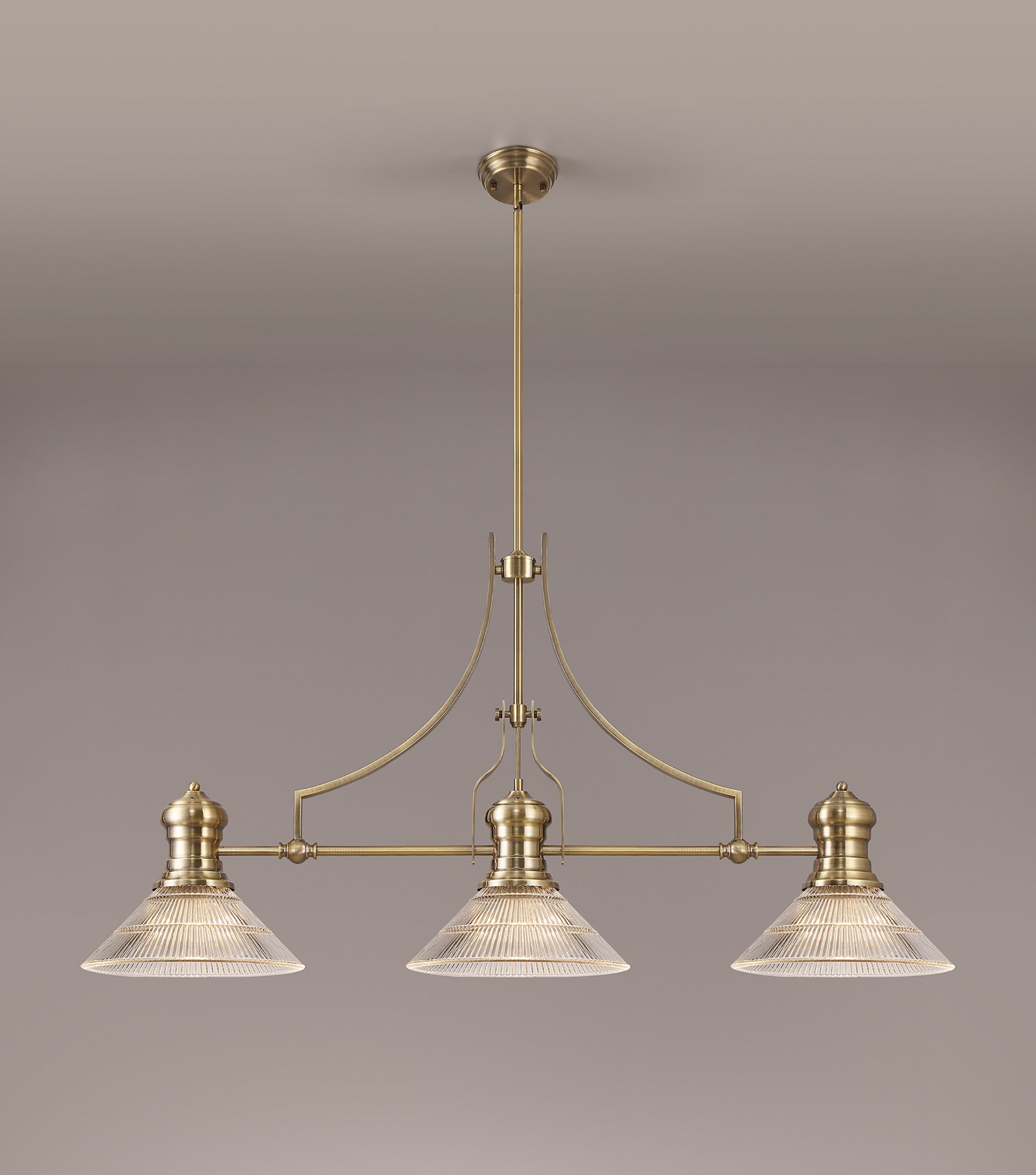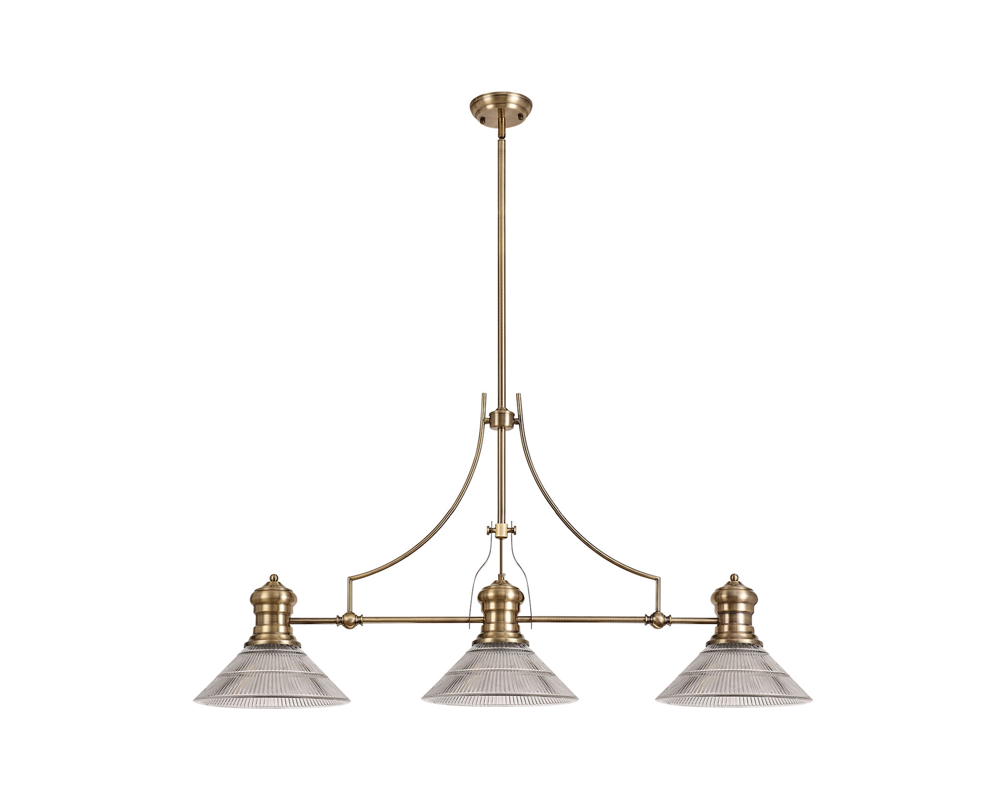 Docker 3 Light Linear Pendant E27 With 30cm Cone Glass Shade, Antique Brass, Clear