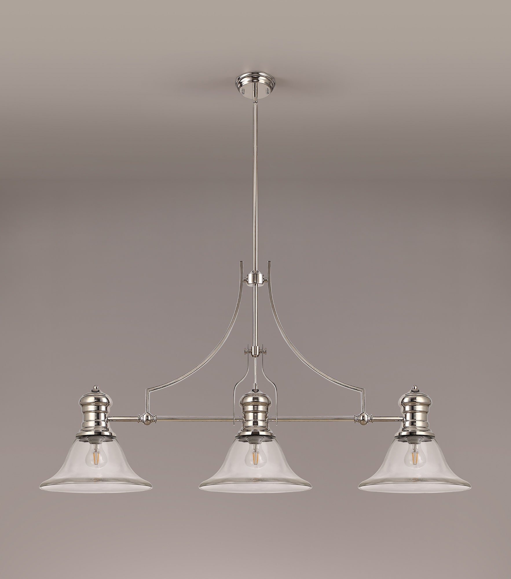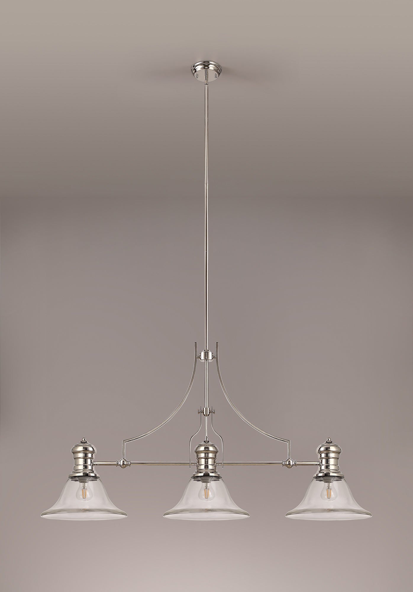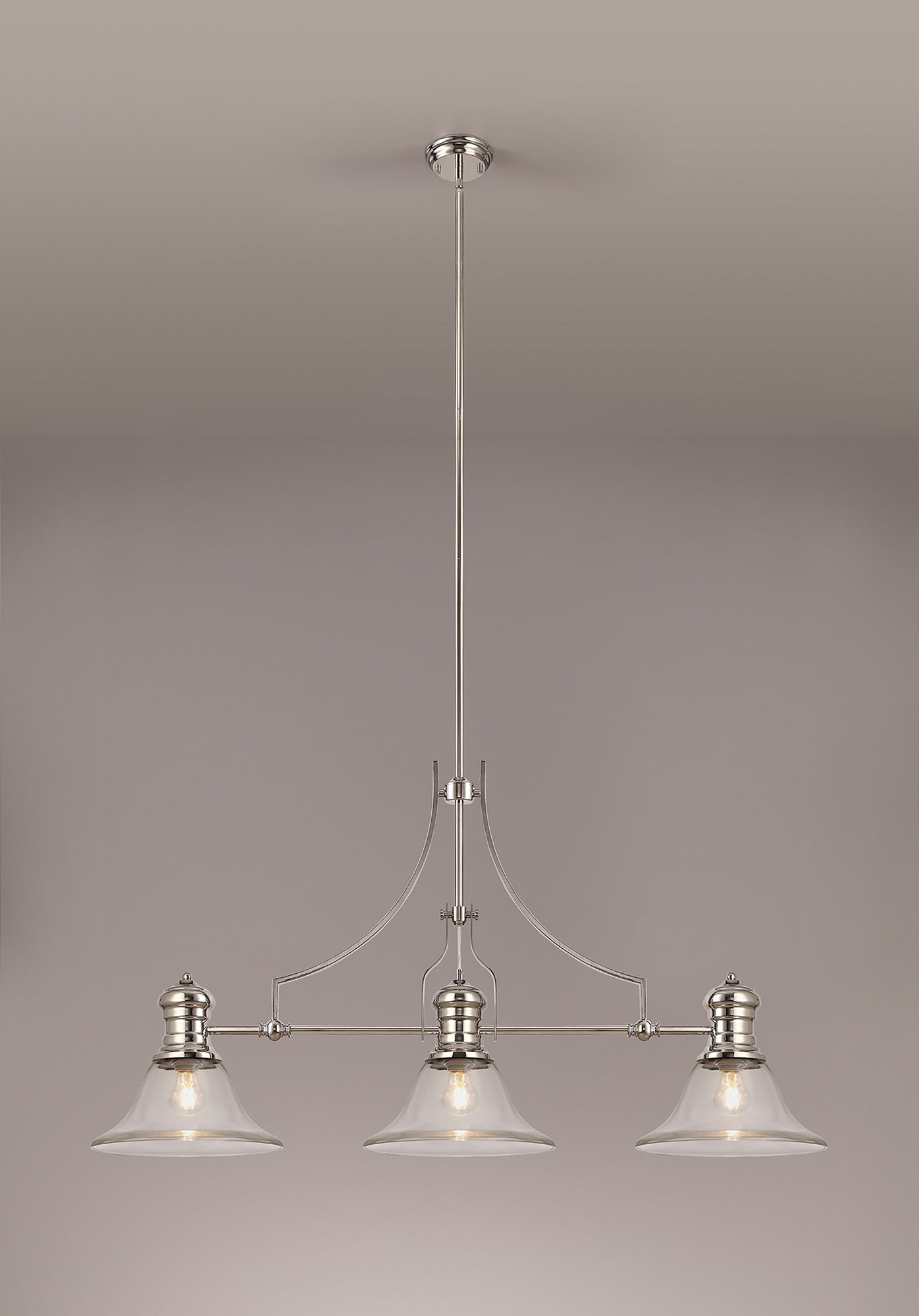 Docker 3 Light Linear Pendant E27 With 30cm Smooth Bell Glass Shade, Polished Nickel, Clear