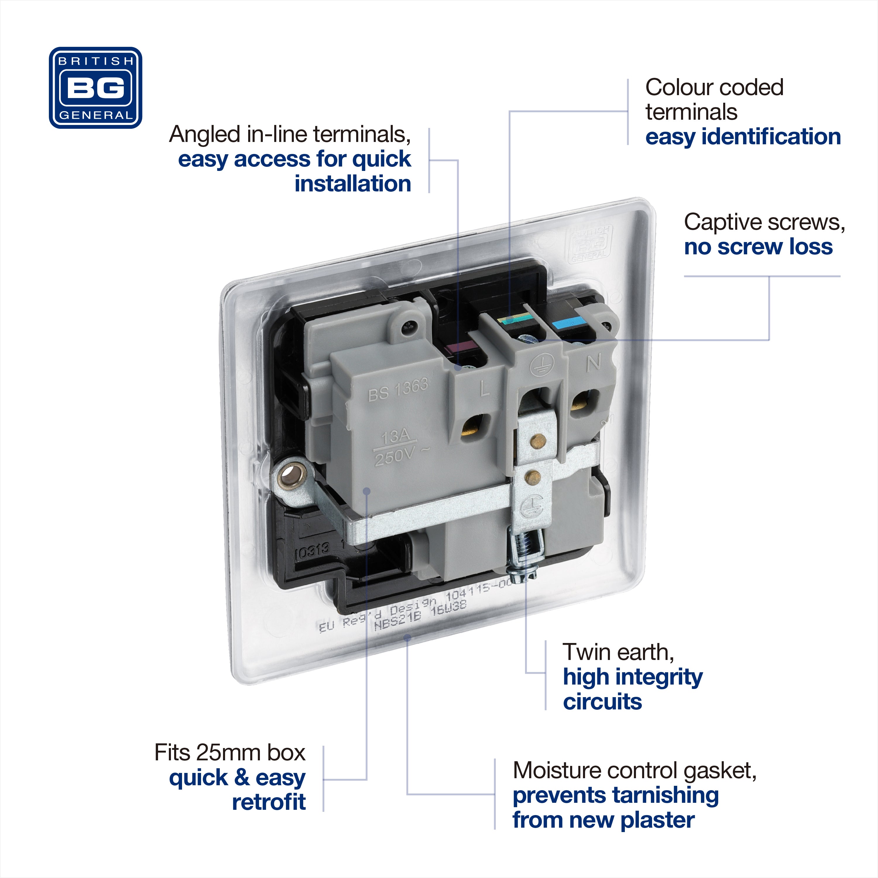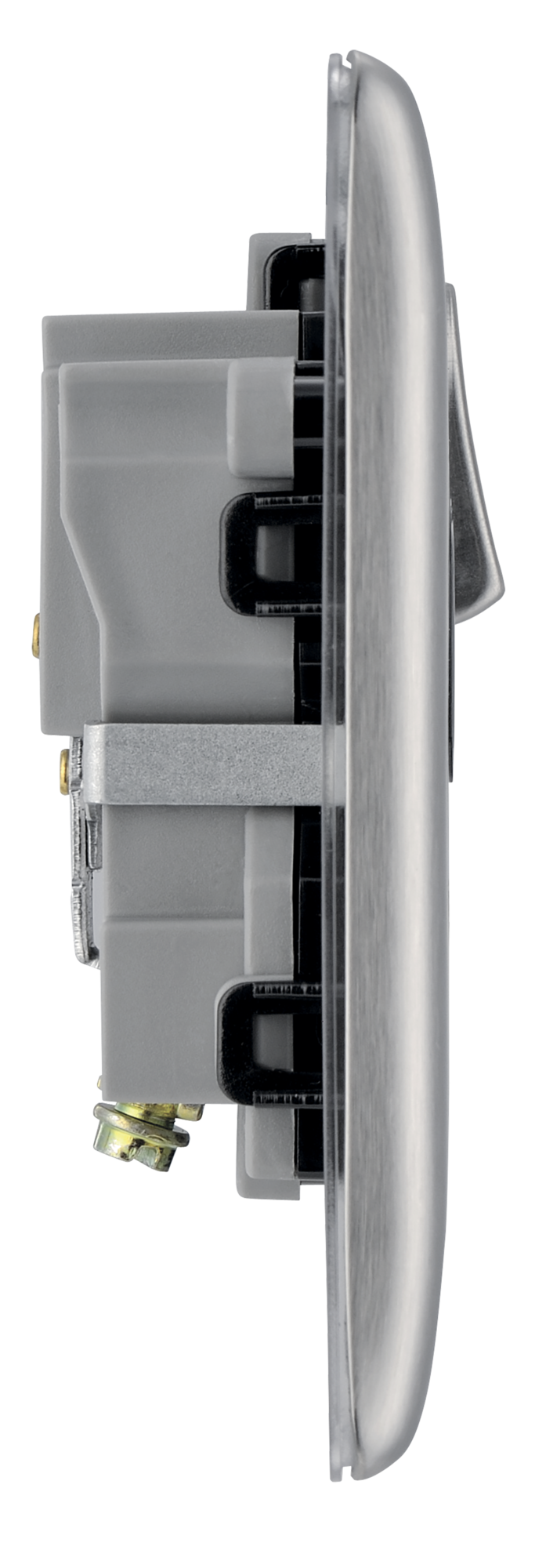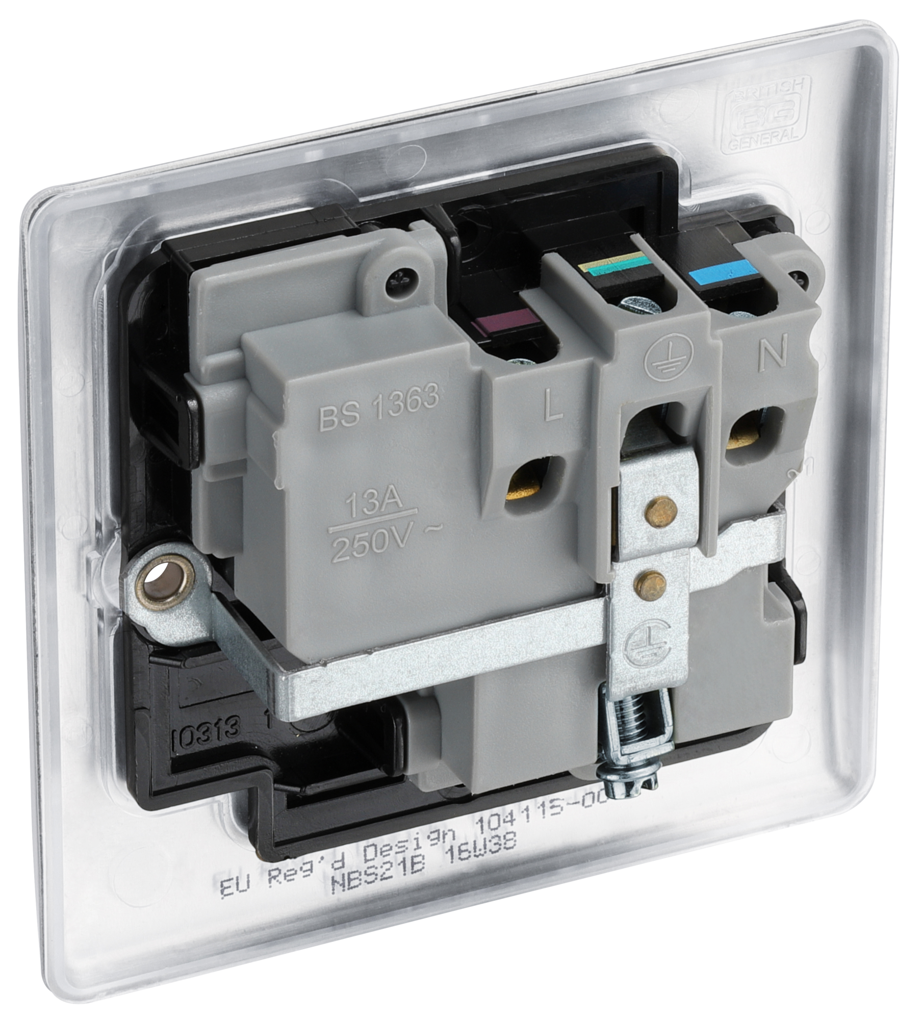 The NBS21B is a 13A single socket from the BG Nexus Metal range, finished in brushed steel with black inserts. This range of switches and sockets has been designed with a modern, slim profile and has a lightly lacquered surface to reduce fingerprint marks. The BG Nexus Metal range of switches and sockets comes with colour coded screws and has a full grid system to match.