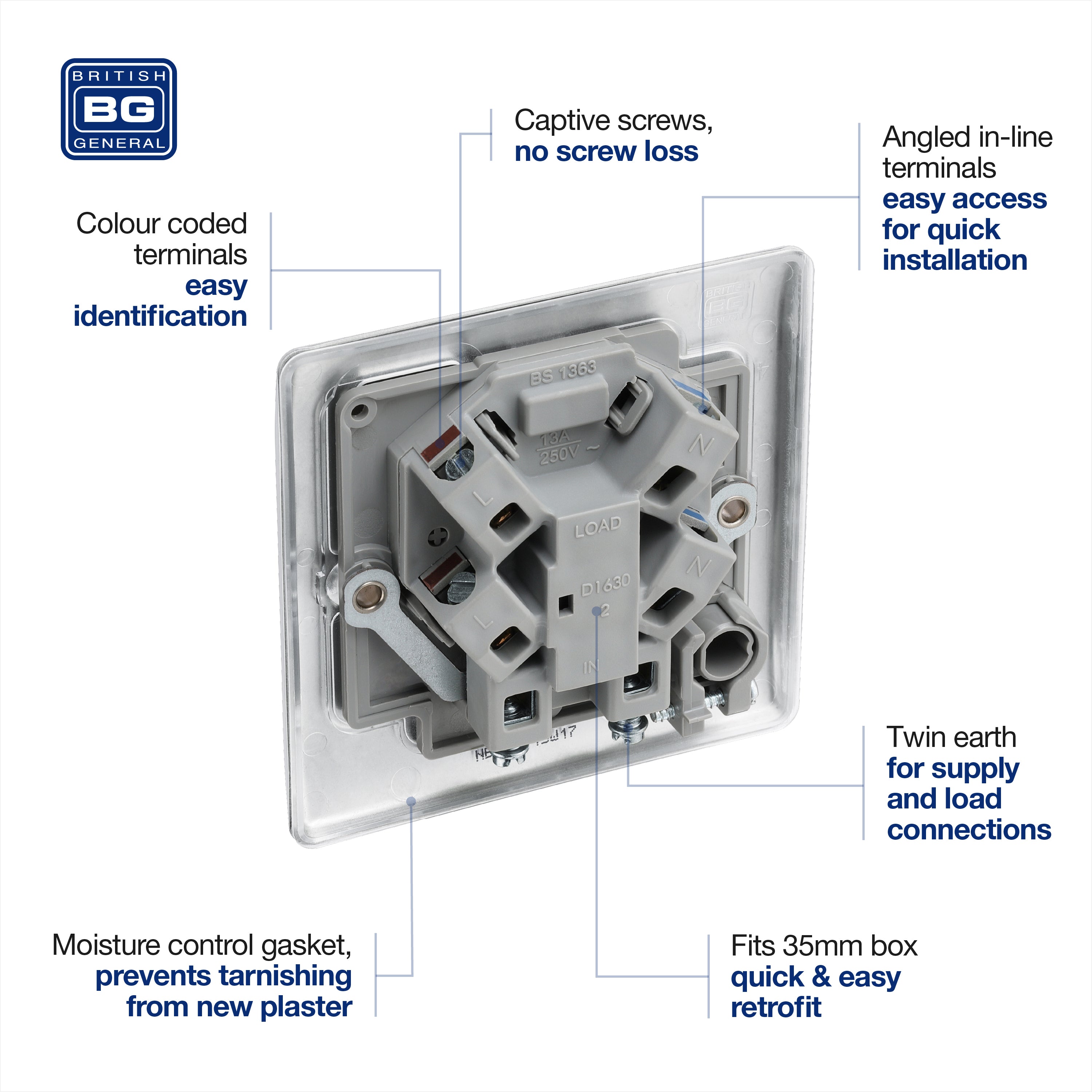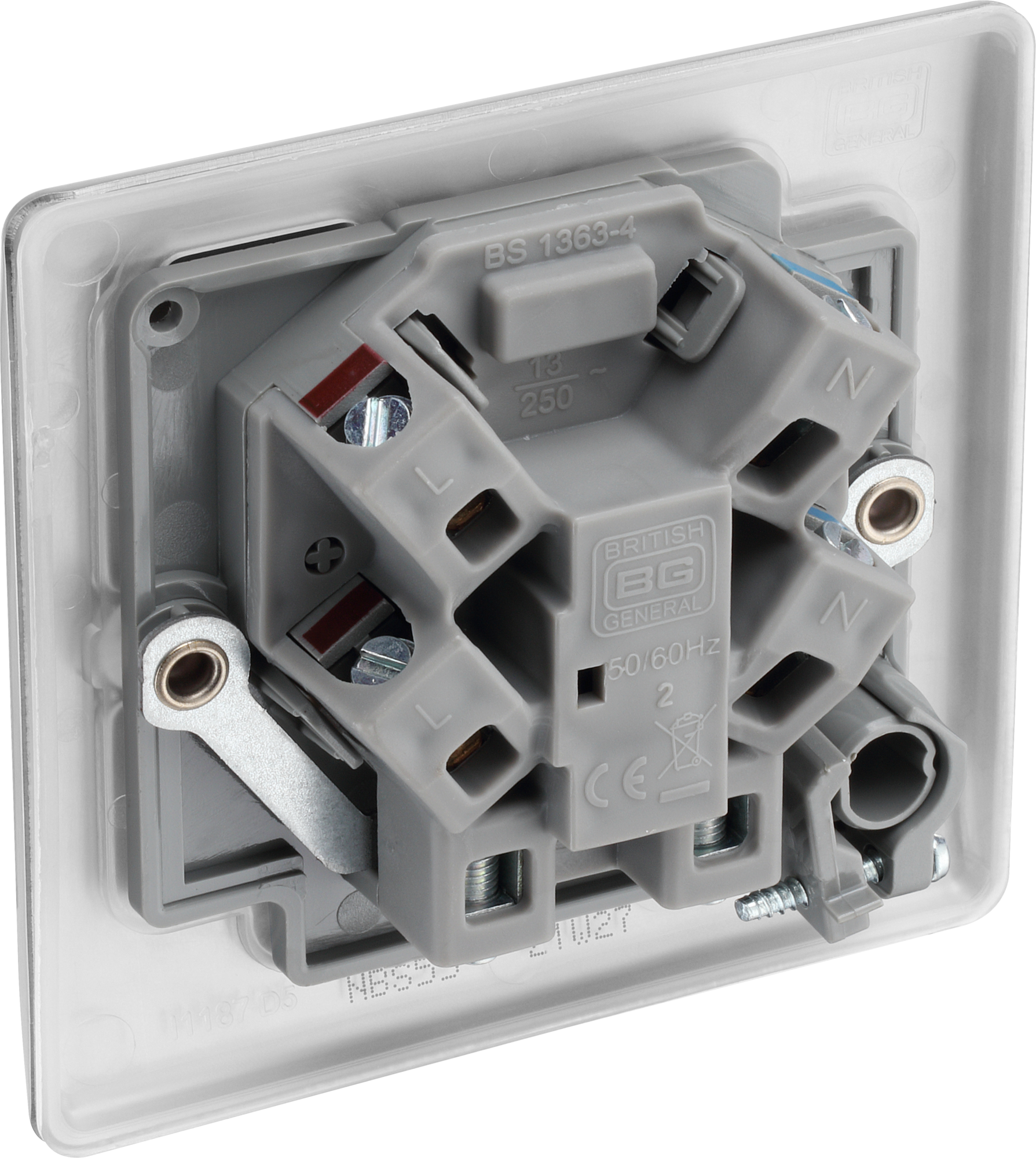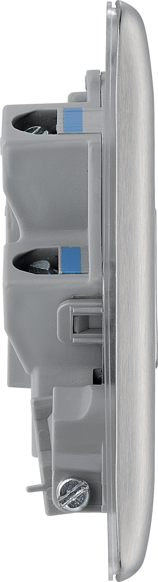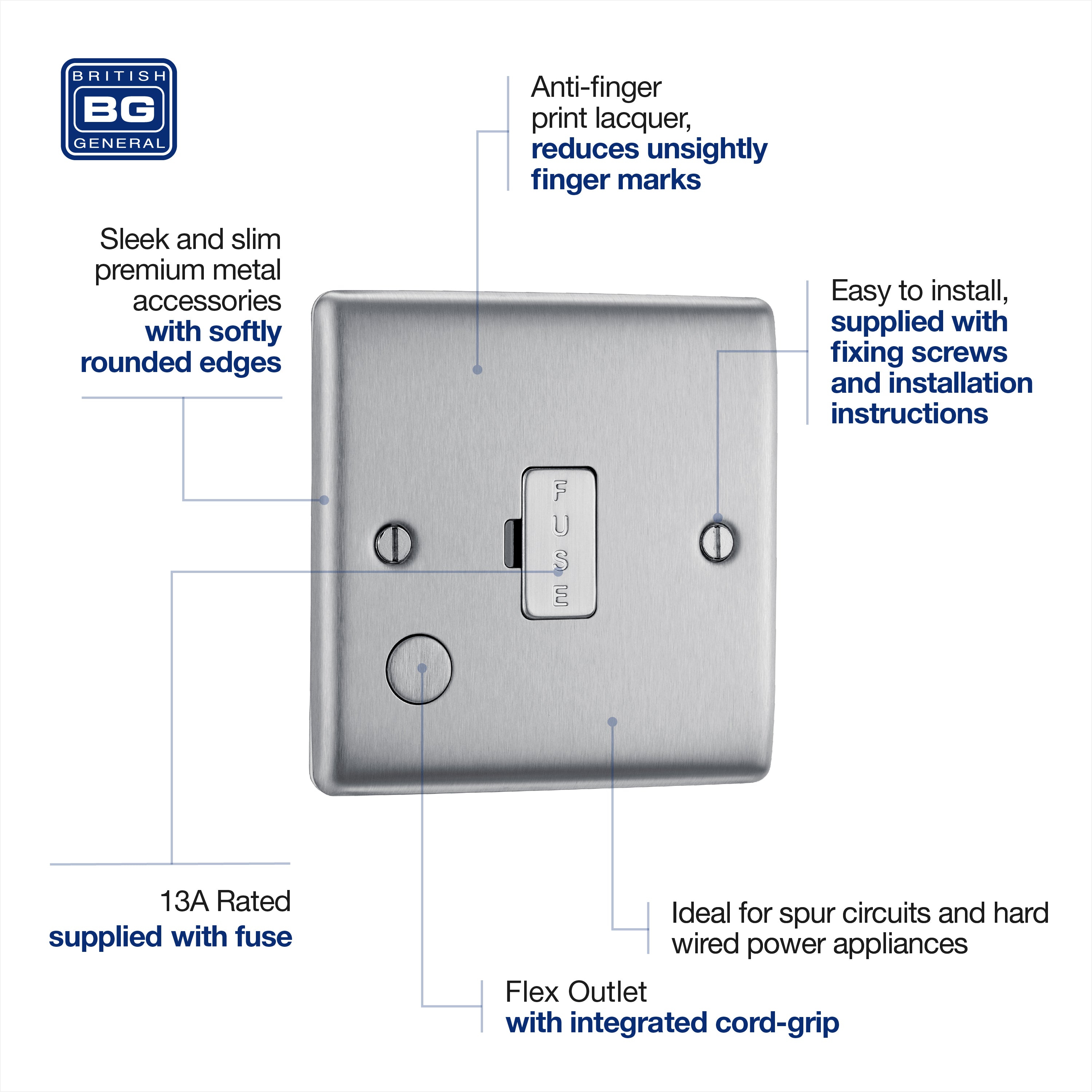 The NBS55 is a 13A unswitched spur with flex from the BG Nexus Metal range, finished in brushed steel. This range of switches and sockets has been designed with a modern, slim profile and has a lightly lacquered surface to reduce fingerprint marks. The BG Nexus Metal range of switches and sockets comes with colour coded screws and has a full grid system to match.