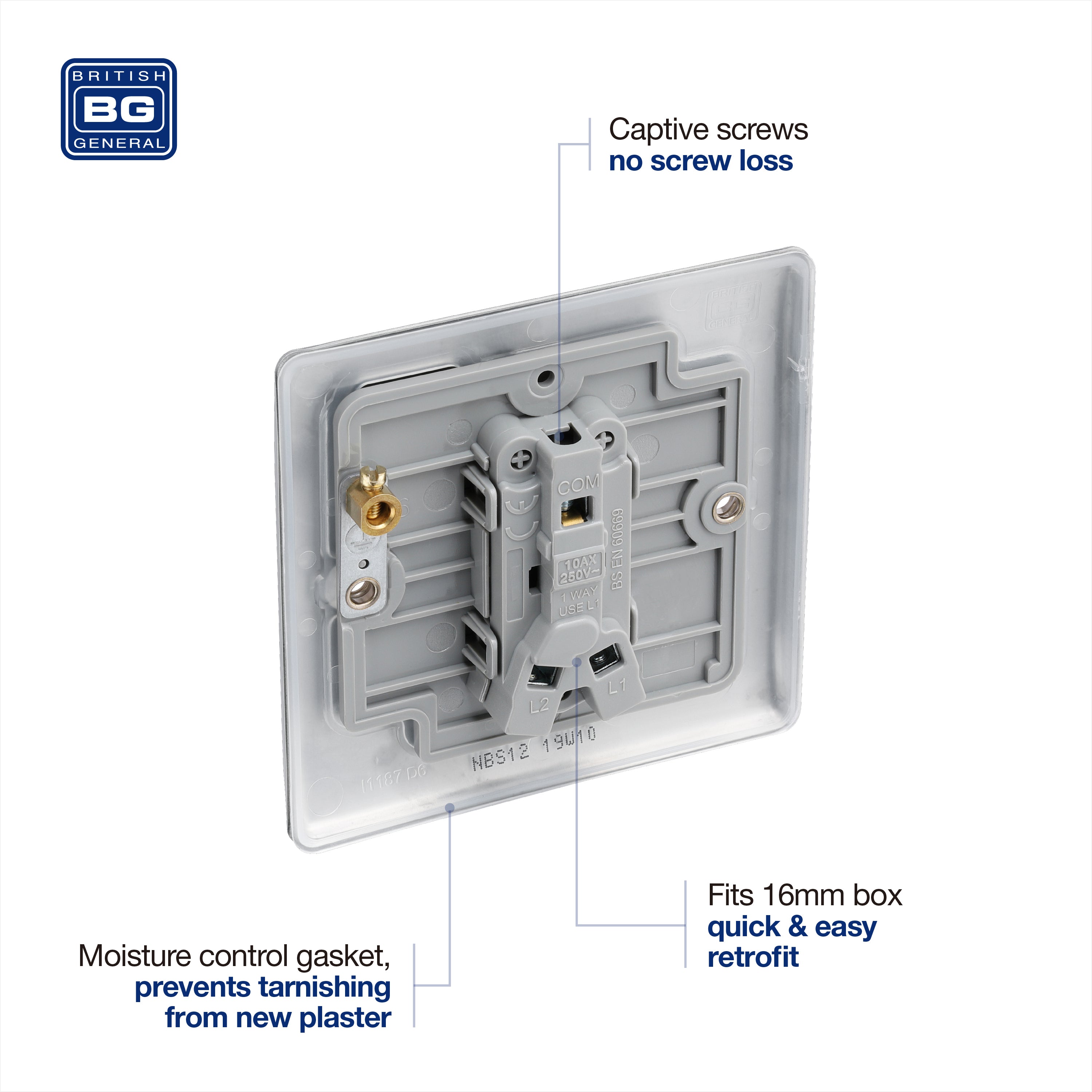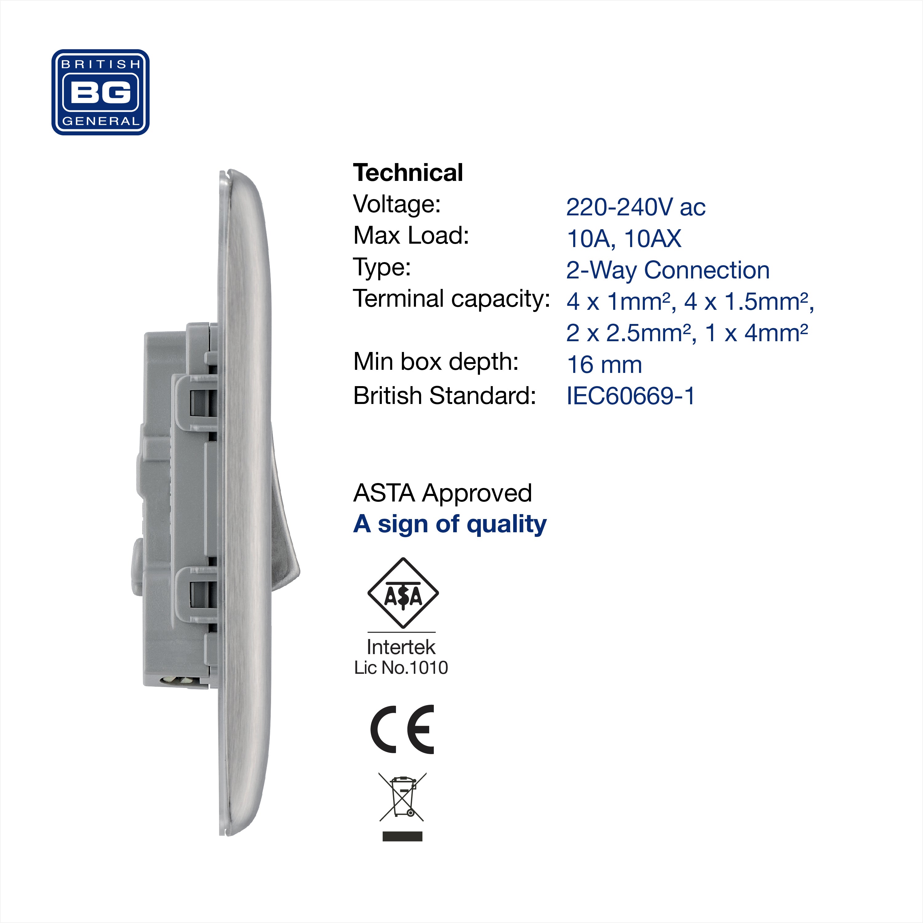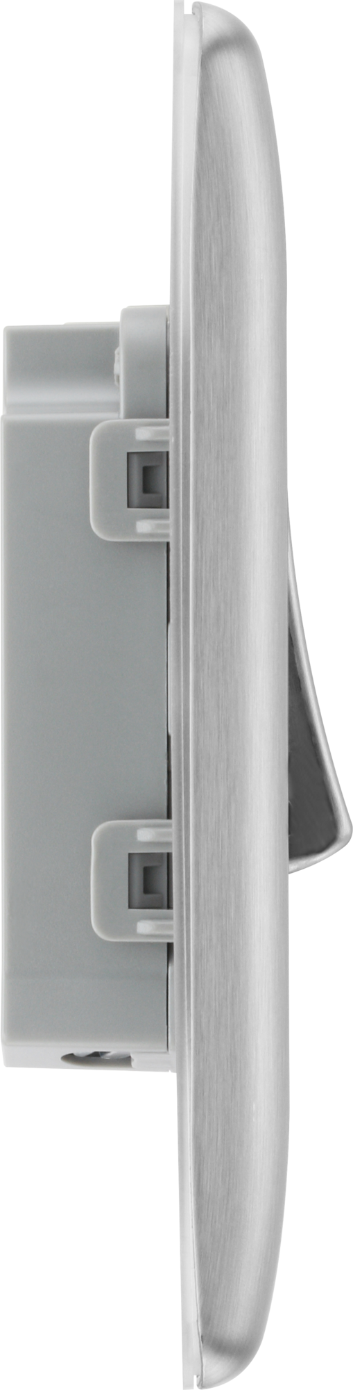 The NBS12 is a 1G 2W light switch from the BG Nexus Metal range, finished in brushed steel. This range of switches and sockets has been designed with a modern, slim profile and has a lightly lacquered surface to reduce fingerprint marks. The BG Nexus Metal range of switches and sockets comes with colour coded screws and has a full grid system to match.