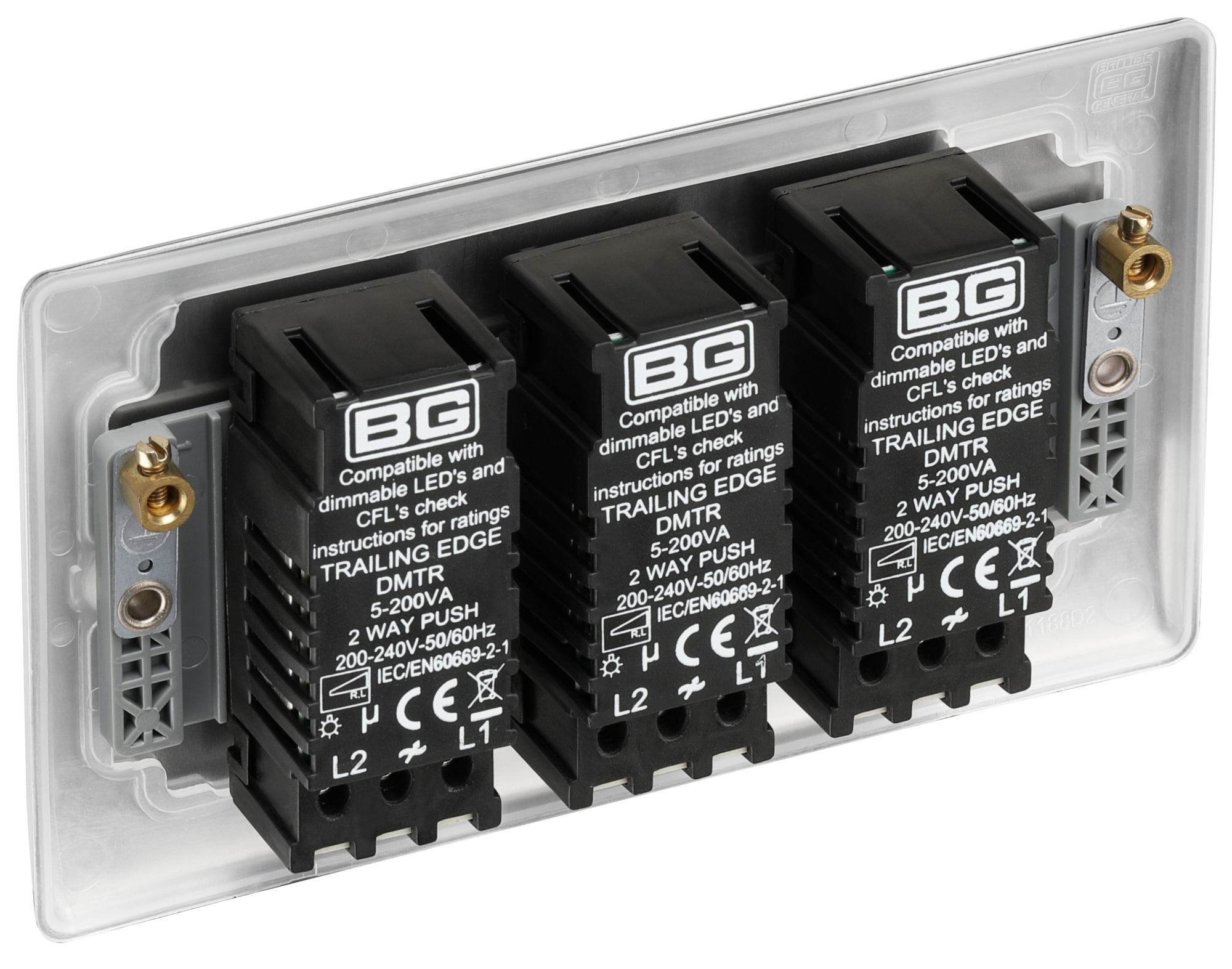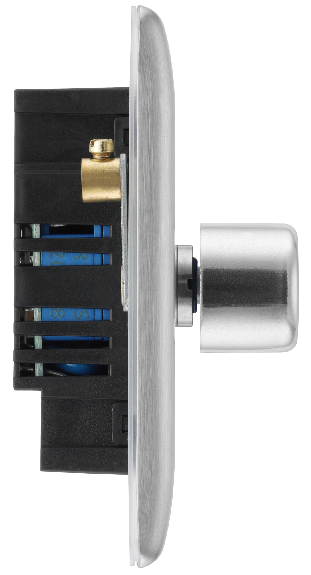 The NBS83 is a 3G dimmer switch from the BG Nexus Metal range, finished in brushed steel. This range of switches and sockets has been designed with a modern, slim profile and has a lightly lacquered surface to reduce fingerprint marks. The BG Nexus Metal range of switches and sockets comes with colour coded screws and has a full grid system to match.