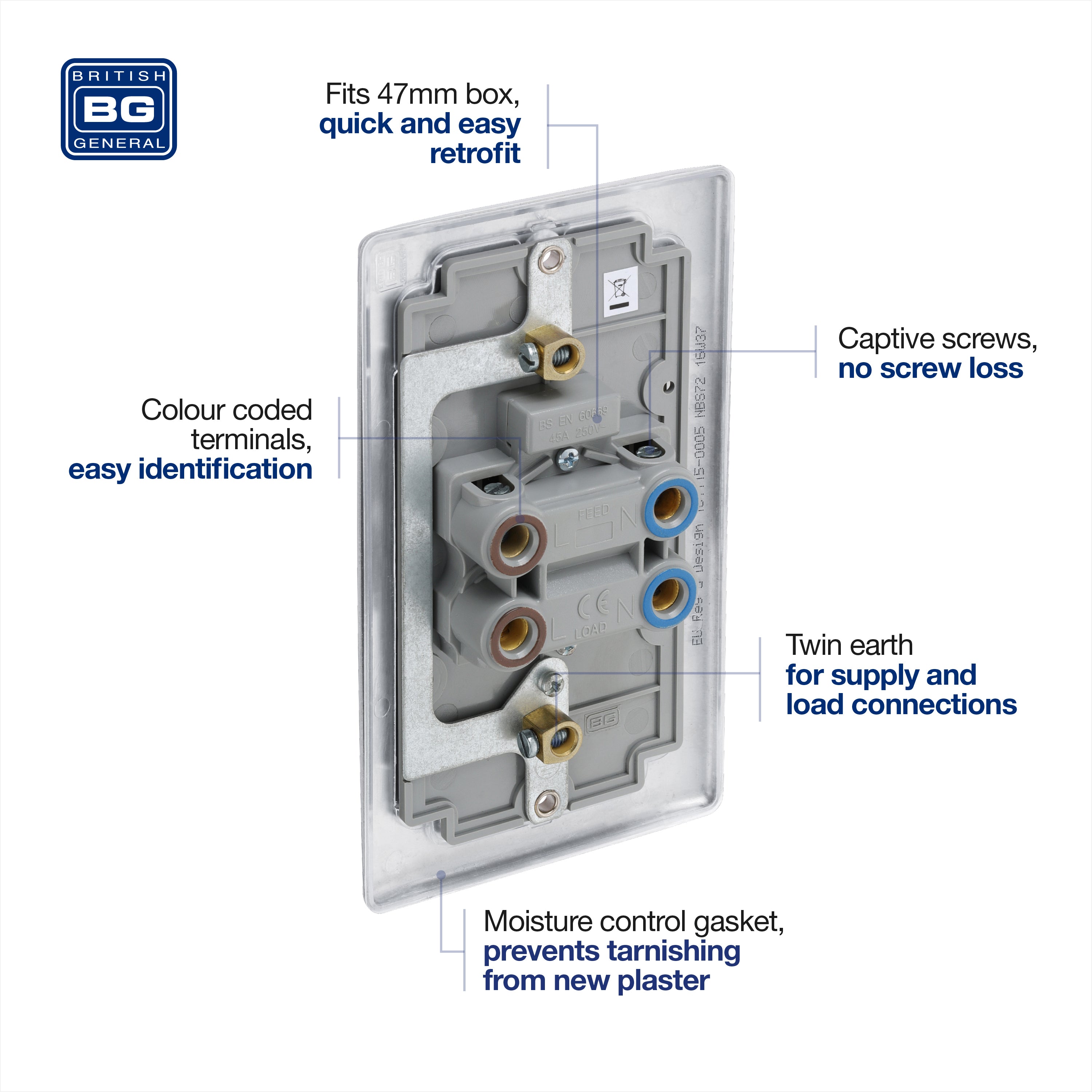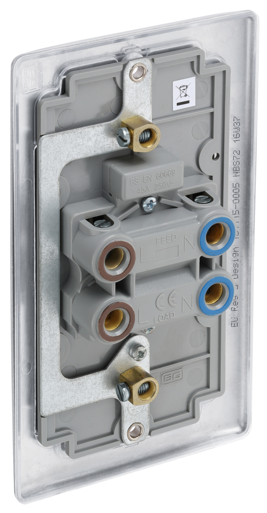 The NBS72 is a 45A cooker switch from the BG Nexus Metal range, finished in brushed steel. This range of switches and sockets has been designed with a modern, slim profile and has a lightly lacquered surface to reduce fingerprint marks. The BG Nexus Metal range of switches and sockets comes with colour coded screws and has a full grid system to match.