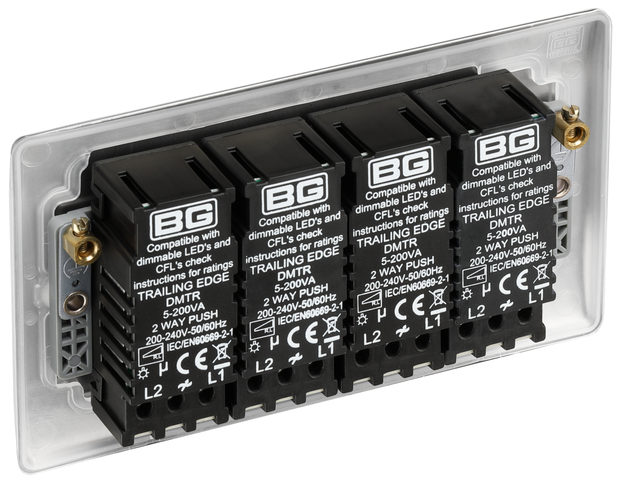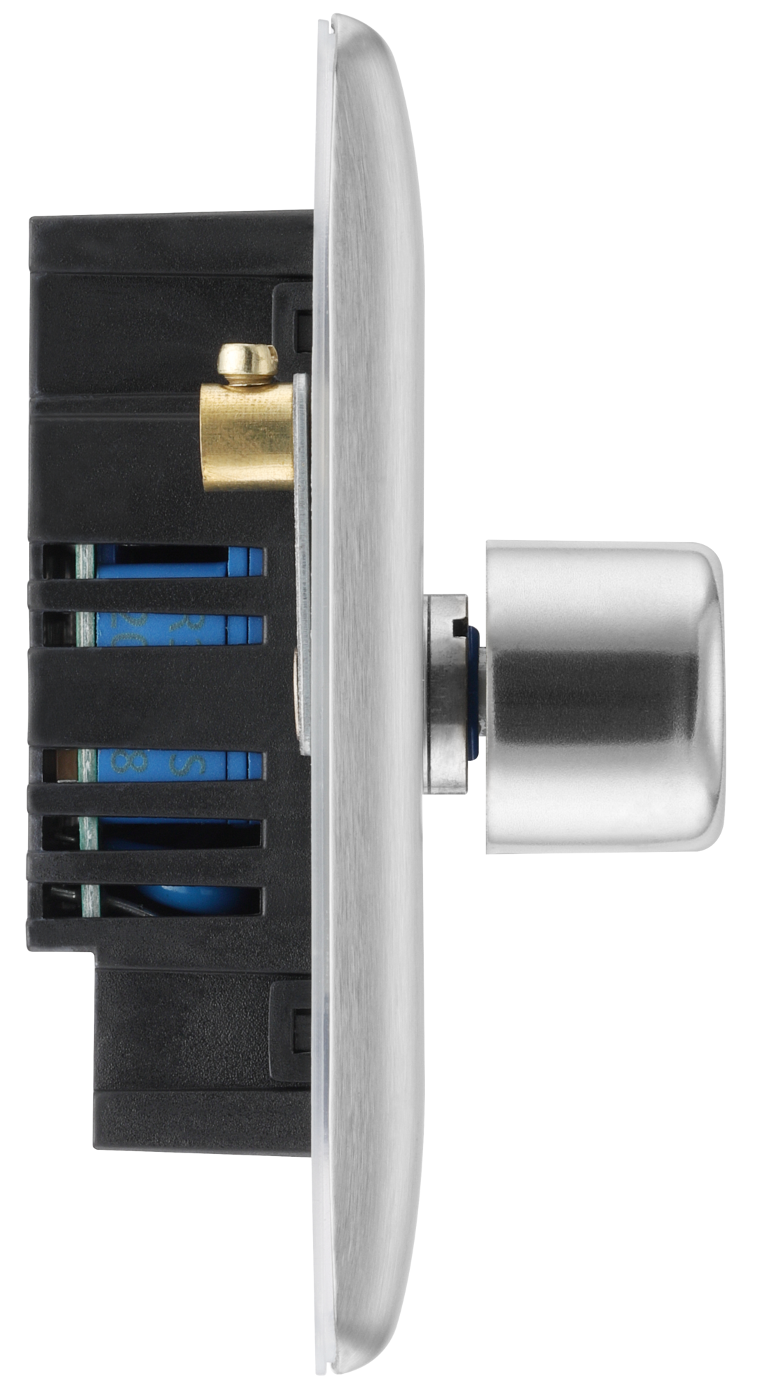 The NBS84 is a 4G dimmer switch from the BG Nexus Metal range, finished in brushed steel. This range of switches and sockets has been designed with a modern, slim profile and has a lightly lacquered surface to reduce fingerprint marks. The BG Nexus Metal range of switches and sockets comes with colour coded screws and has a full grid system to match.