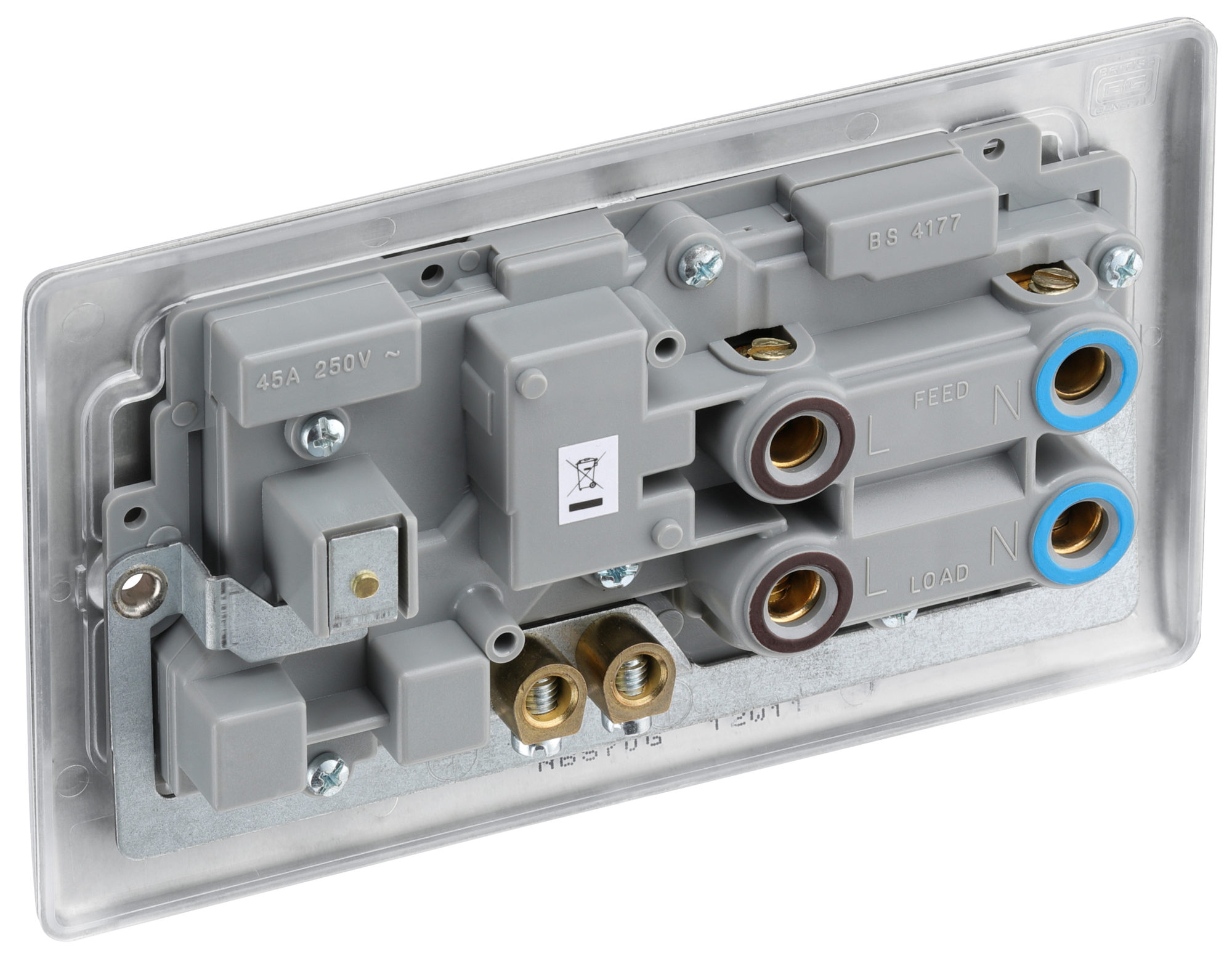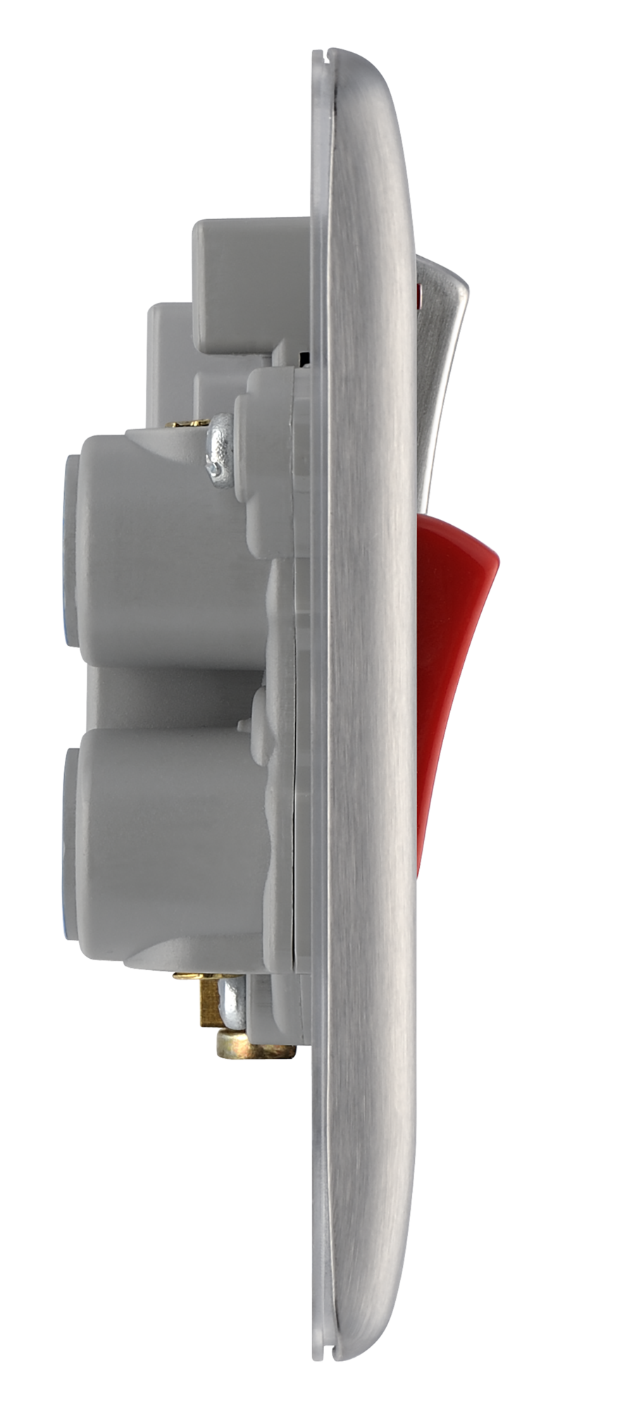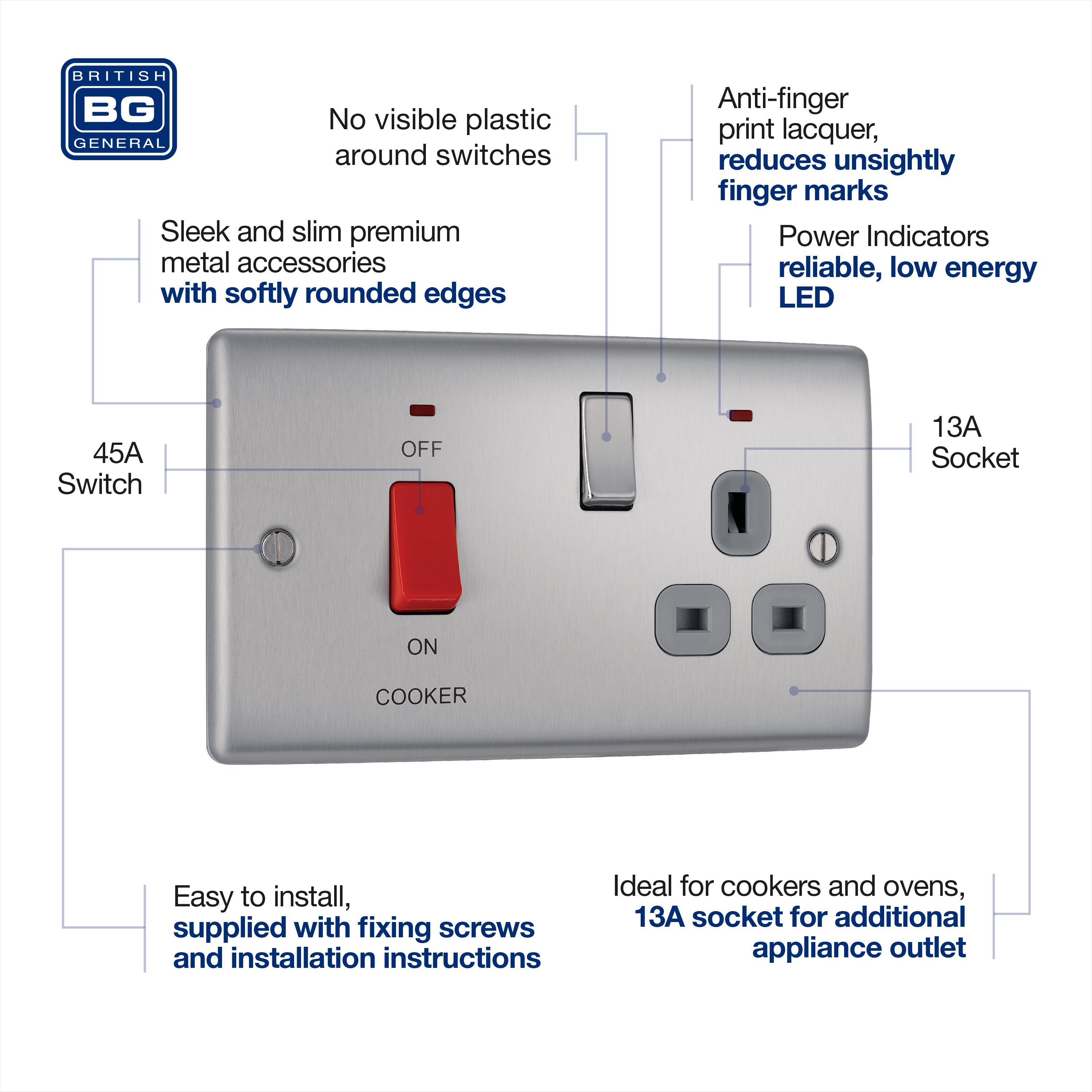 The NBS70G is a cooker switch with 13A socket from the BG Nexus Metal range, finished in brushed steel with grey inserts. This range of switches and sockets has been designed with a modern, slim profile and has a lightly lacquered surface to reduce fingerprint marks. The BG Nexus Metal range of switches and sockets comes with colour coded screws and has a full grid system to match.