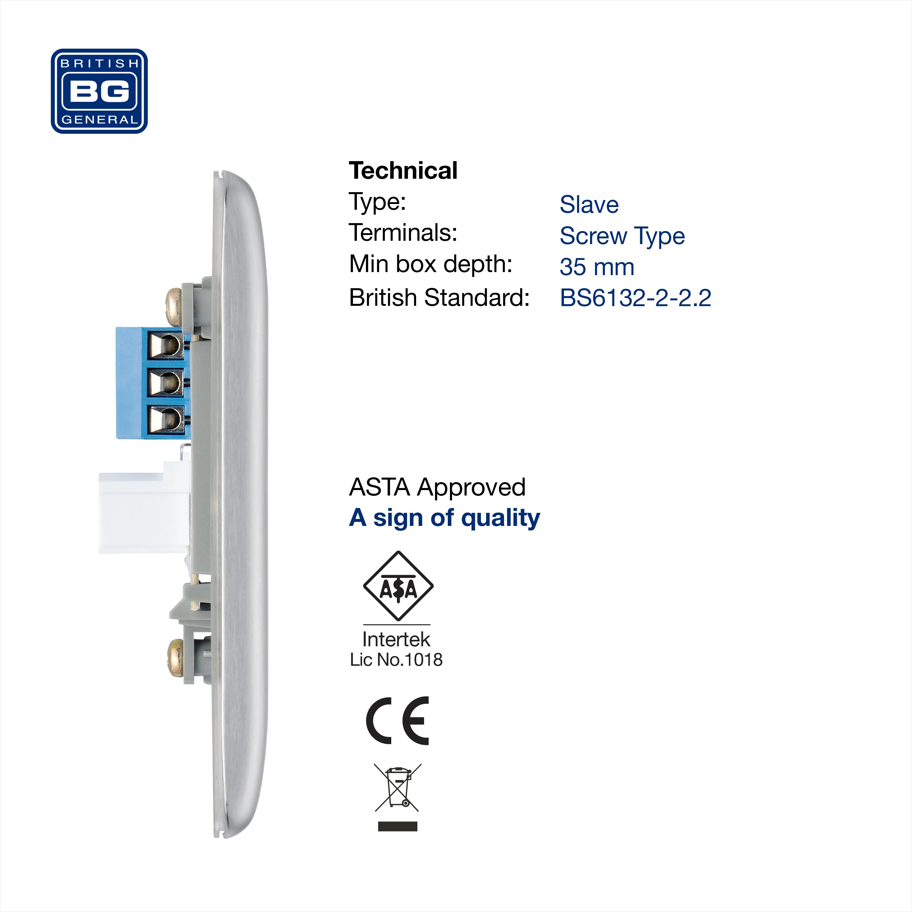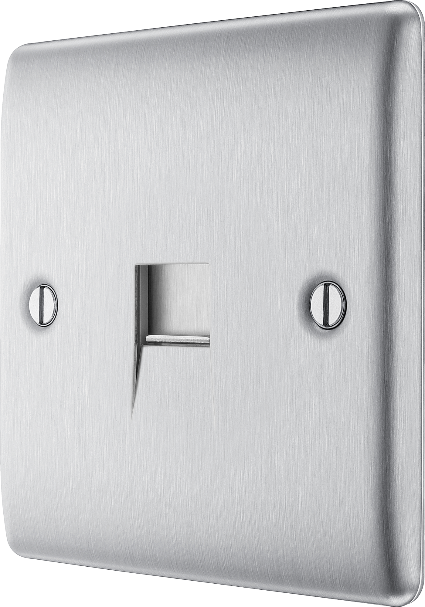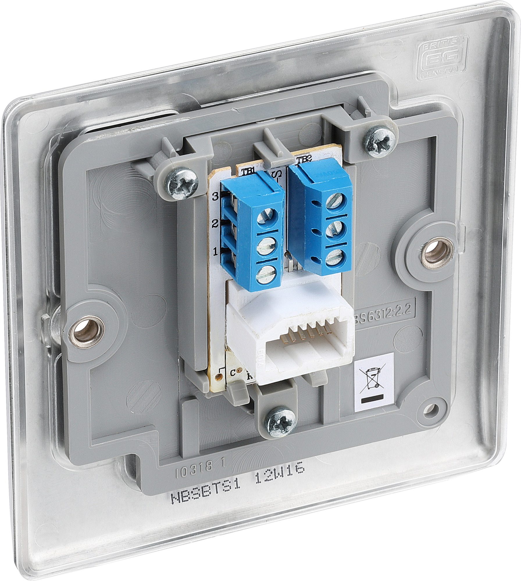 The NBSBTS1 is a secondary telephone socket from the BG Nexus Metal range, finished in brushed steel. This range of switches and sockets has been designed with a modern, slim profile and has a lightly lacquered surface to reduce fingerprint marks. The BG Nexus Metal range of switches and sockets comes with colour coded screws and has a full grid system to match.