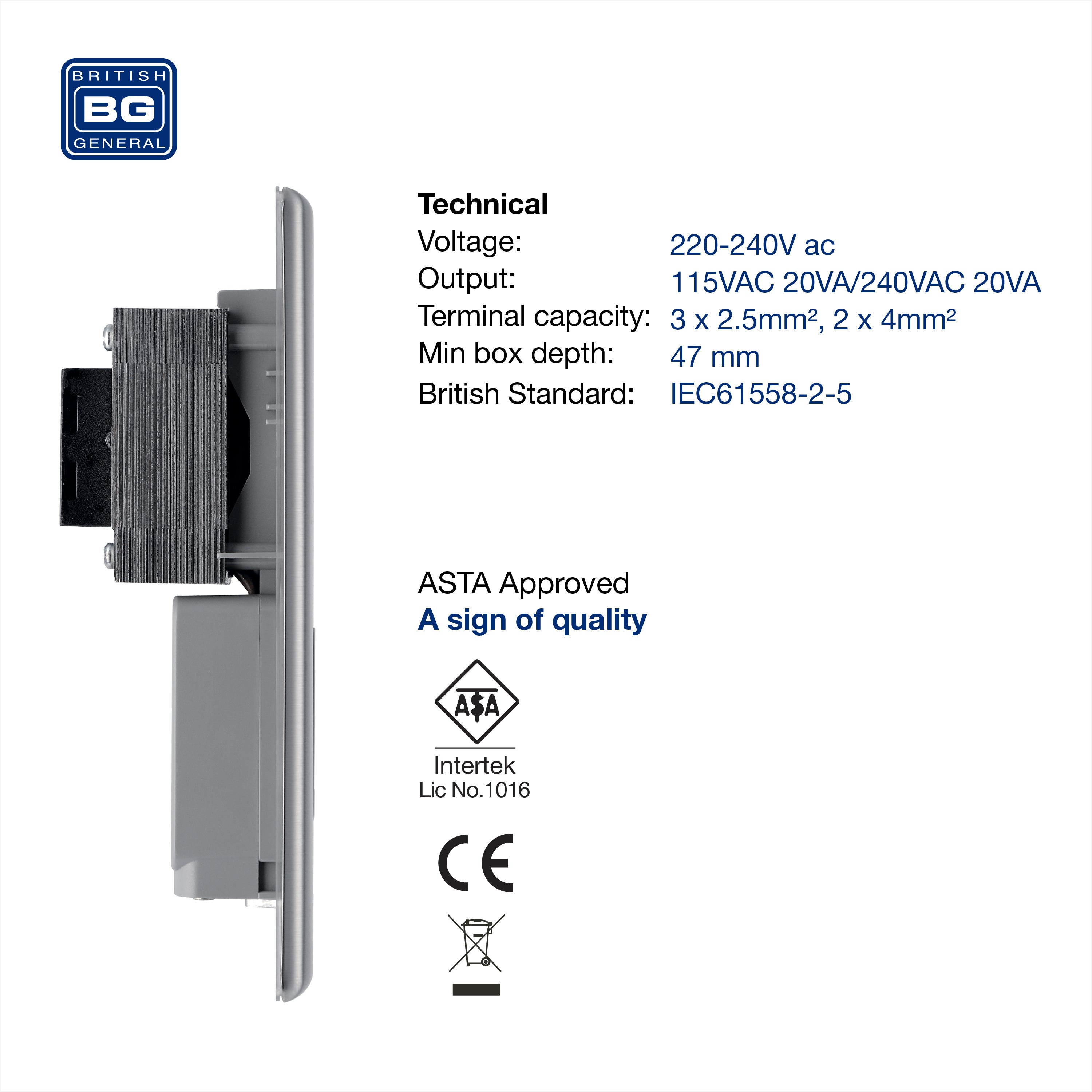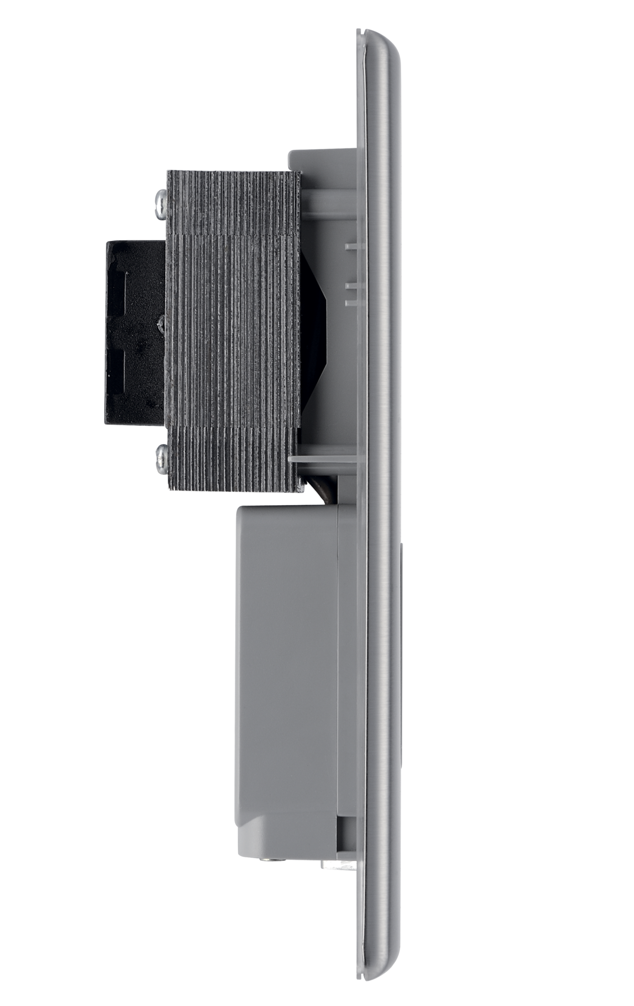 The NBS20G is a shaver socket from the BG Nexus Metal range, finished in brushed steel with grey inserts. This range of switches and sockets has been designed with a modern, slim profile and has a lightly lacquered surface to reduce fingerprint marks. The BG Nexus Metal range of switches and sockets comes with colour coded screws and has a full grid system to match.