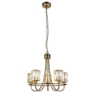 Sophisticated 5 light pendant with decorative clear cut faceted glass shades that beautifully disperse the light. Elegant arms in an antique brass plate finish; perfect for hanging in any living space. Other matching items available.
