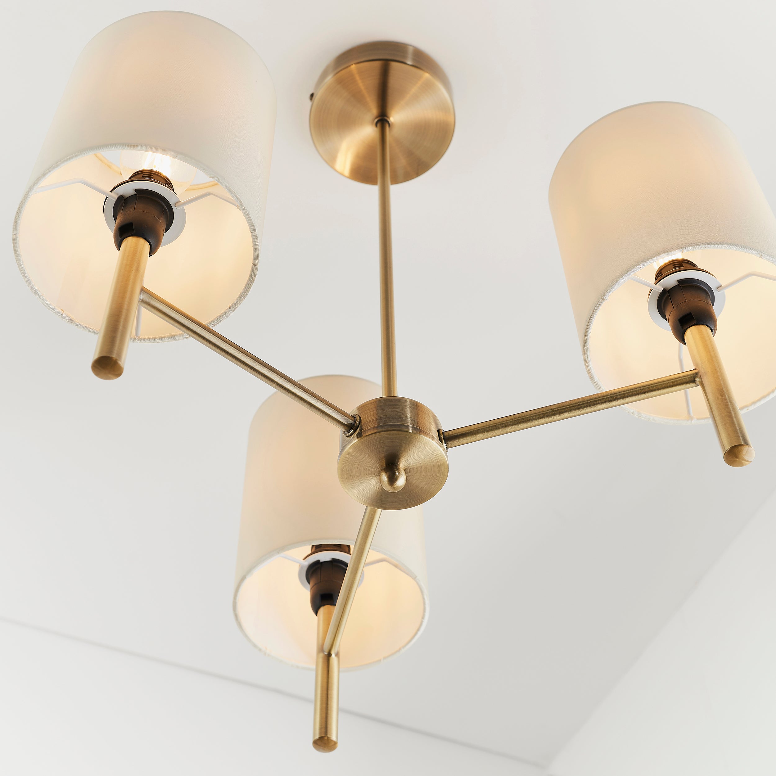 This 3 light ceiling fitting has an antique brass finish and is complemented with 3 cream faux silk shades. suitable for use with LED lamps and dimmable. Matching items and other colour options available