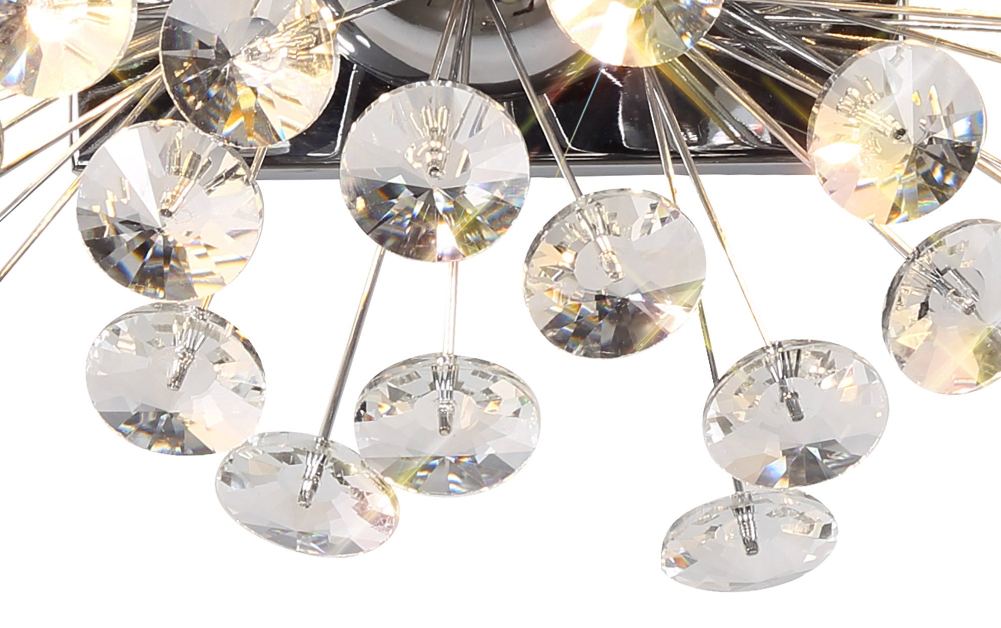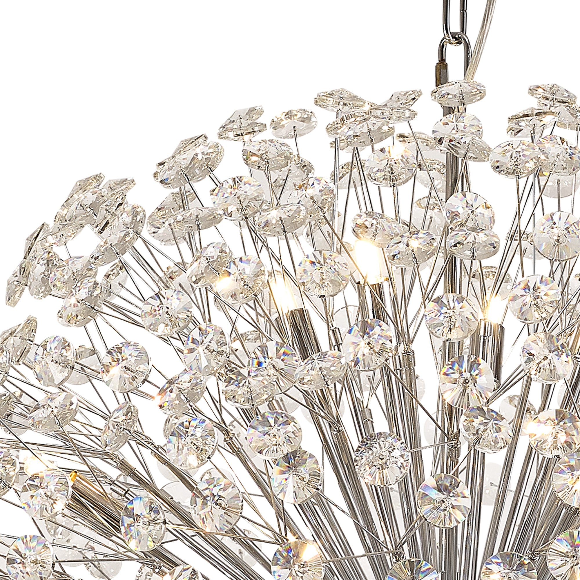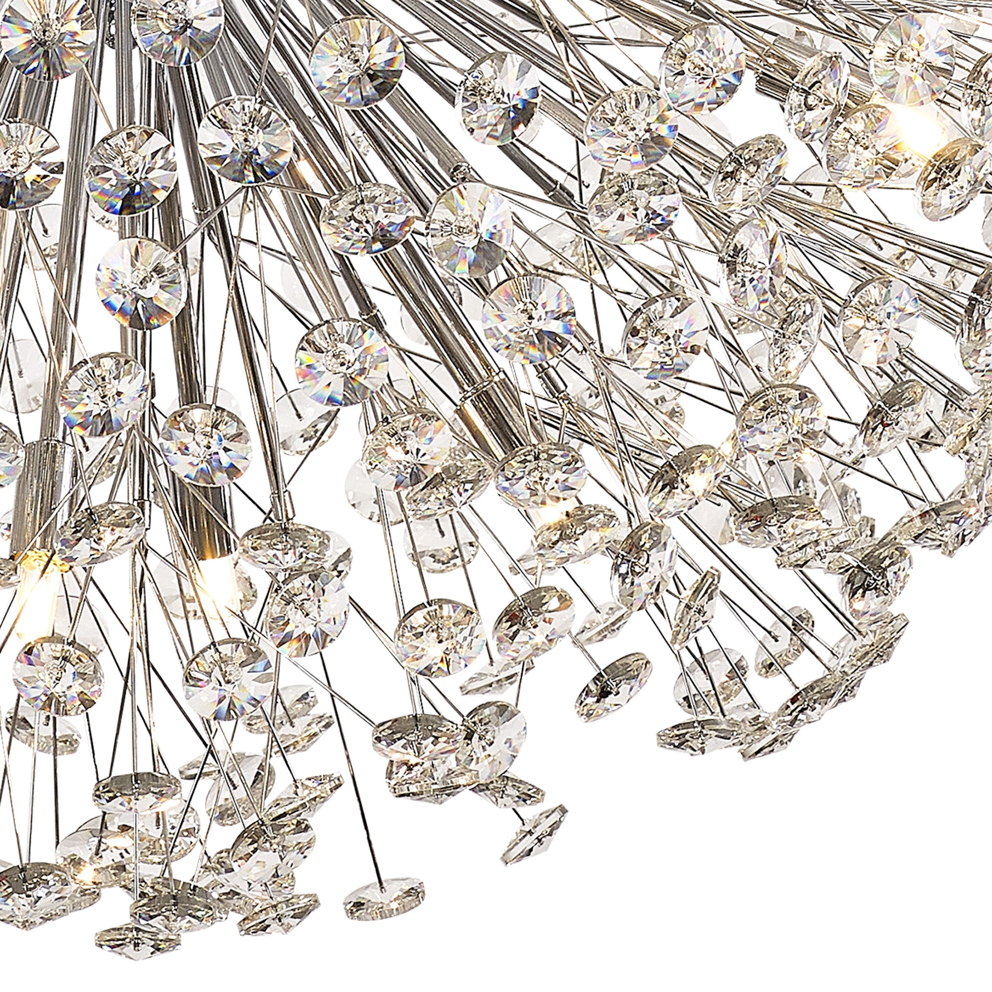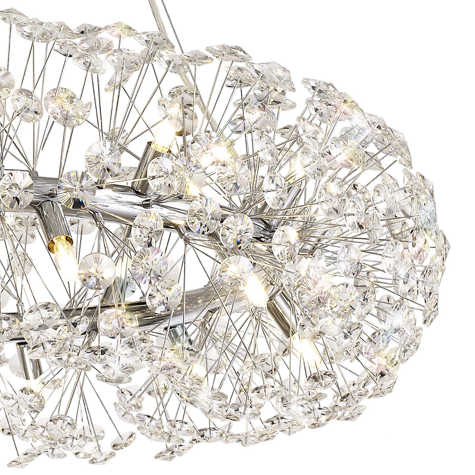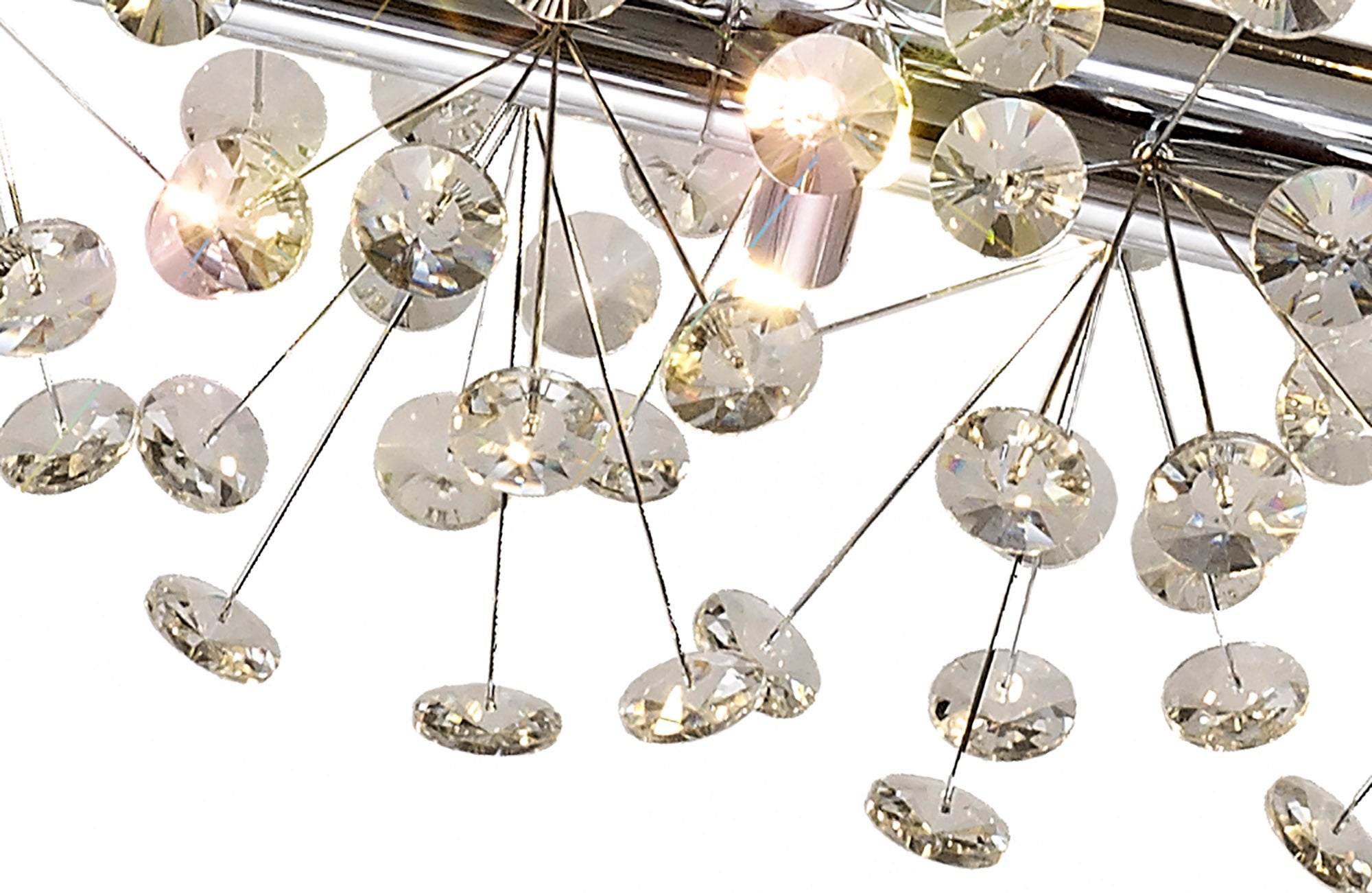 This stunning collection features slim, erratically angled stems that create a captivating cluster of clear crystal disks. The central framework comes in round, tiered, and oblong linear pendant designs, making each piece a striking addition to any space.