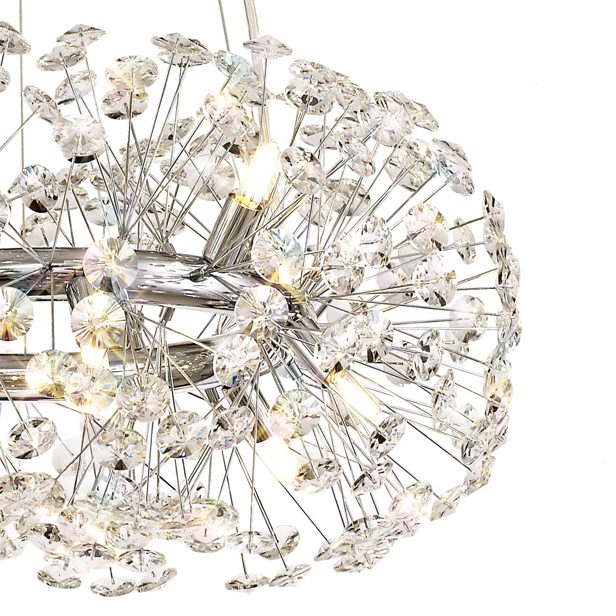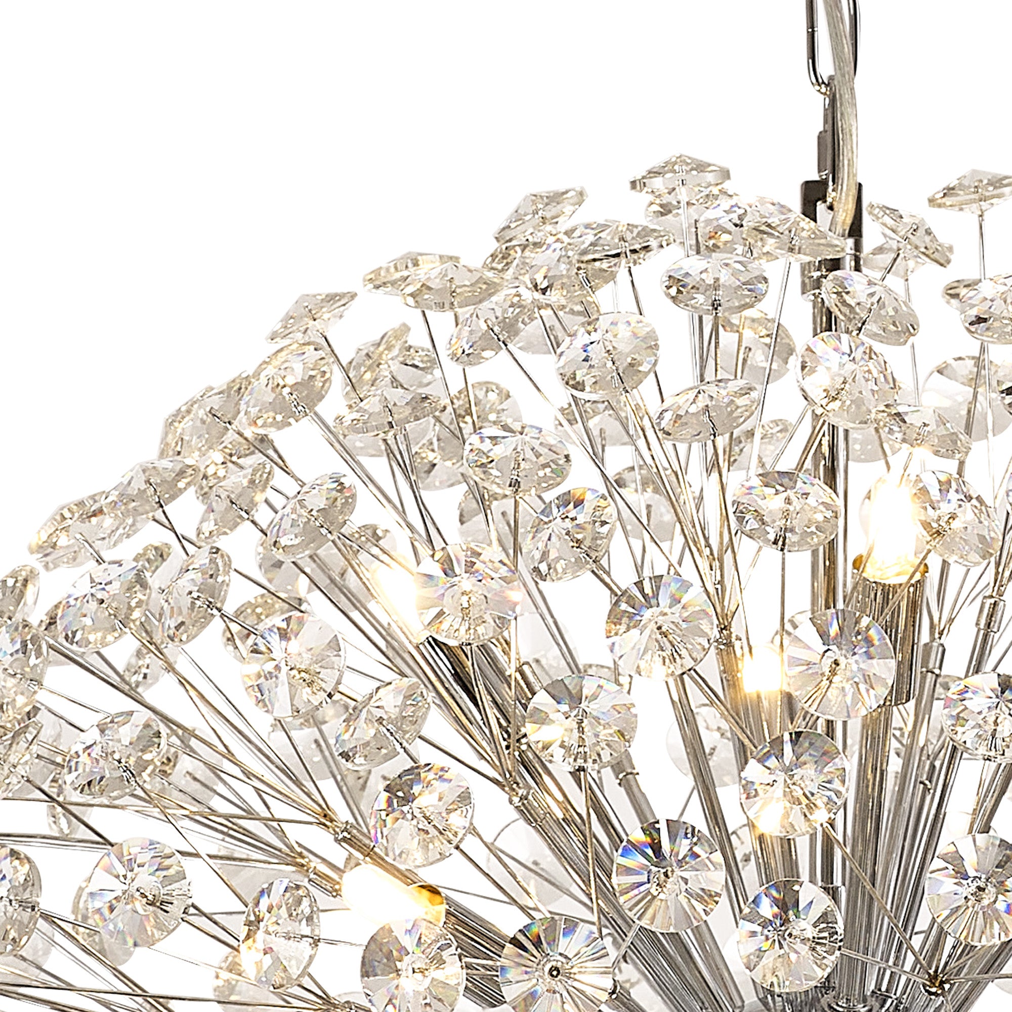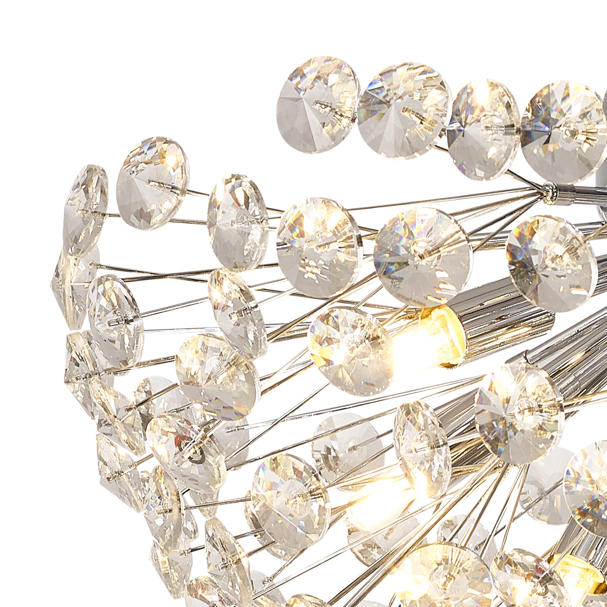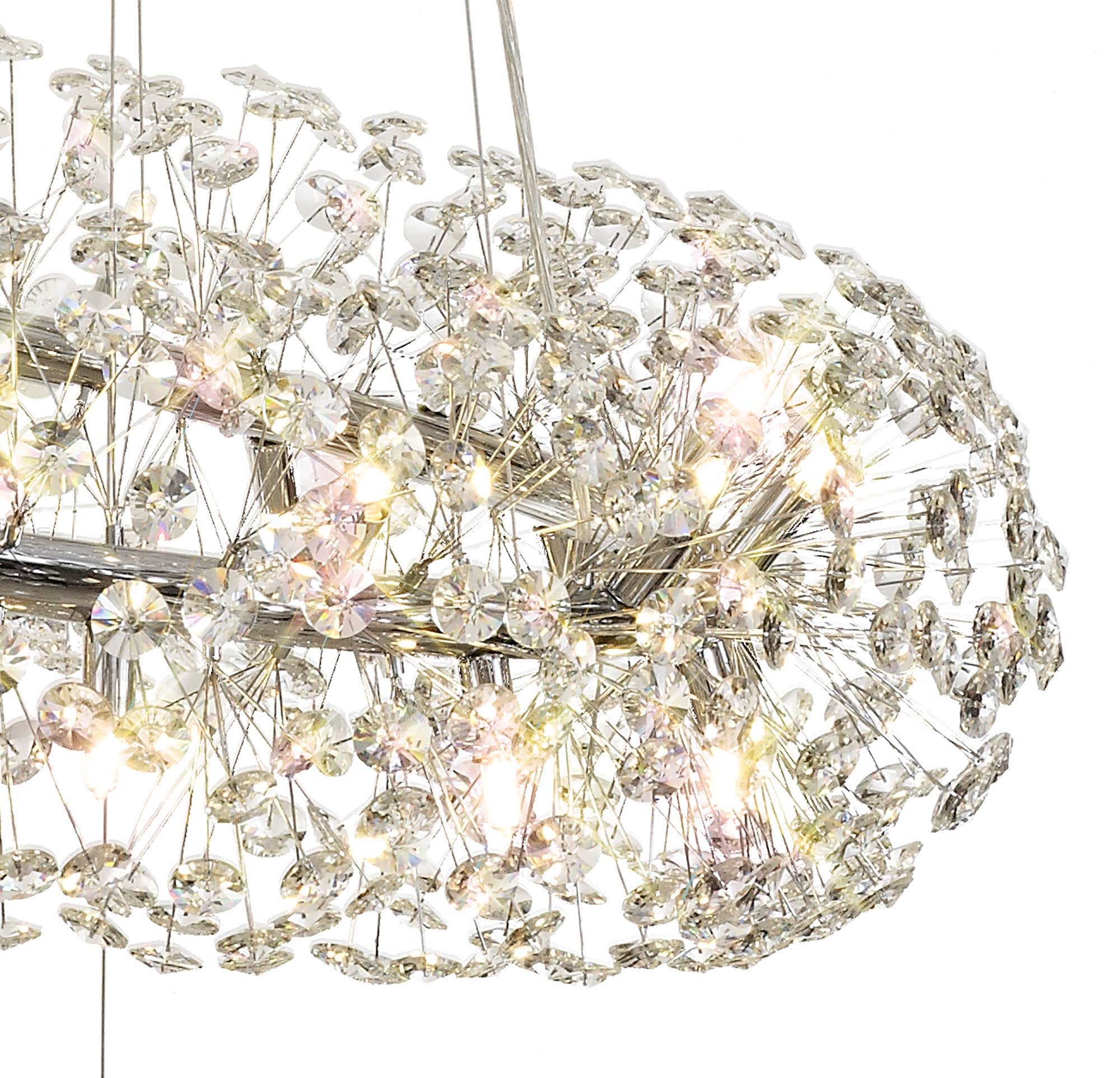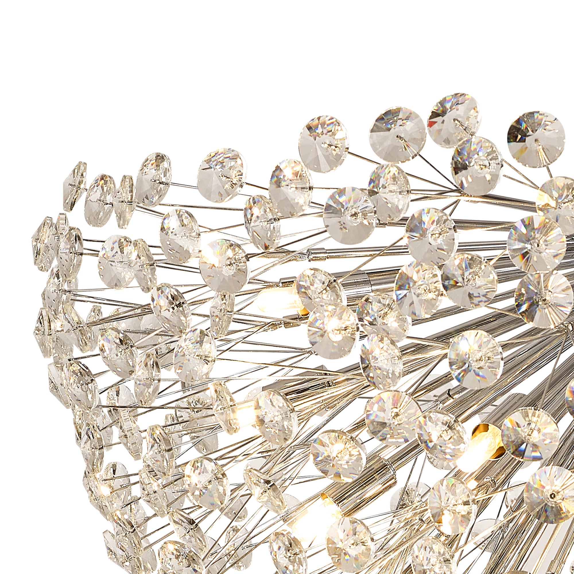 This stunning collection features slim, erratically angled stems that create a captivating cluster of clear crystal disks. The central framework comes in round, tiered, and oblong linear pendant designs, making each piece a striking addition to any space.