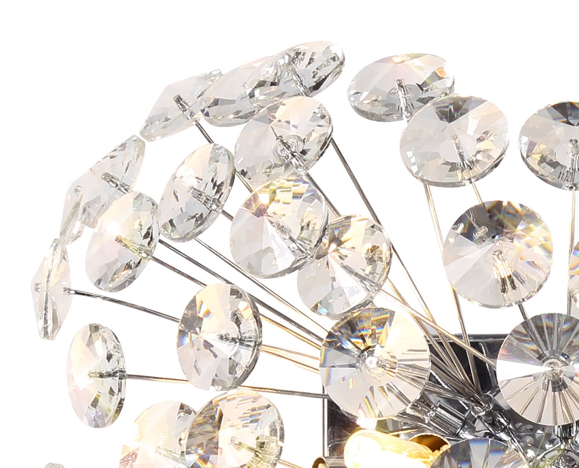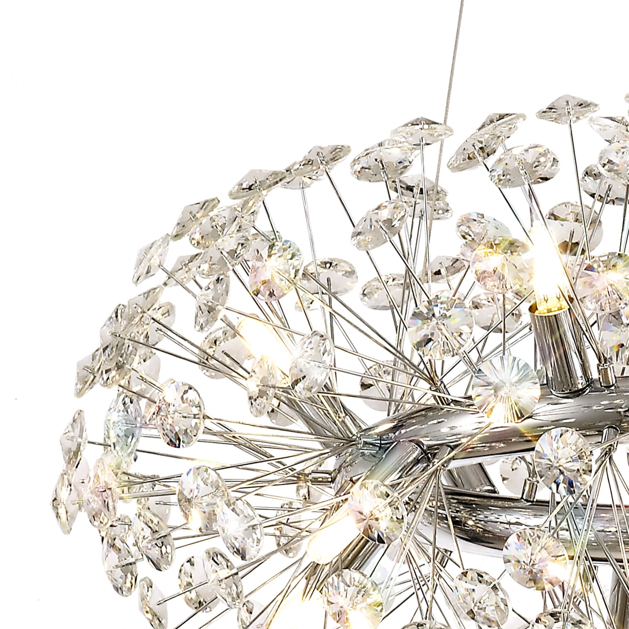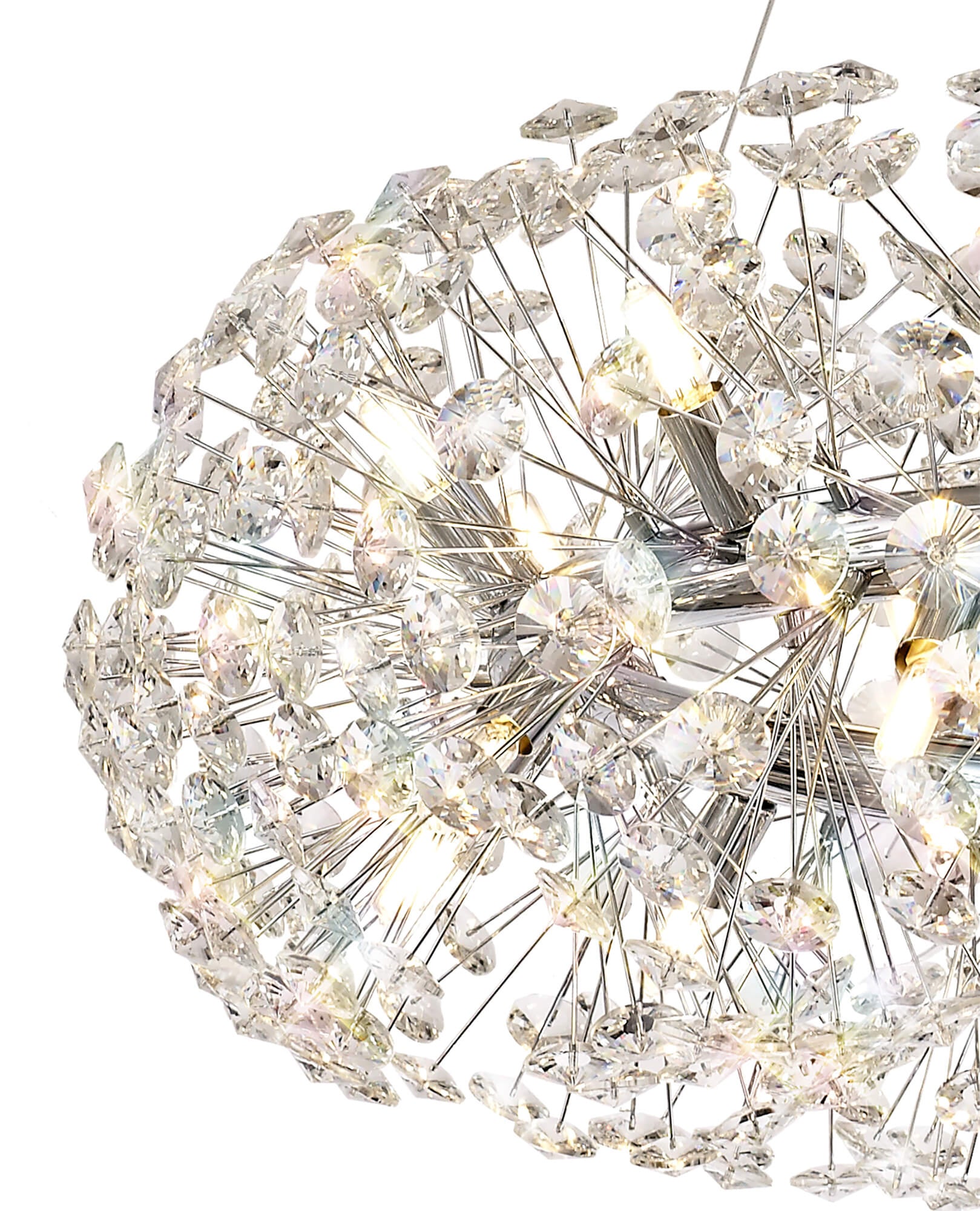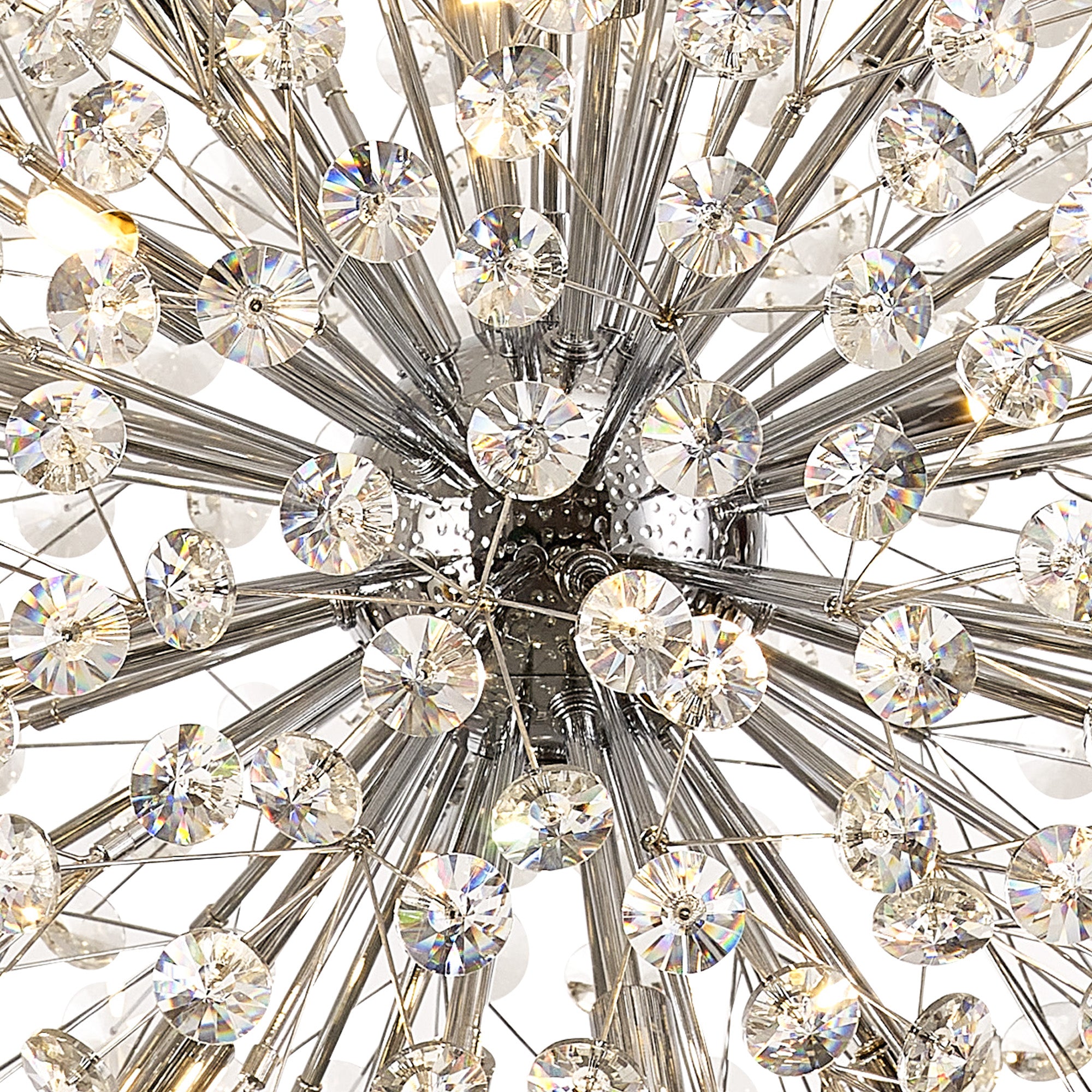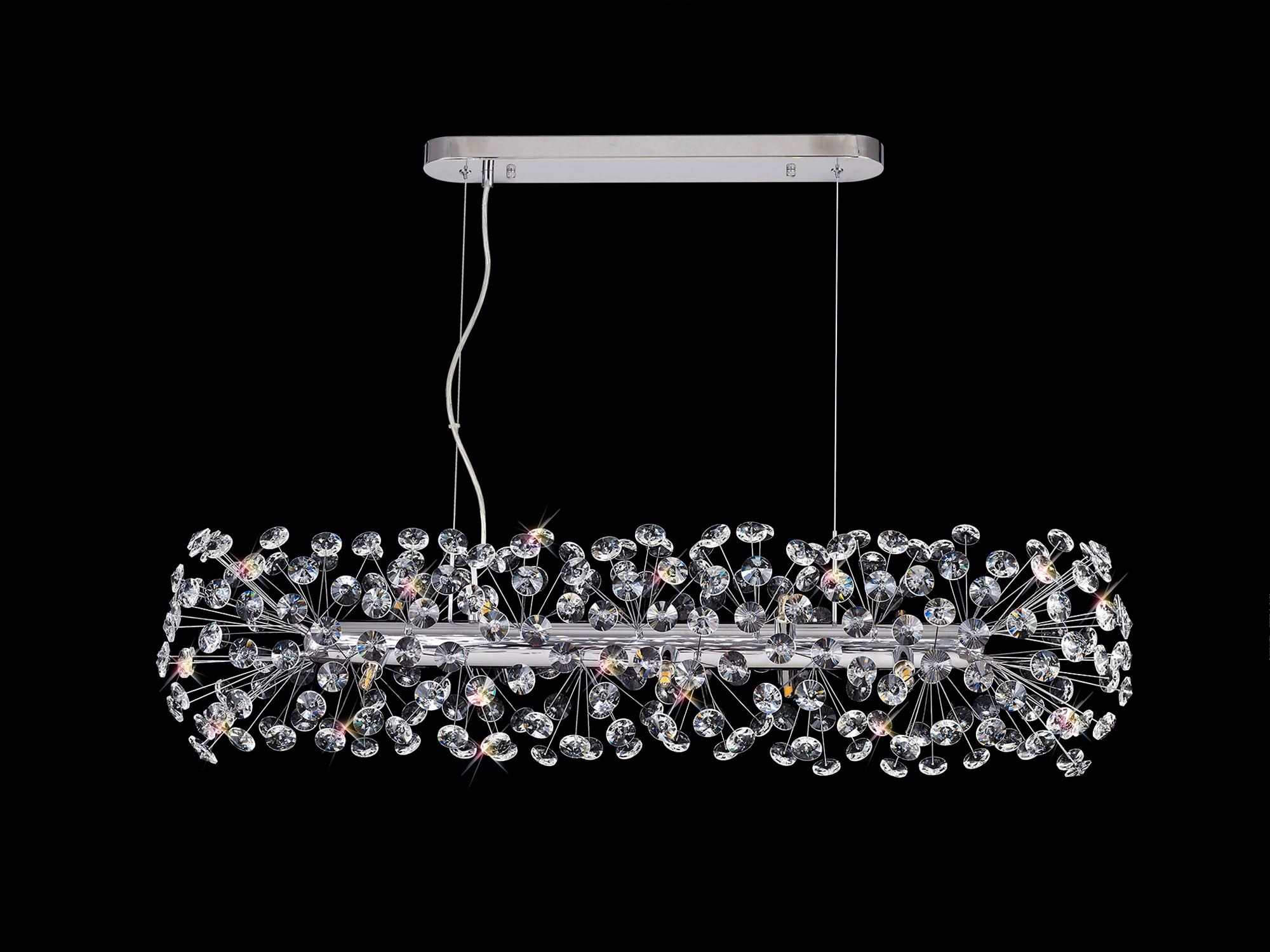 This stunning collection features slim, erratically angled stems that create a captivating cluster of clear crystal disks. The central framework comes in round, tiered, and oblong linear pendant designs, making each piece a striking addition to any space.