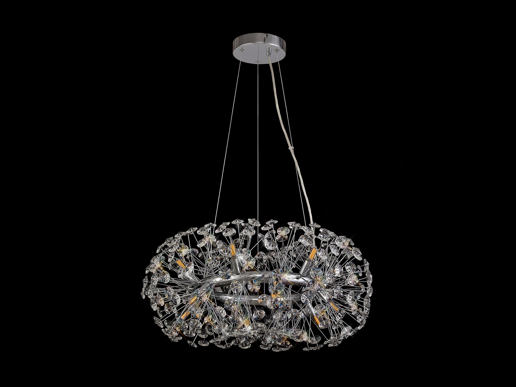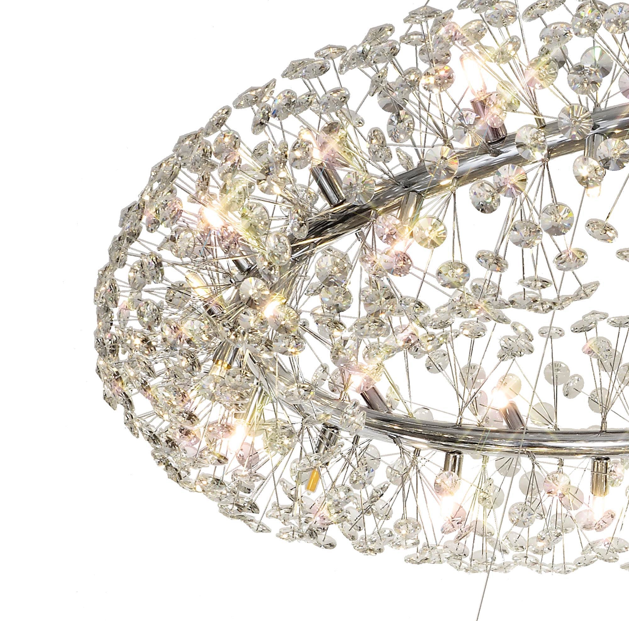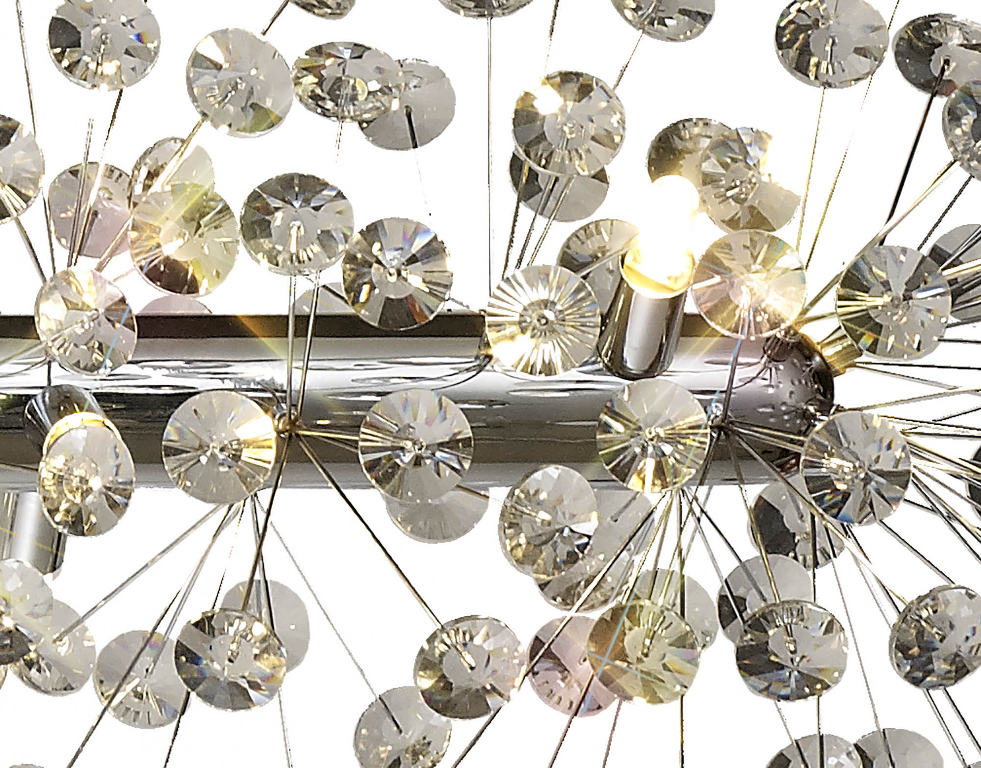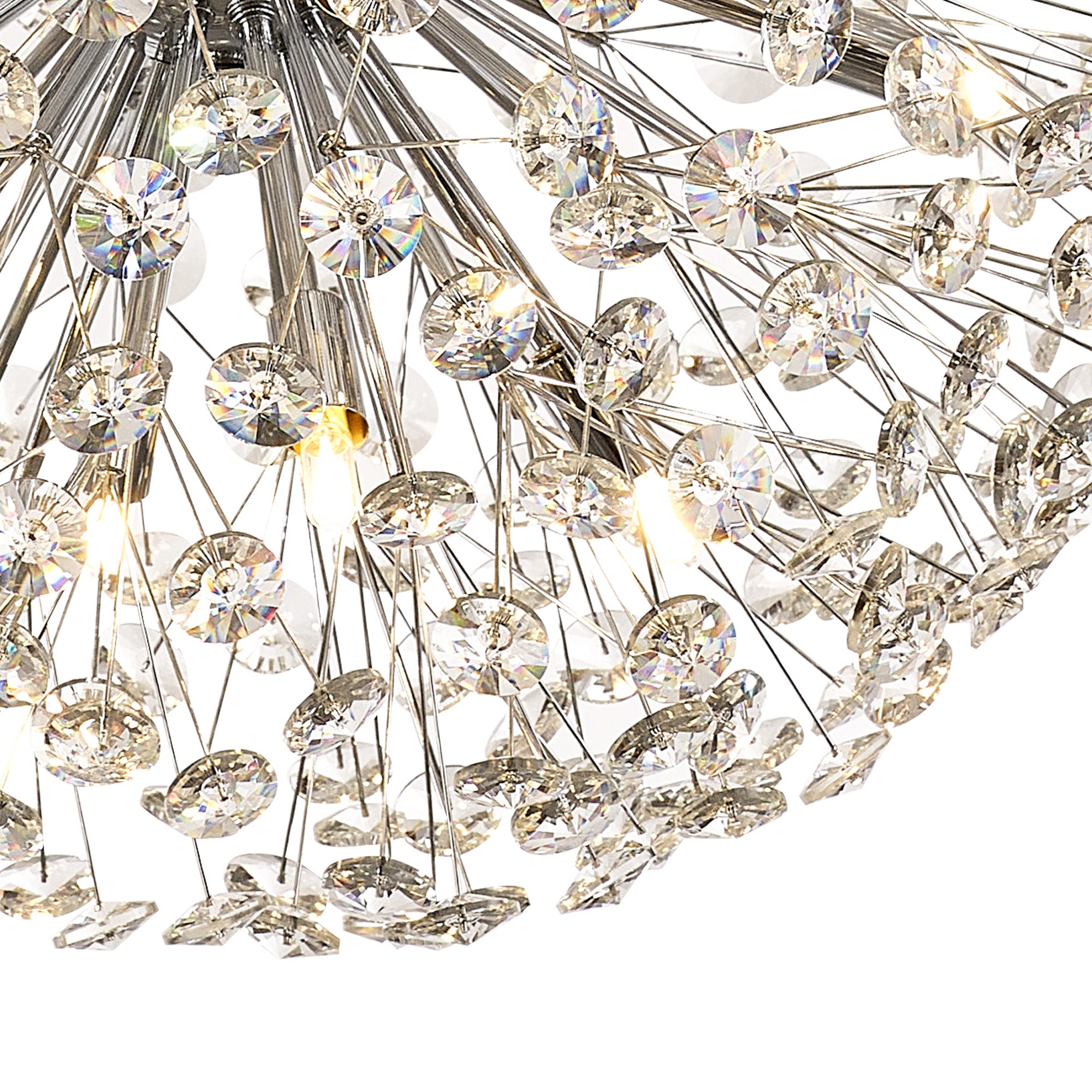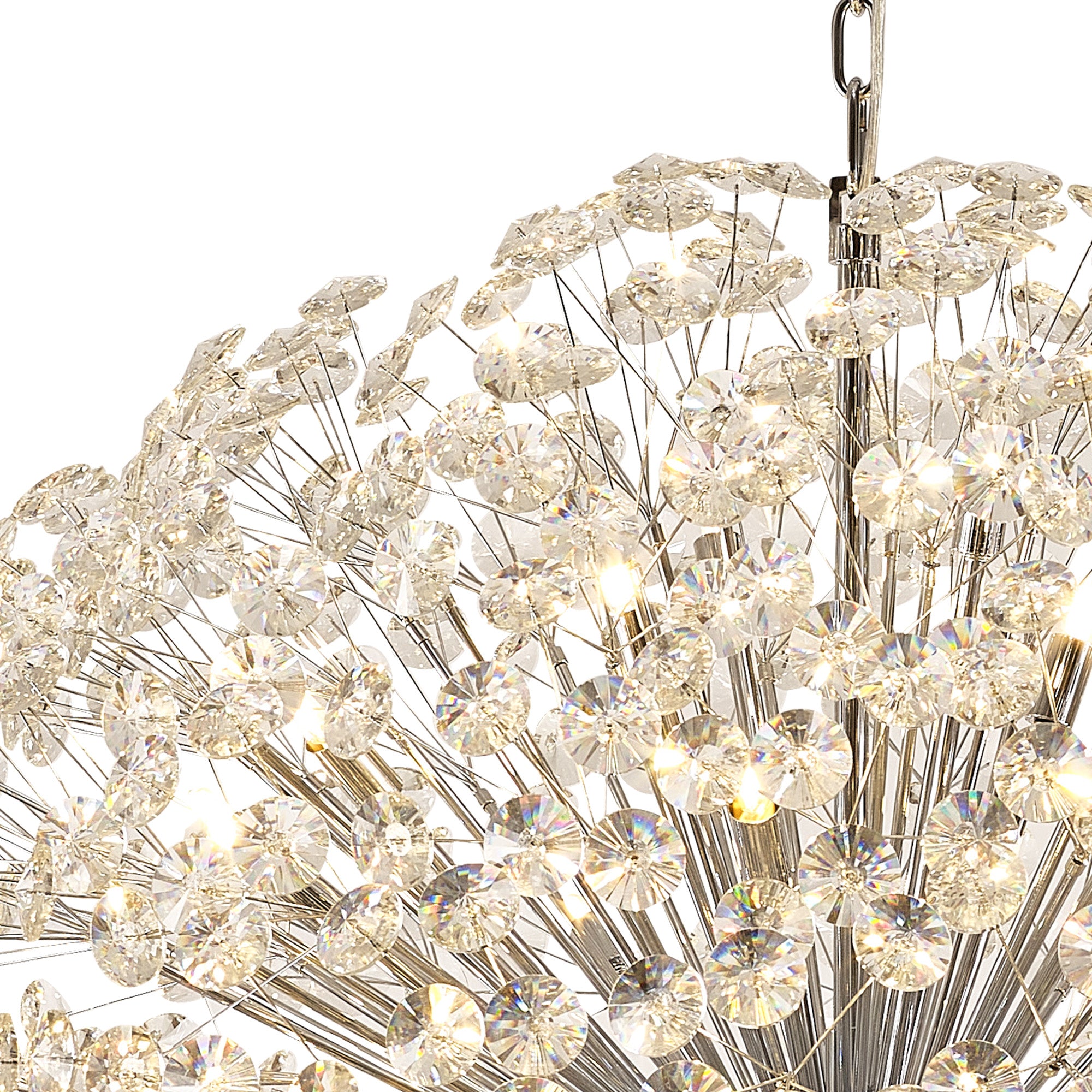 This stunning collection features slim, erratically angled stems that create a captivating cluster of clear crystal disks. The central framework comes in round, tiered, and oblong linear pendant designs, making each piece a striking addition to any space.