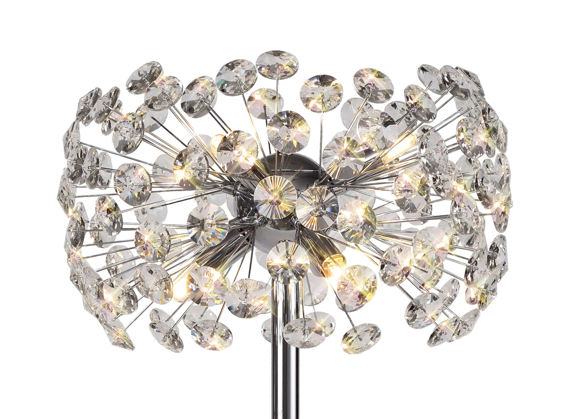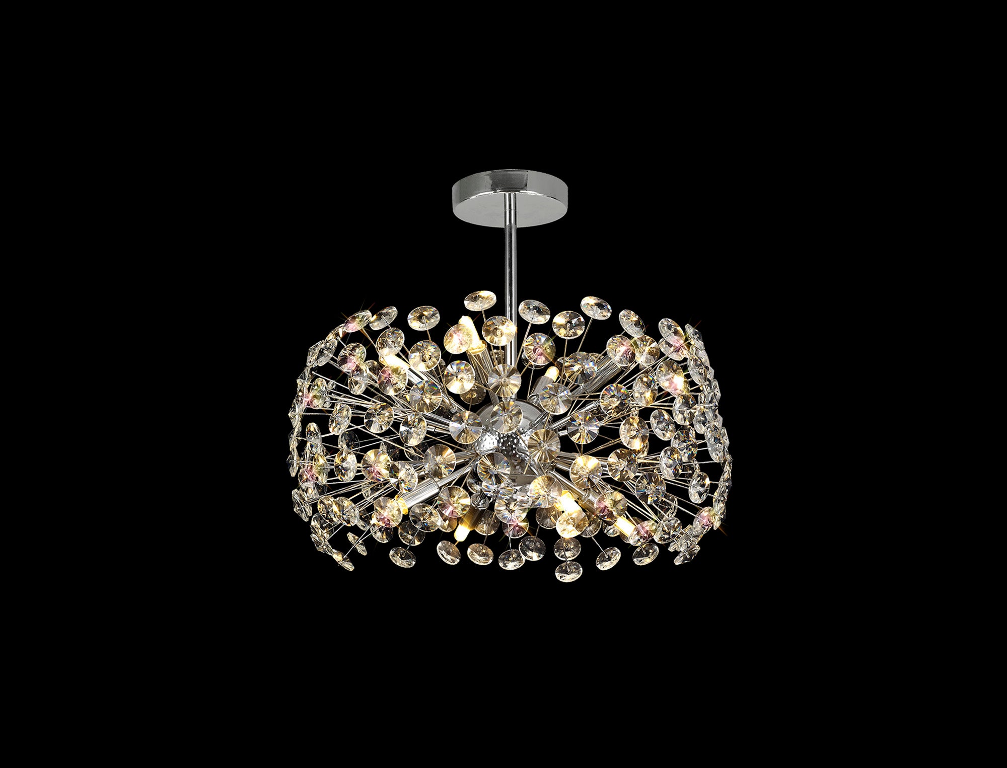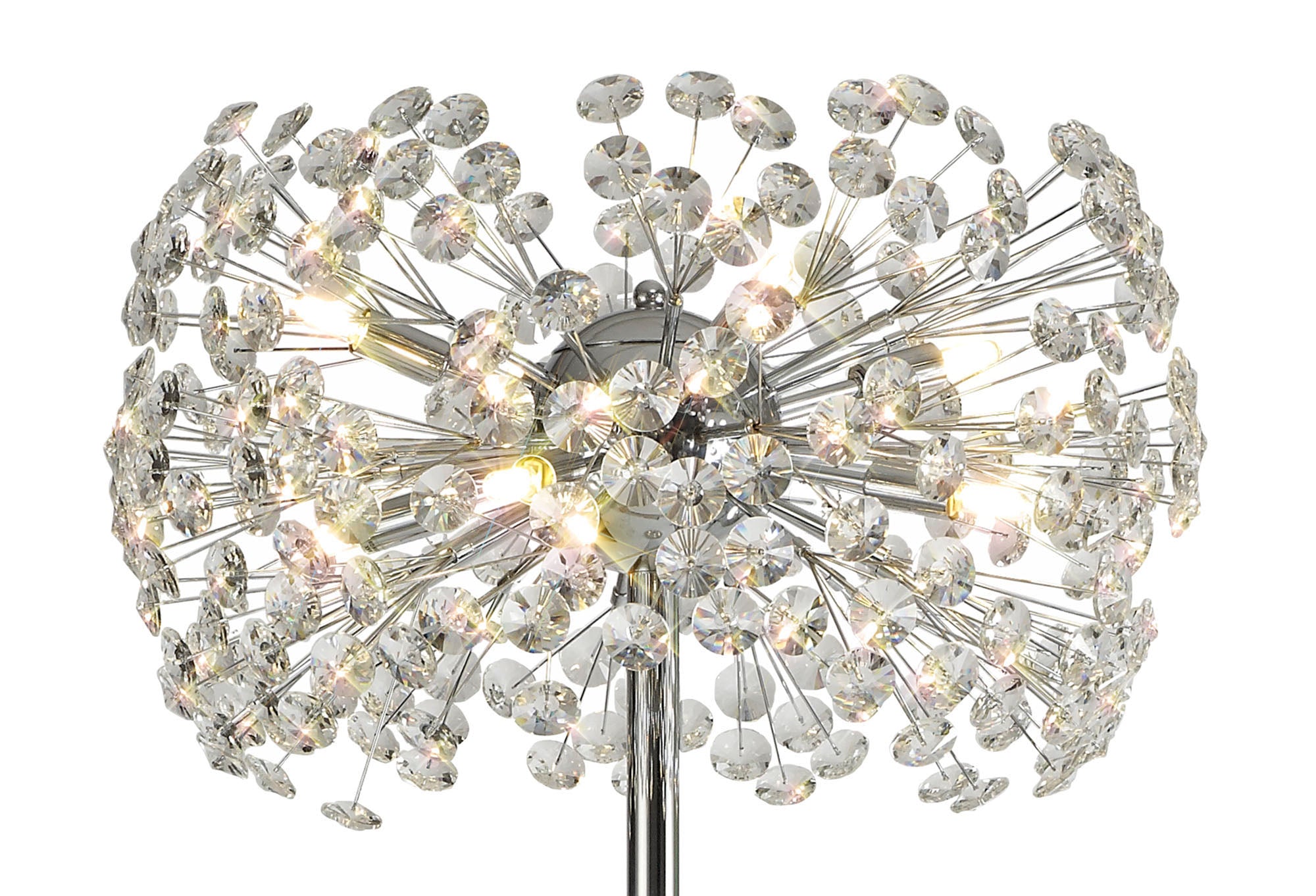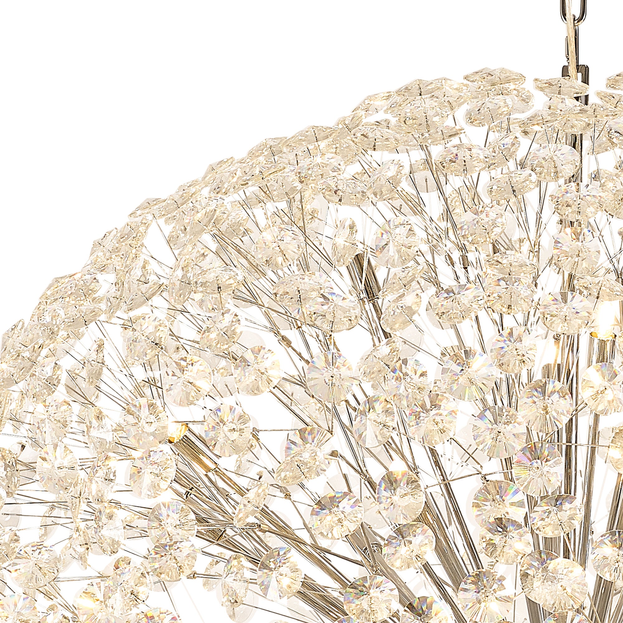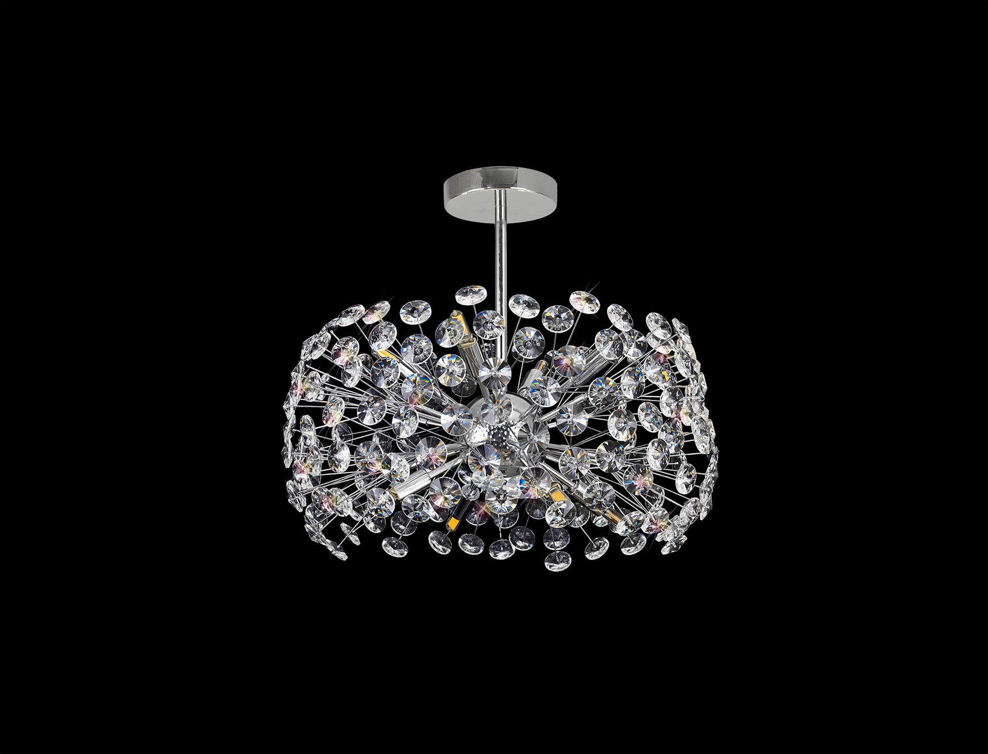 This stunning collection features slim, erratically angled stems that create a captivating cluster of clear crystal disks. The central framework comes in round, tiered, and oblong linear pendant designs, making each piece a striking addition to any space.