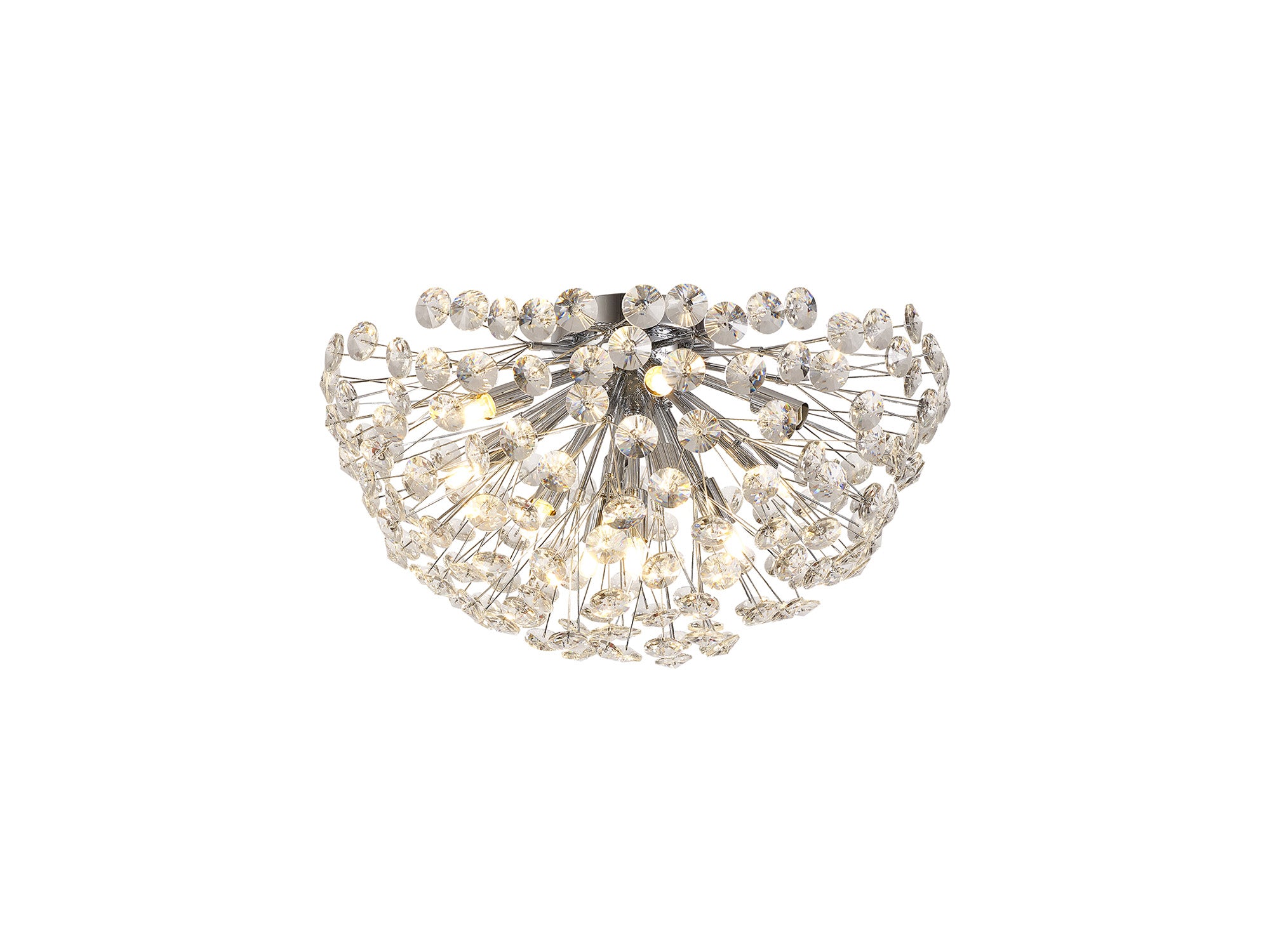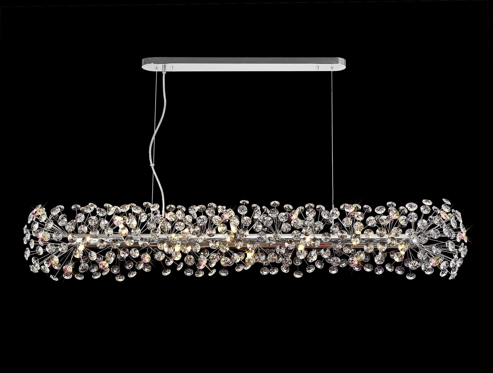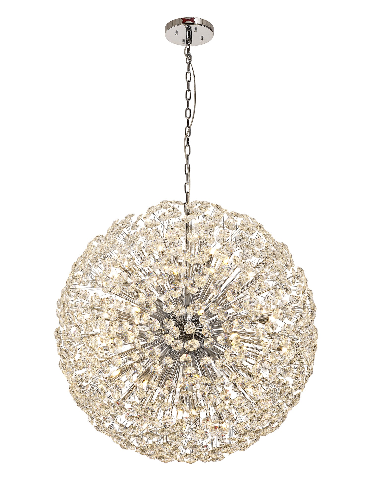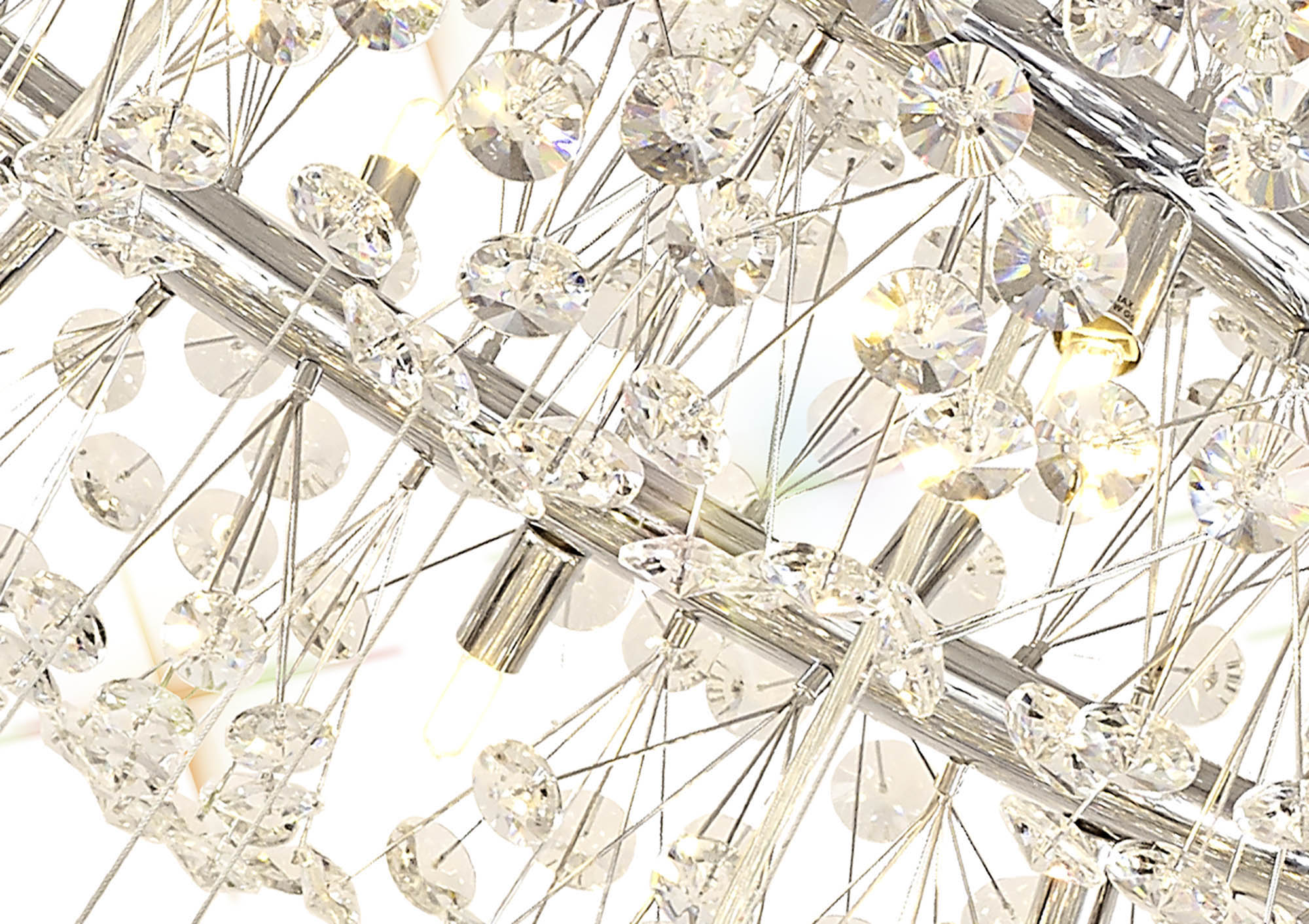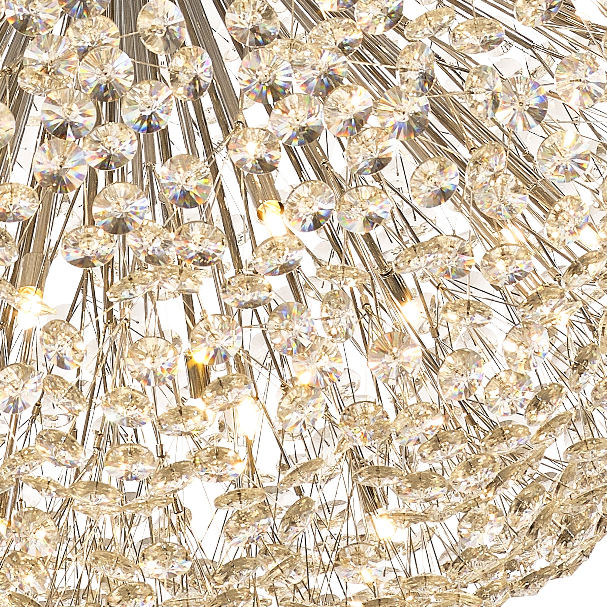 This stunning collection features slim, erratically angled stems that create a captivating cluster of clear crystal disks. The central framework comes in round, tiered, and oblong linear pendant designs, making each piece a striking addition to any space.