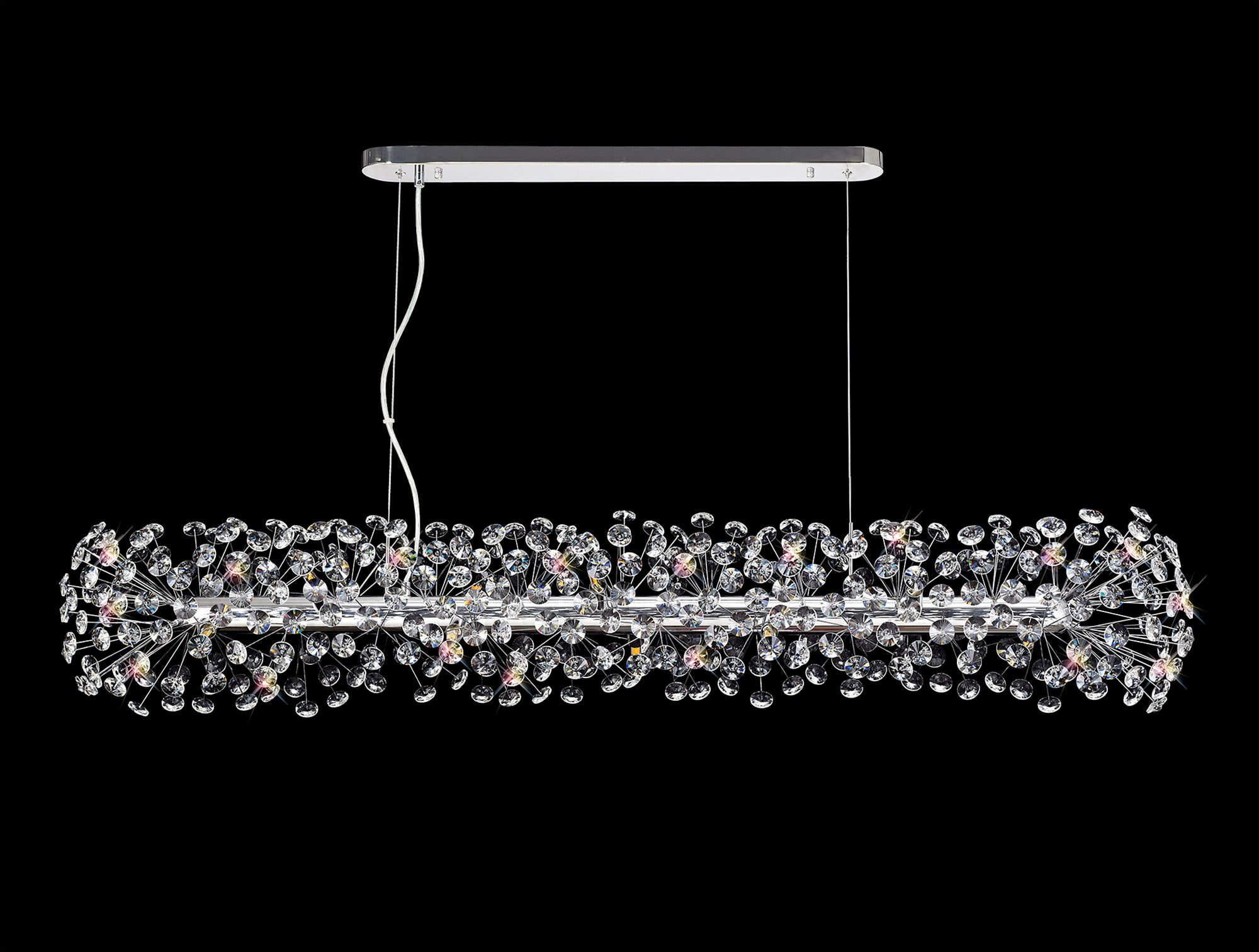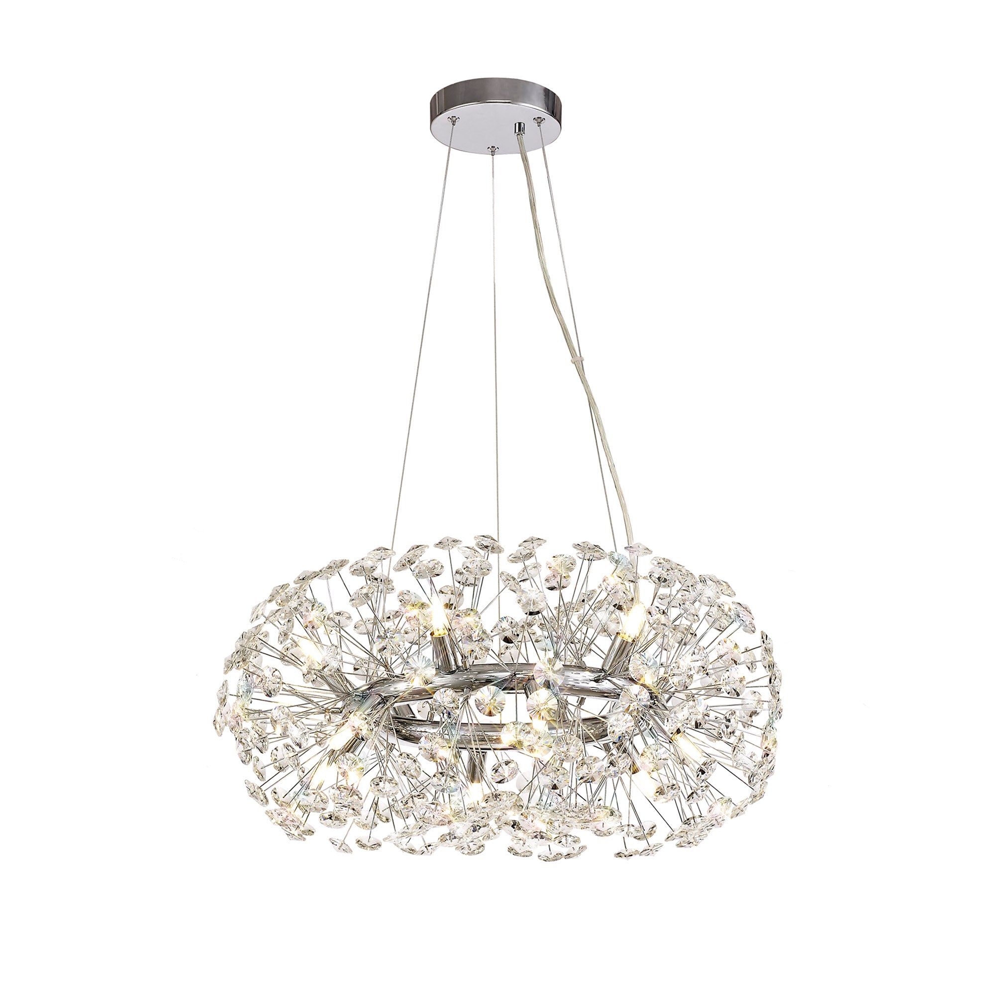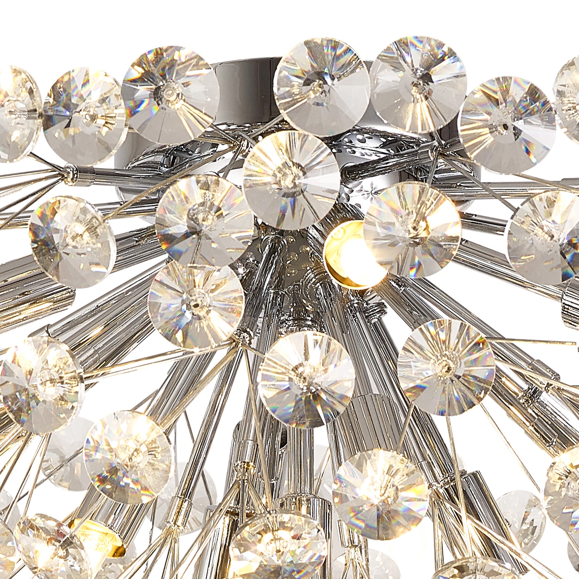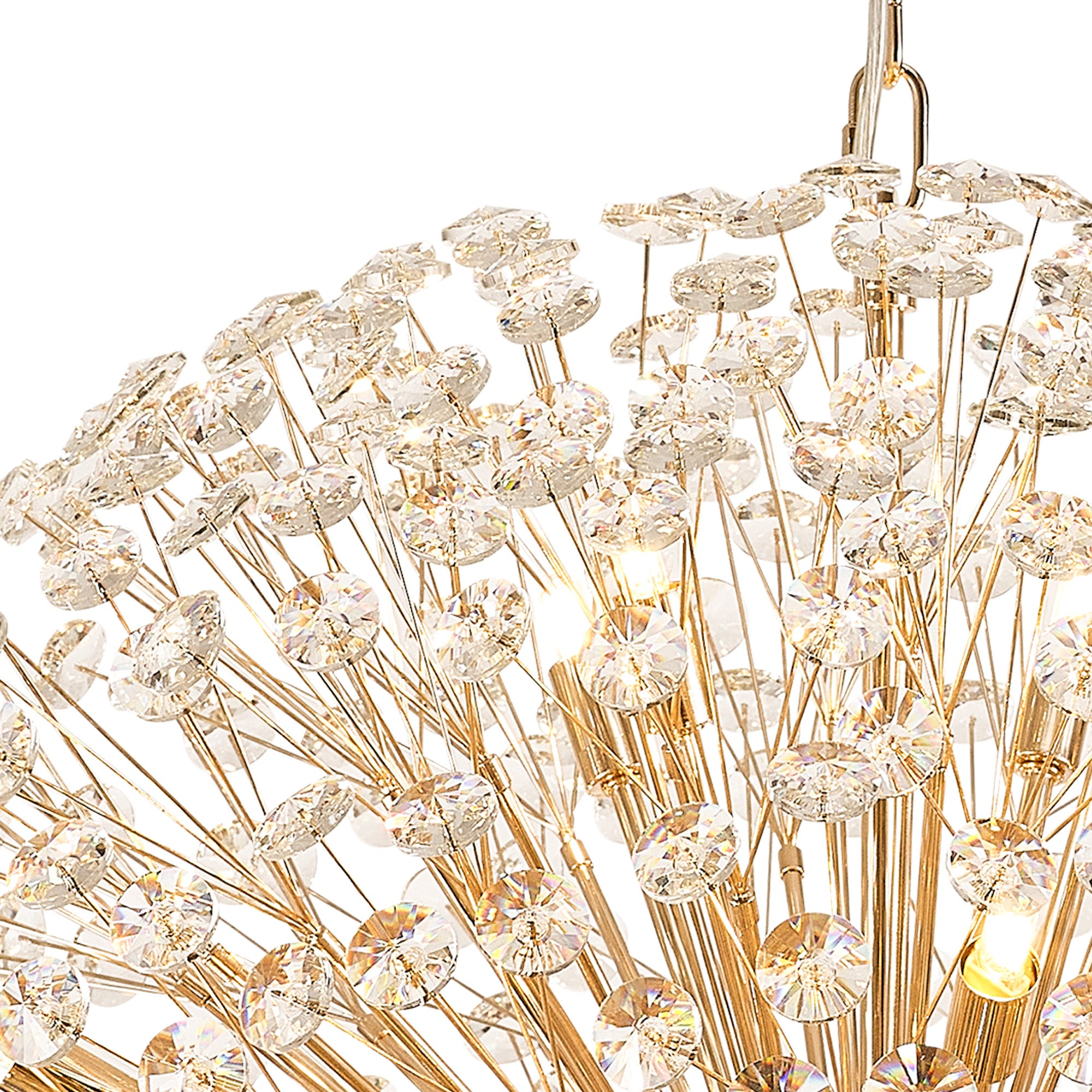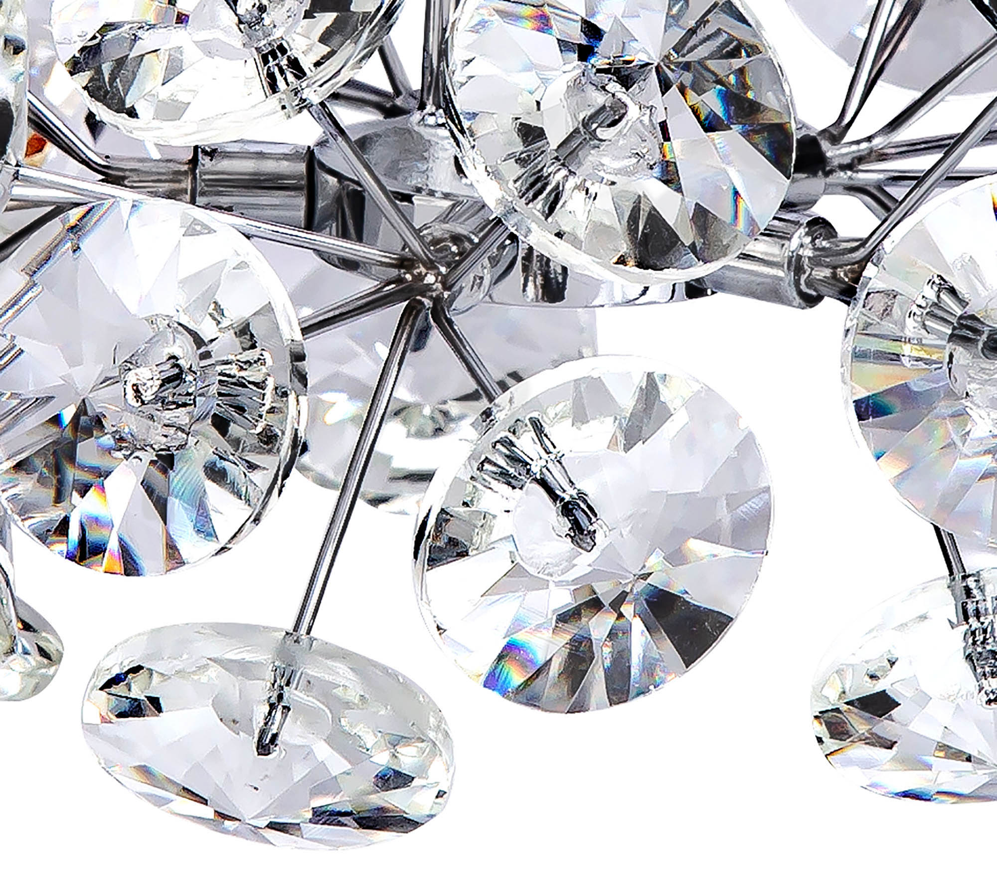 This stunning collection features slim, erratically angled stems that create a captivating cluster of clear crystal disks. The central framework comes in round, tiered, and oblong linear pendant designs, making each piece a striking addition to any space.