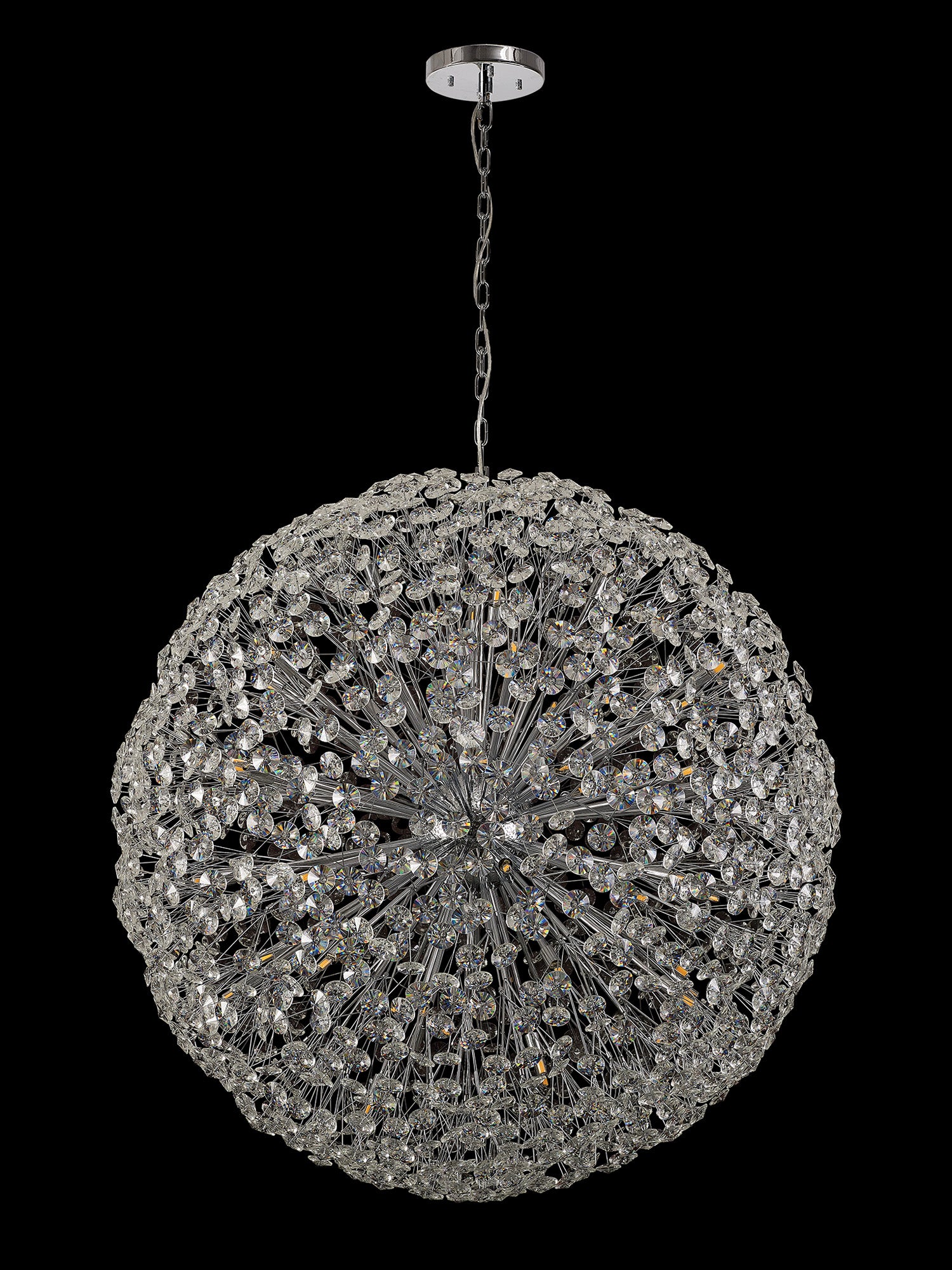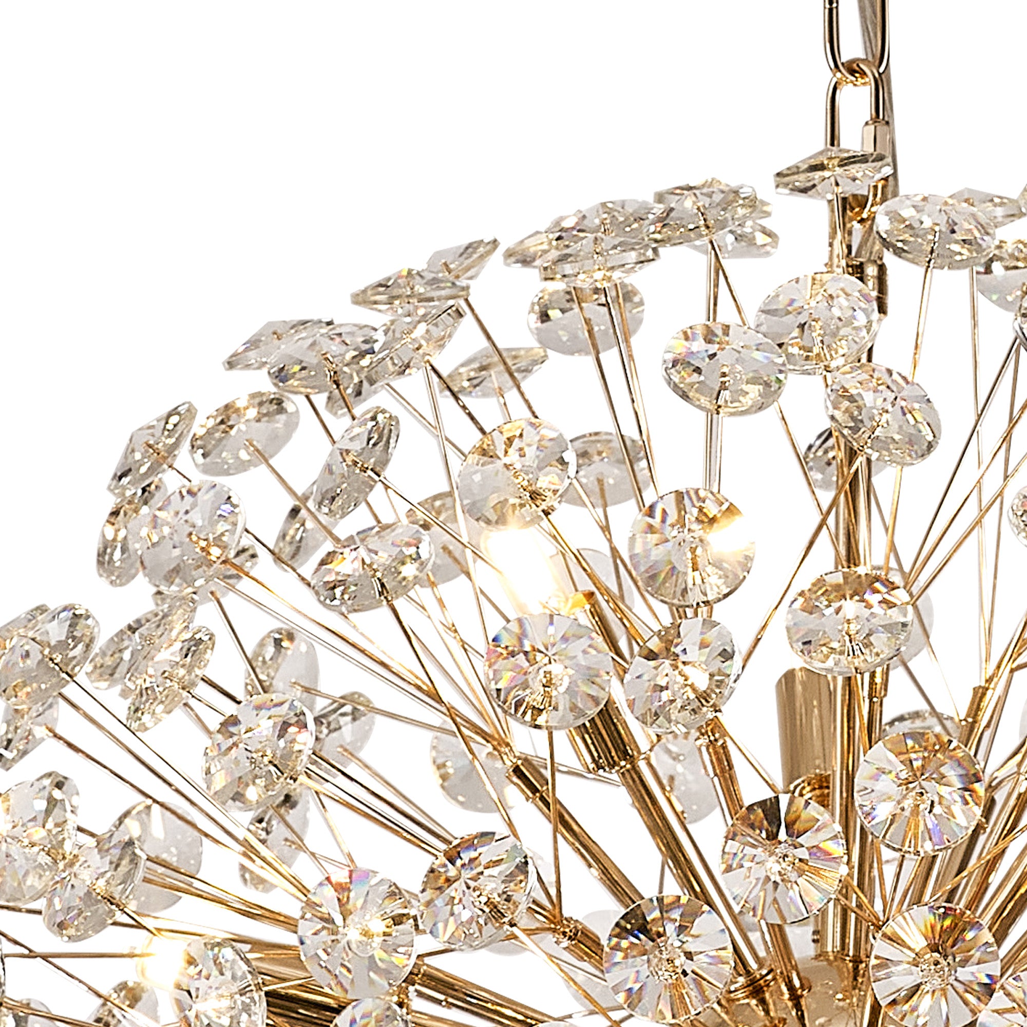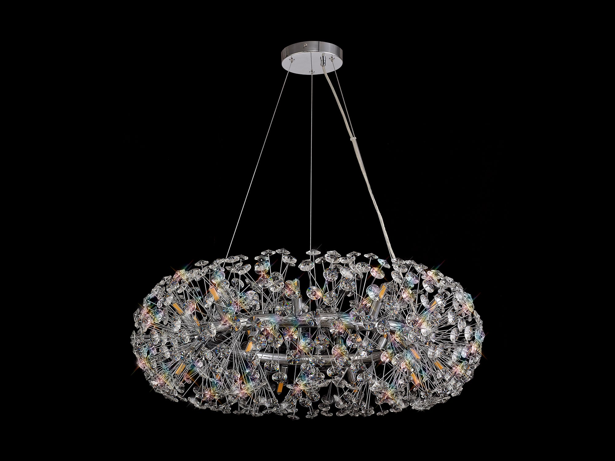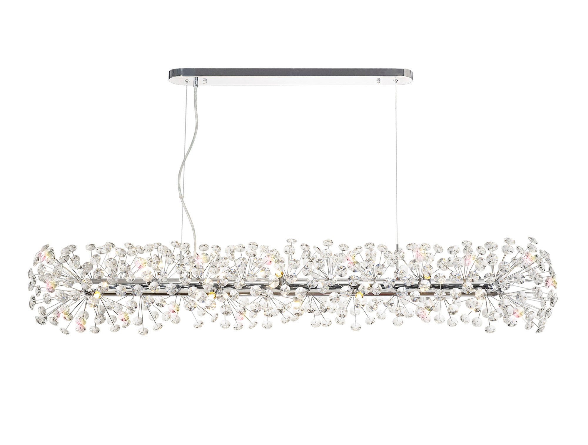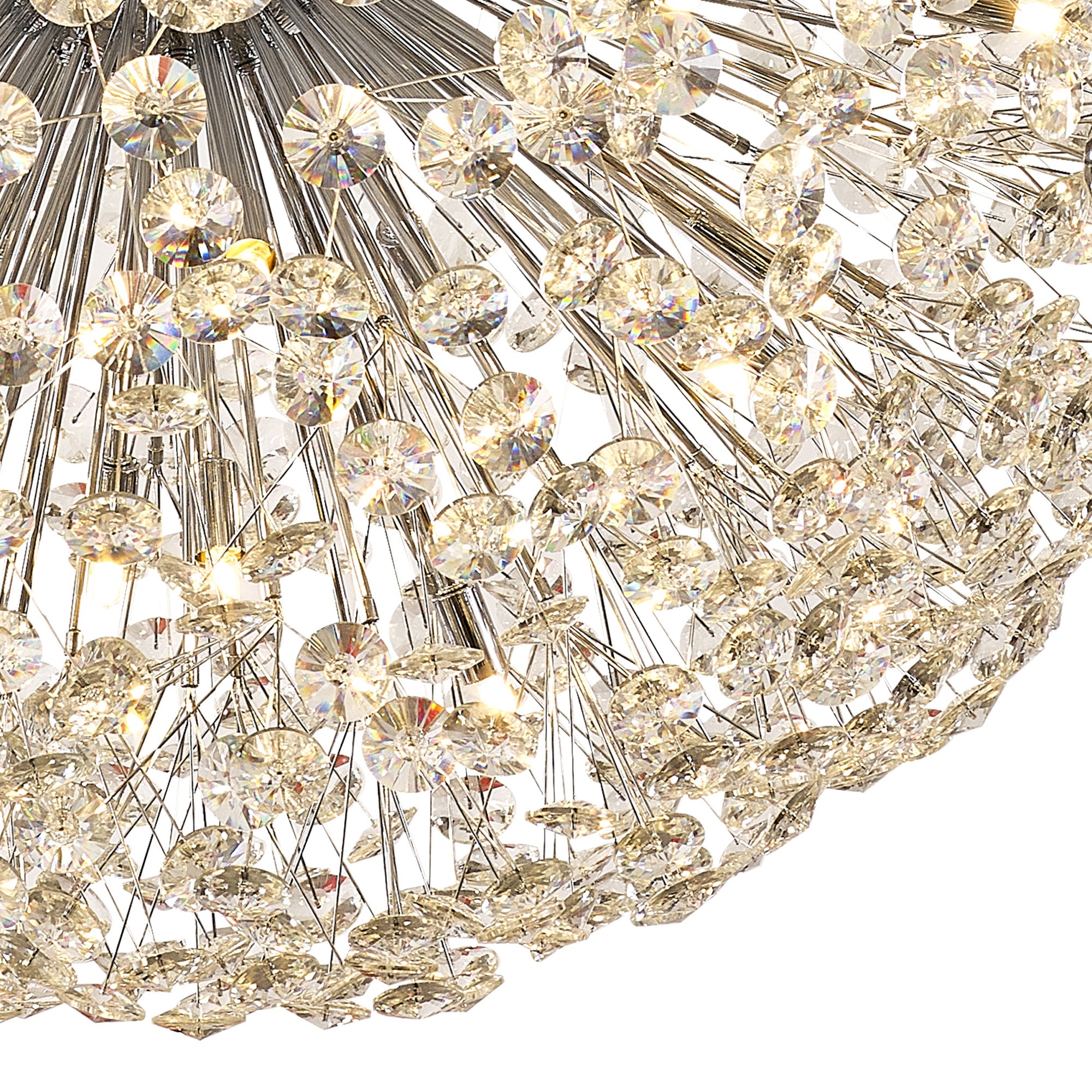 This stunning collection features slim, erratically angled stems that create a captivating cluster of clear crystal disks. The central framework comes in round, tiered, and oblong linear pendant designs, making each piece a striking addition to any space.