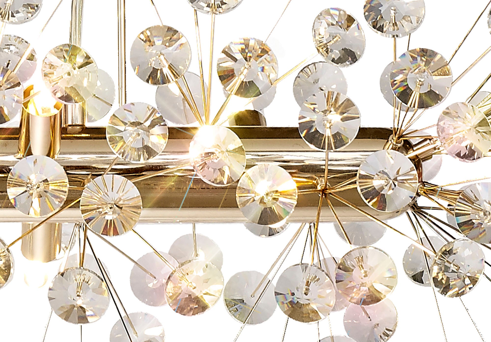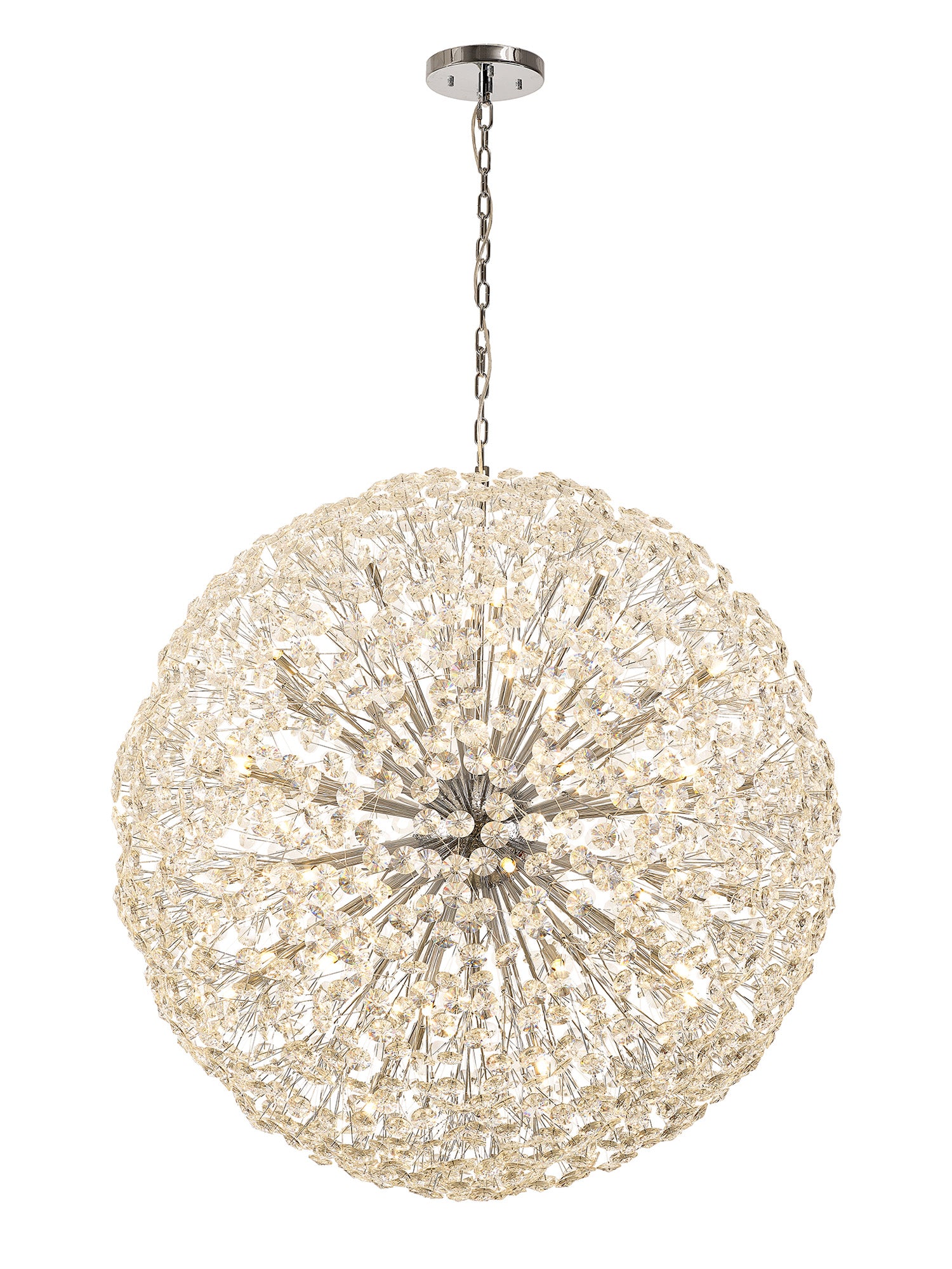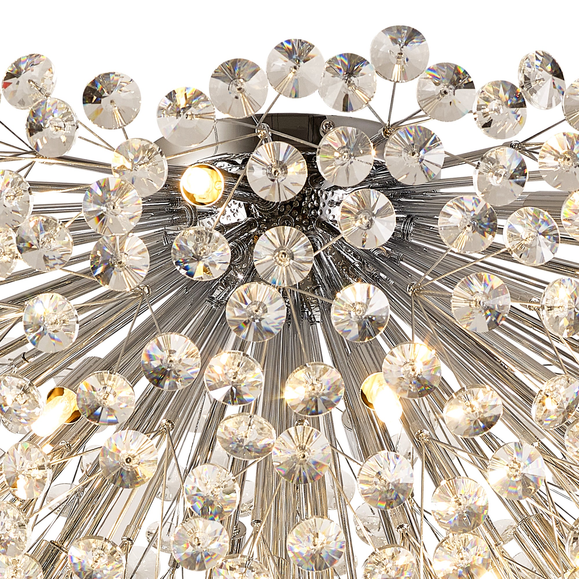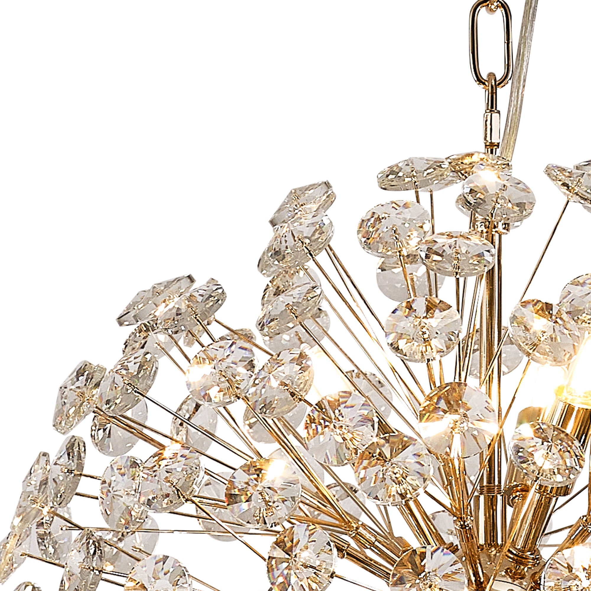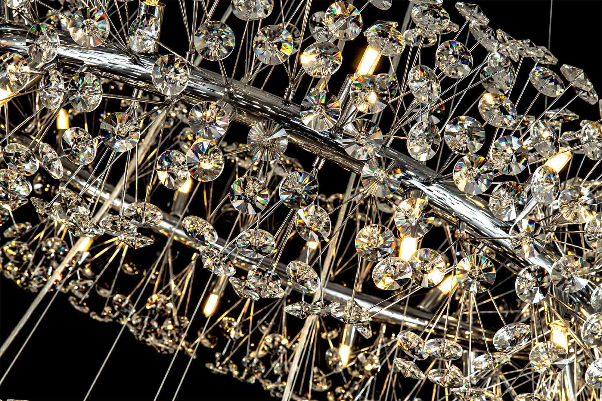 This stunning collection features slim, erratically angled stems that create a captivating cluster of clear crystal disks. The central framework comes in round, tiered, and oblong linear pendant designs, making each piece a striking addition to any space.