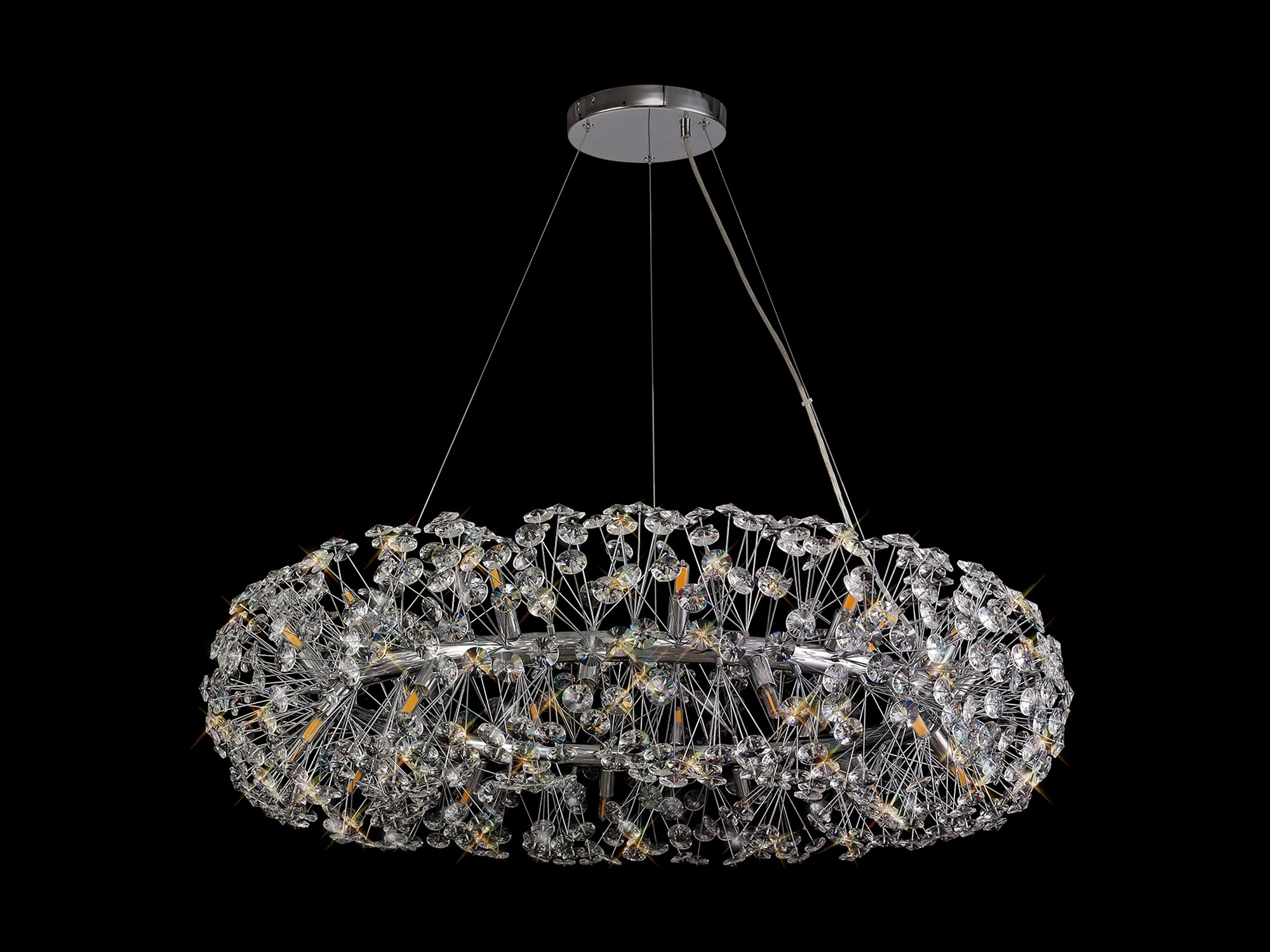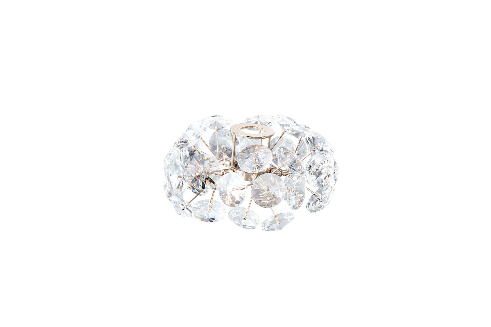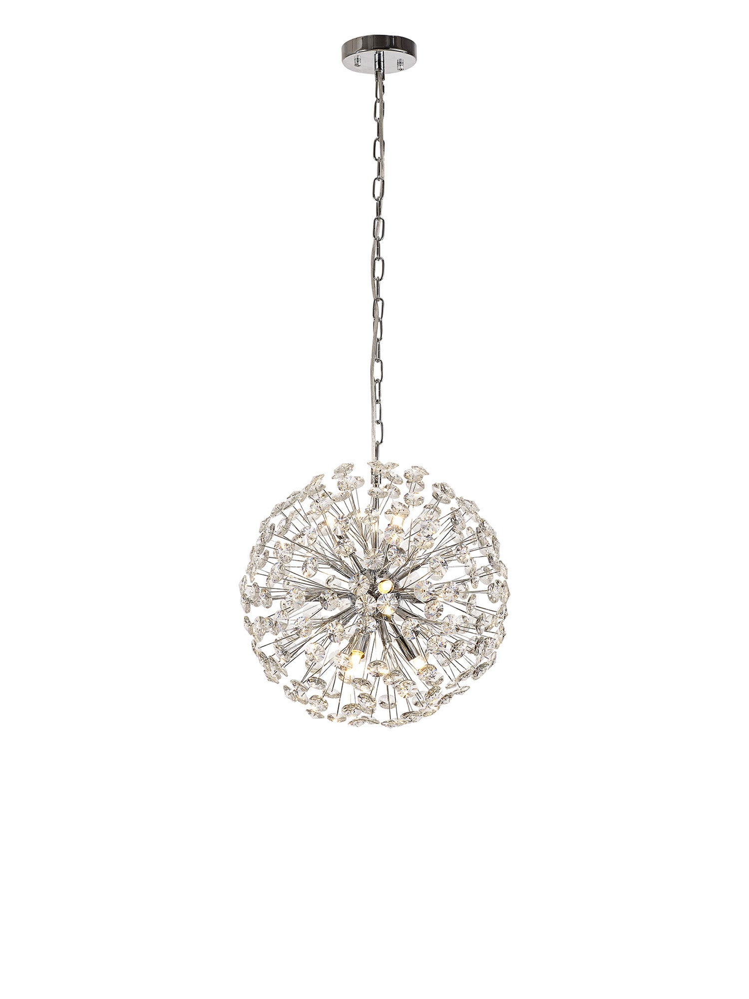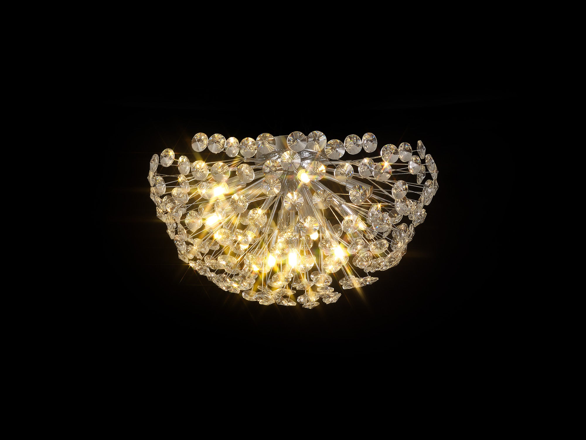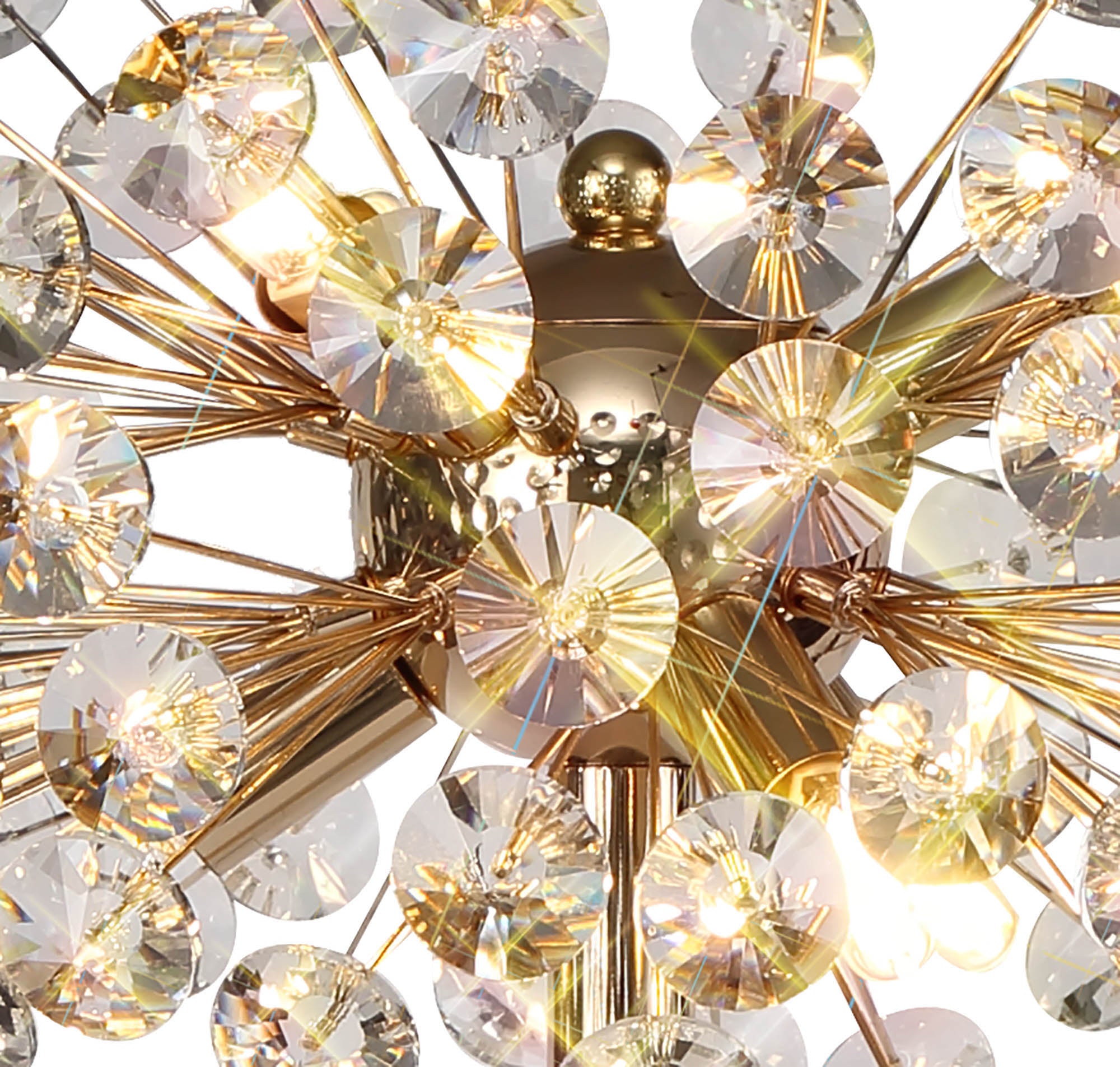 This stunning collection features slim, erratically angled stems that create a captivating cluster of clear crystal disks. The central framework comes in round, tiered, and oblong linear pendant designs, making each piece a striking addition to any space.