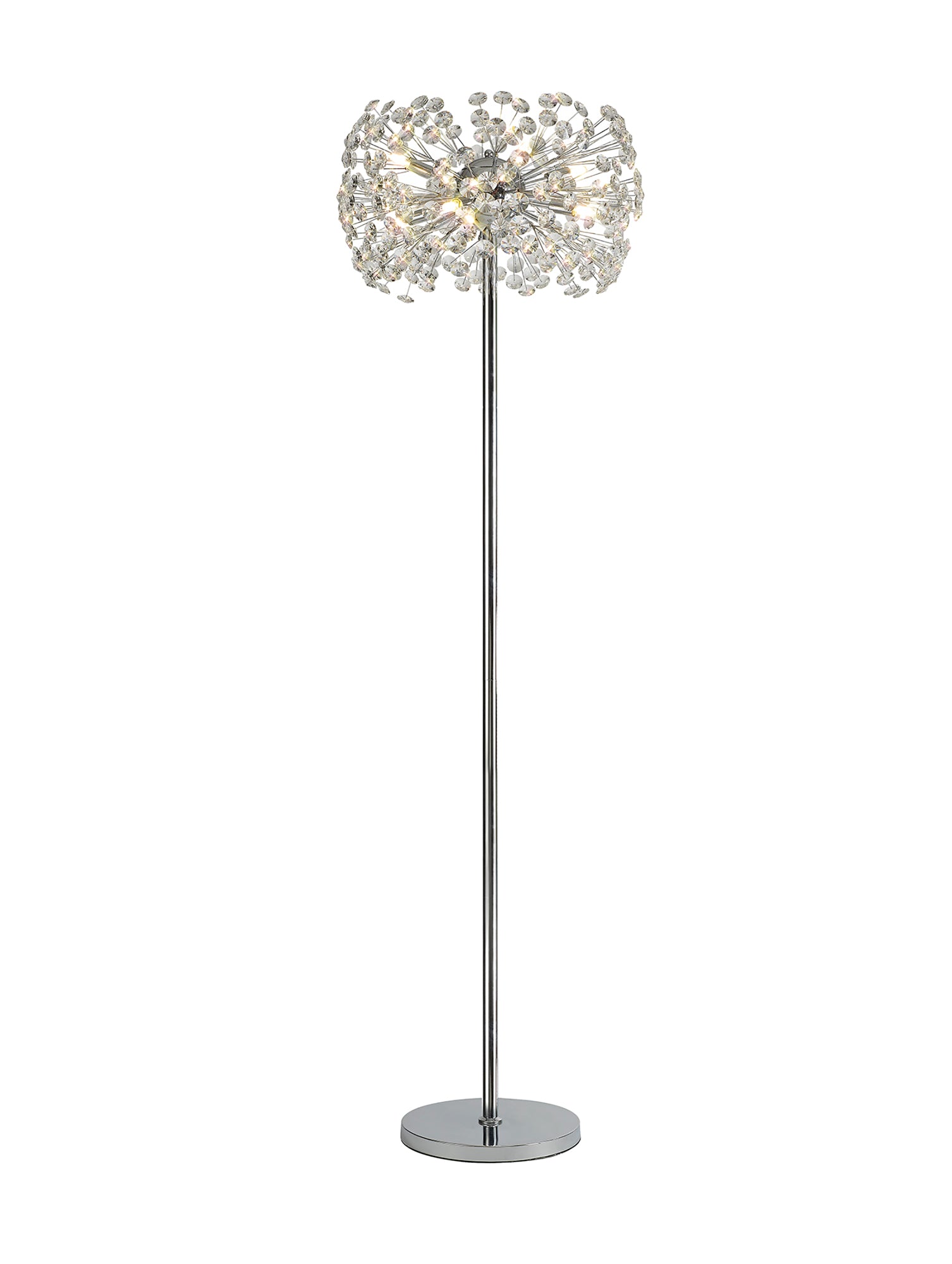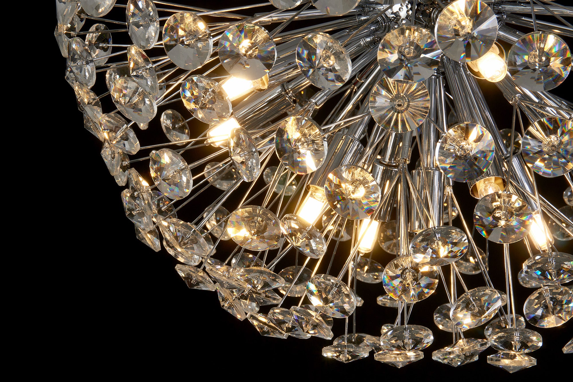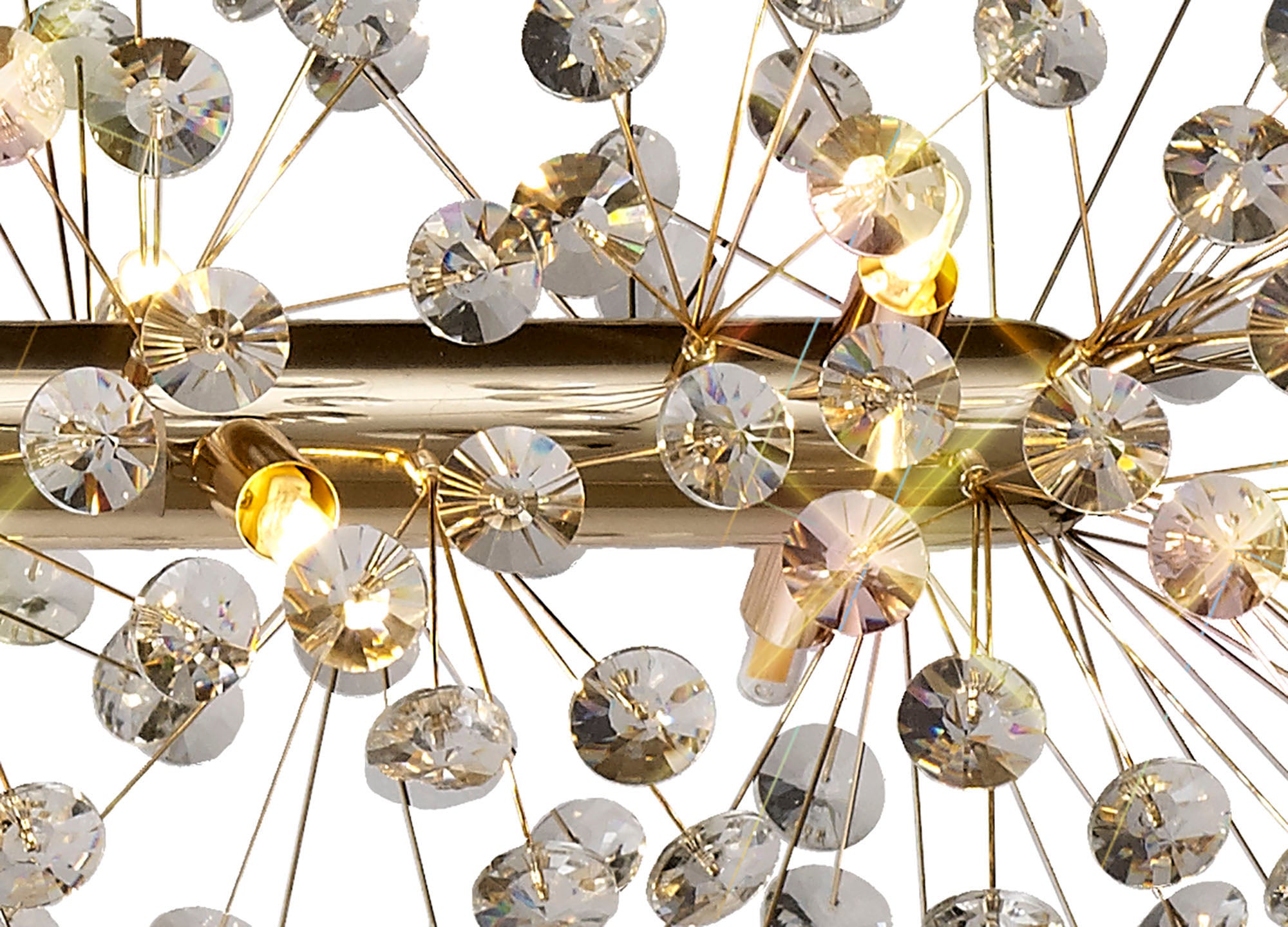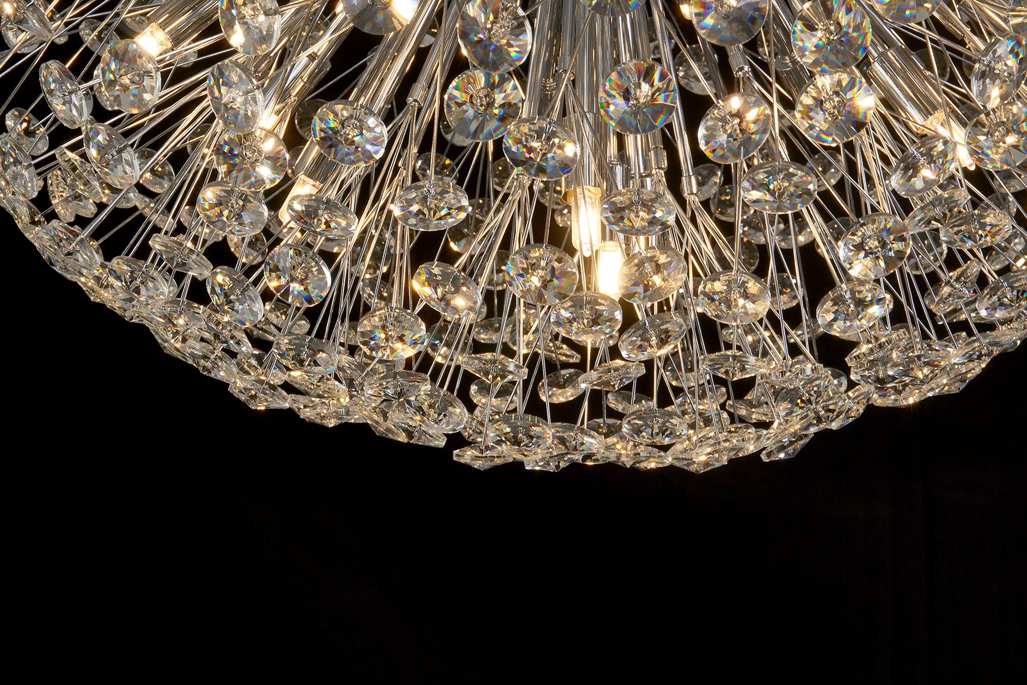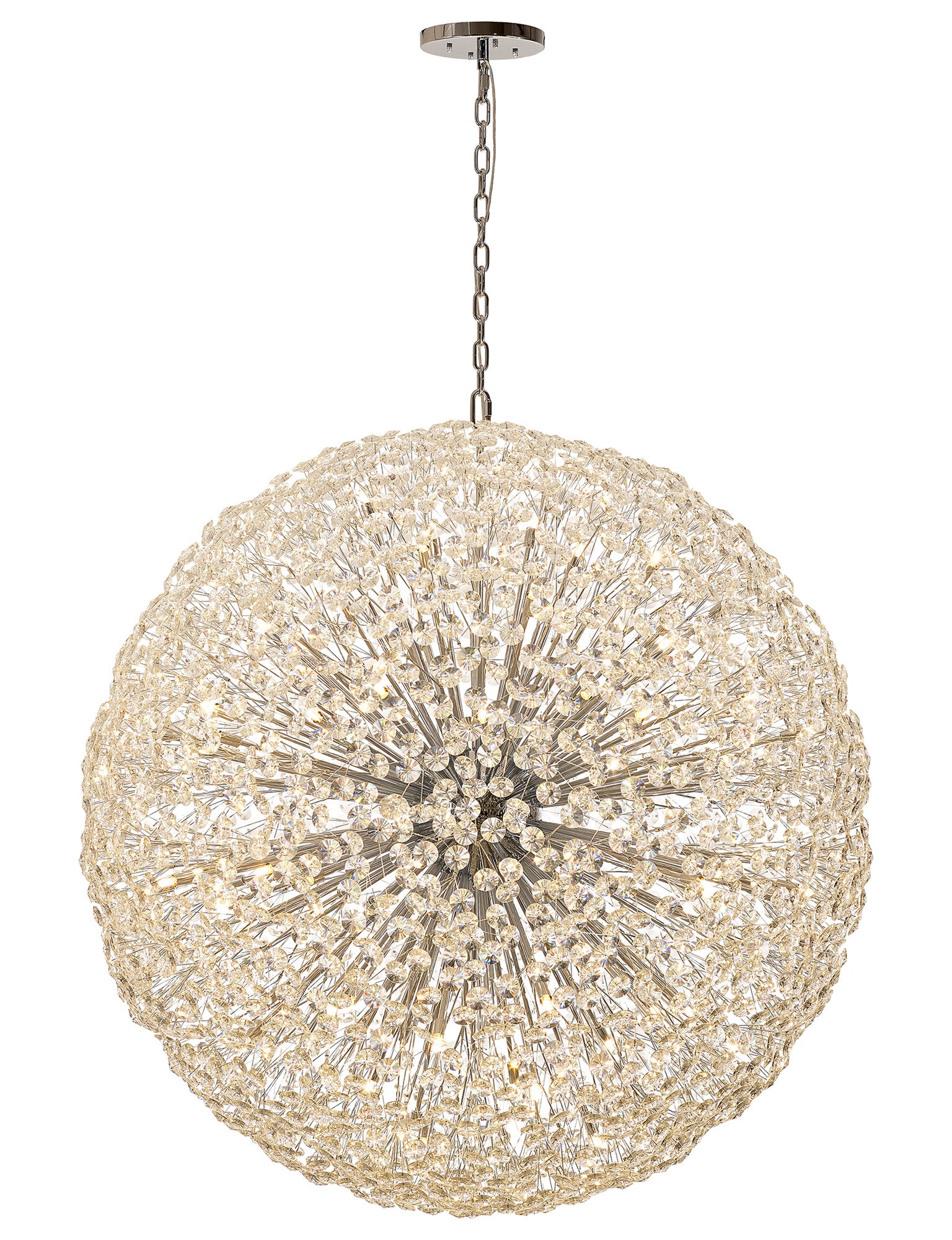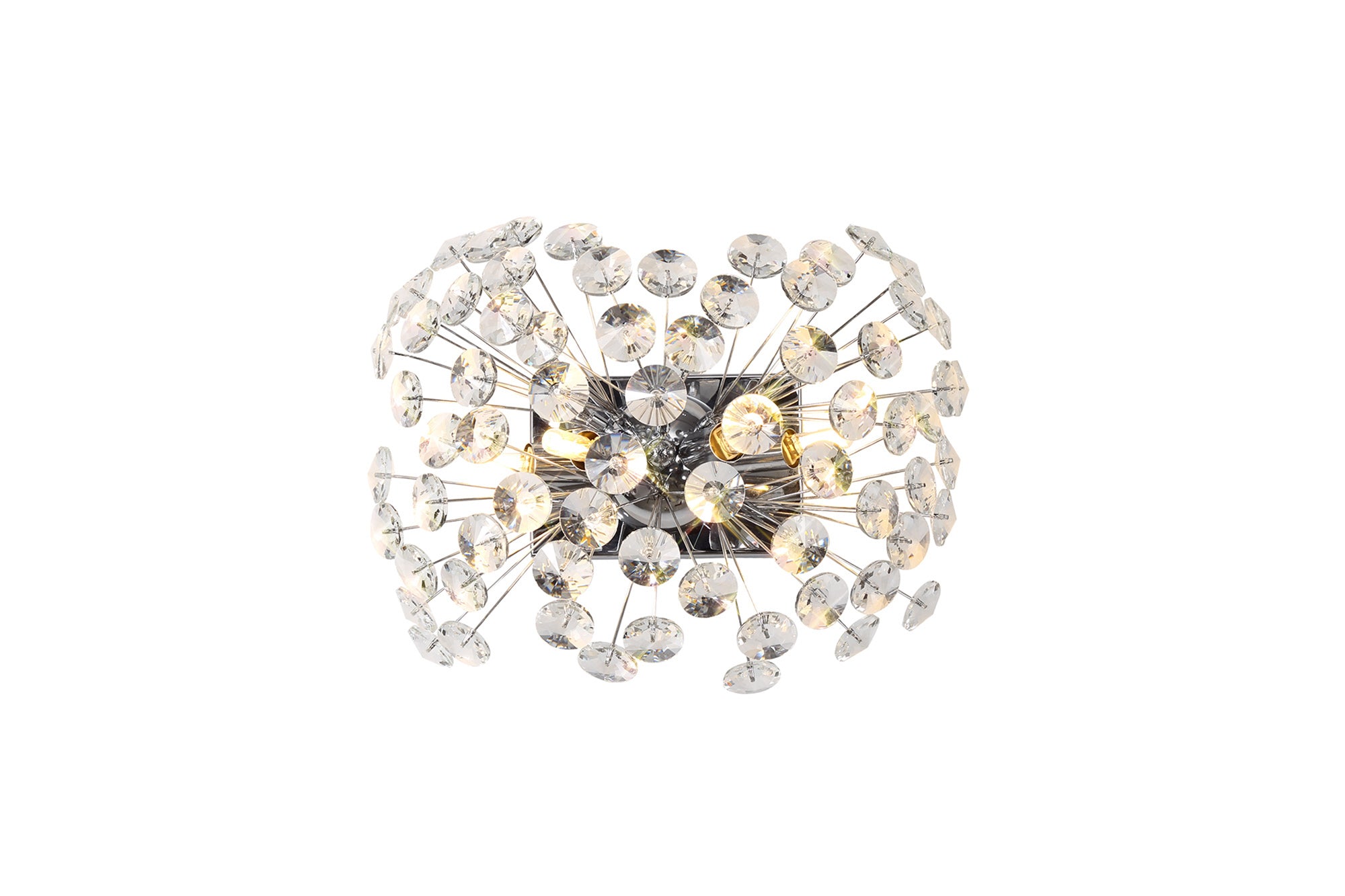 This stunning collection features slim, erratically angled stems that create a captivating cluster of clear crystal disks. The central framework comes in round, tiered, and oblong linear pendant designs, making each piece a striking addition to any space.