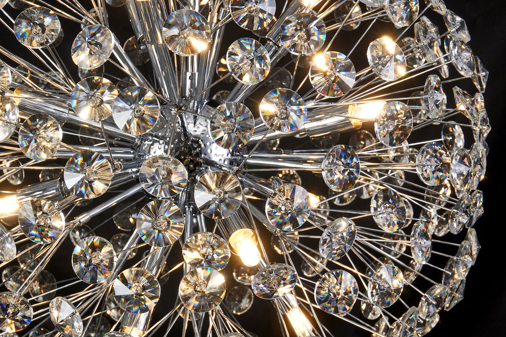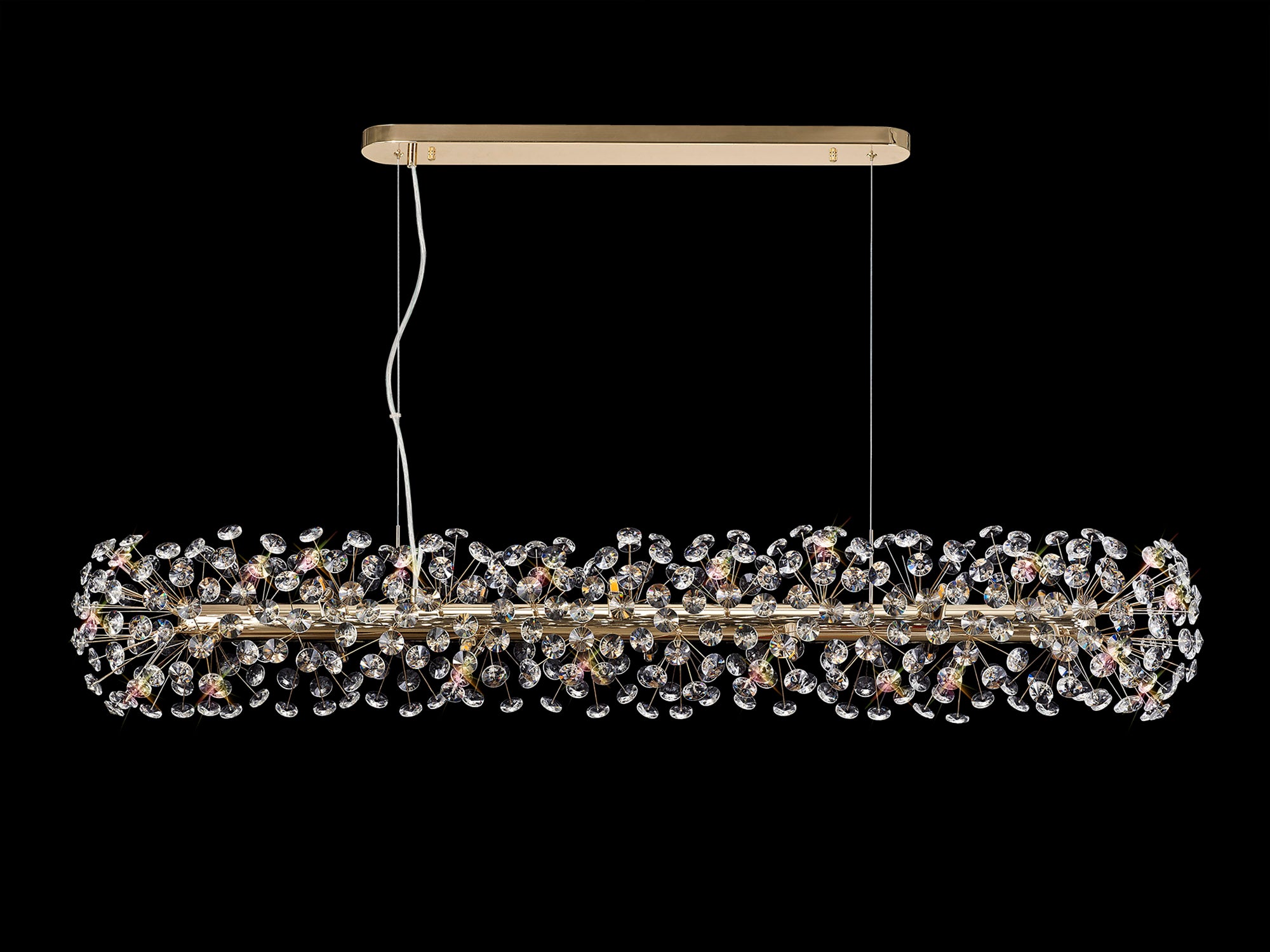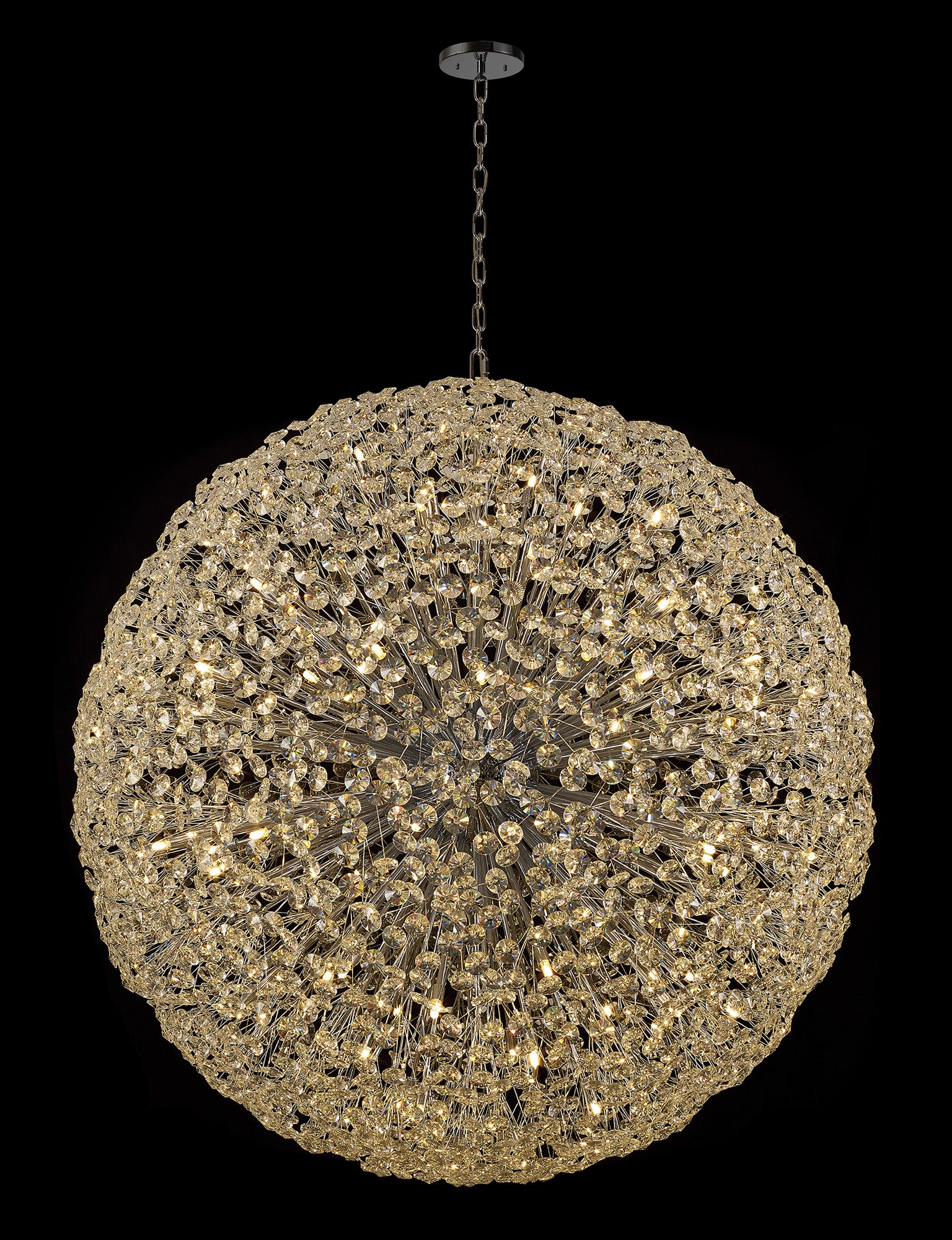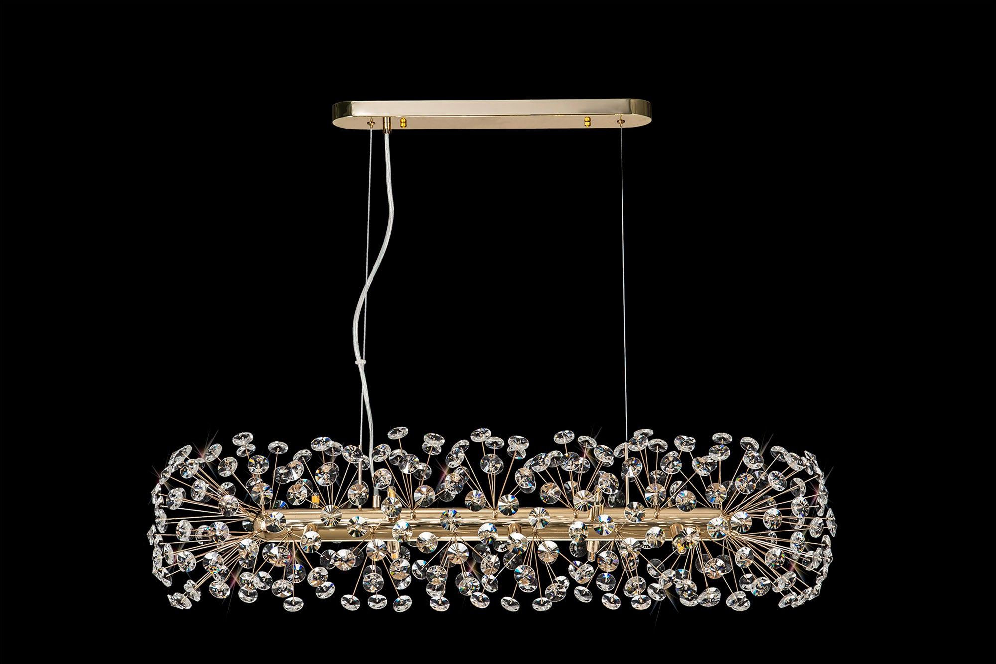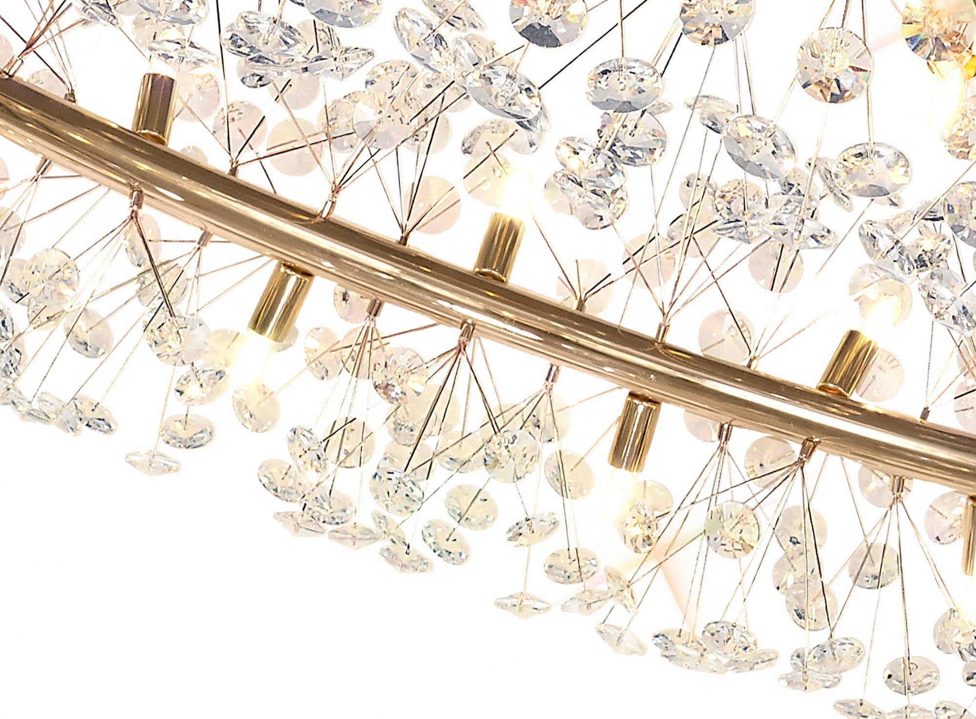 This stunning collection features slim, erratically angled stems that create a captivating cluster of clear crystal disks. The central framework comes in round, tiered, and oblong linear pendant designs, making each piece a striking addition to any space.
