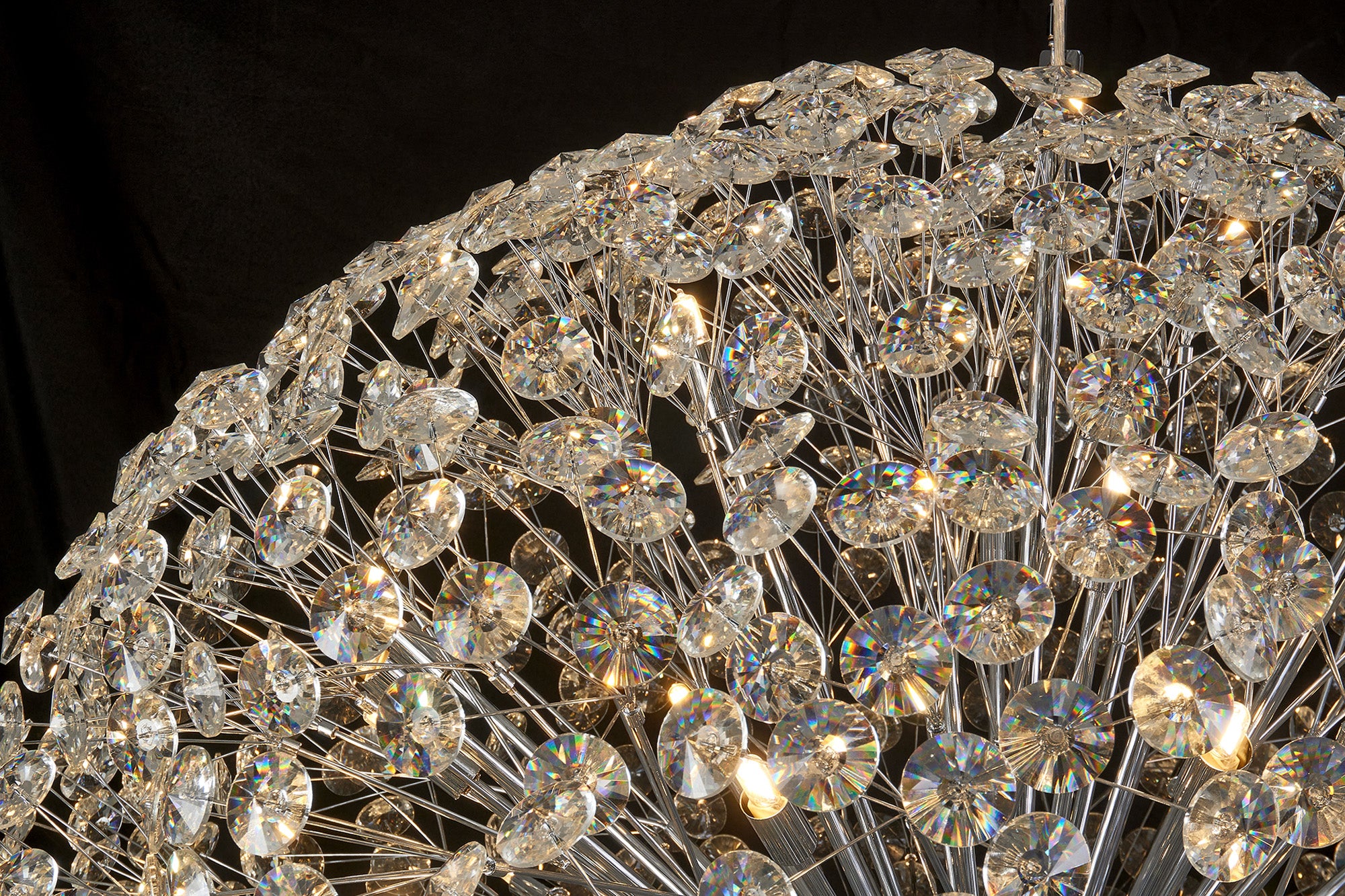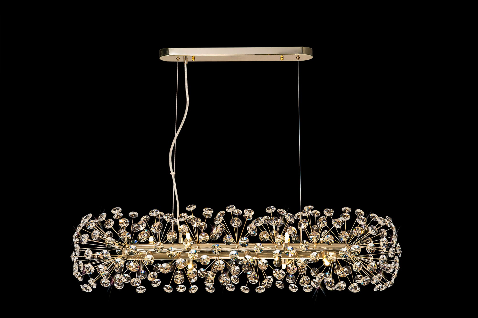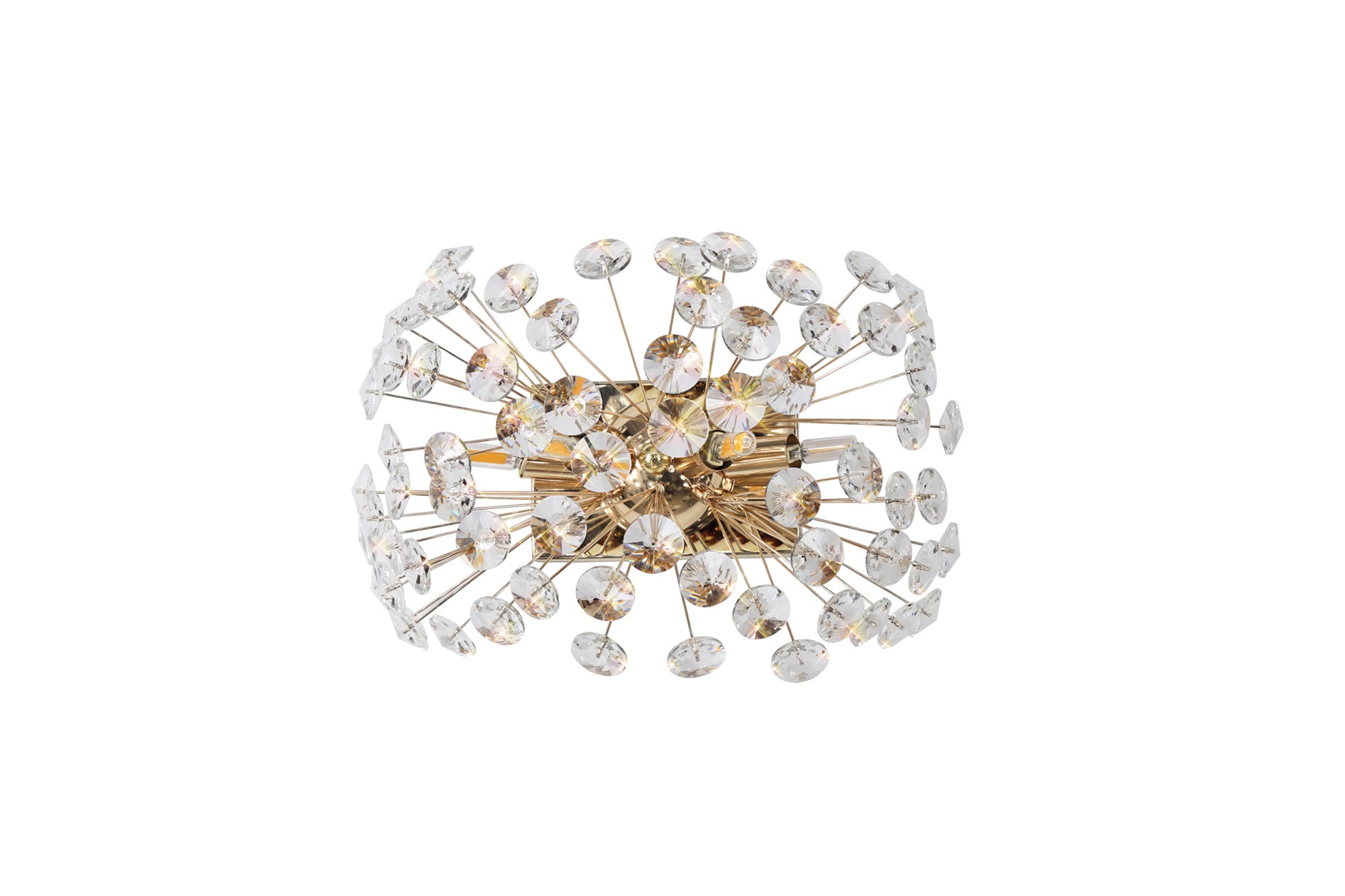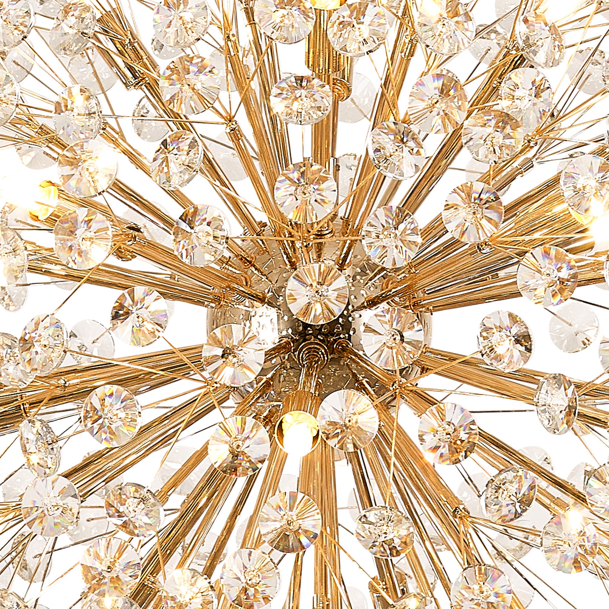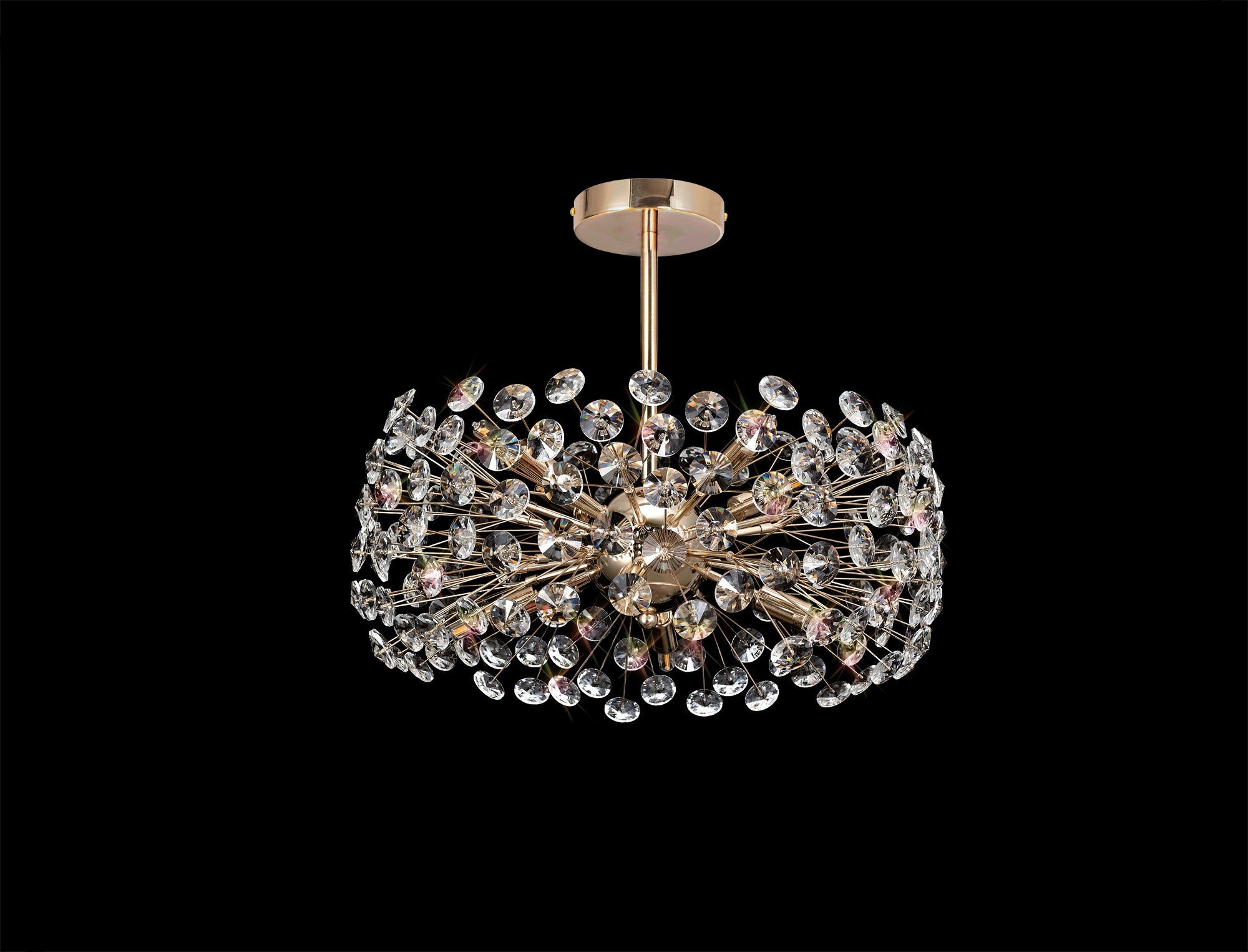 This stunning collection features slim, erratically angled stems that create a captivating cluster of clear crystal disks. The central framework comes in round, tiered, and oblong linear pendant designs, making each piece a striking addition to any space.