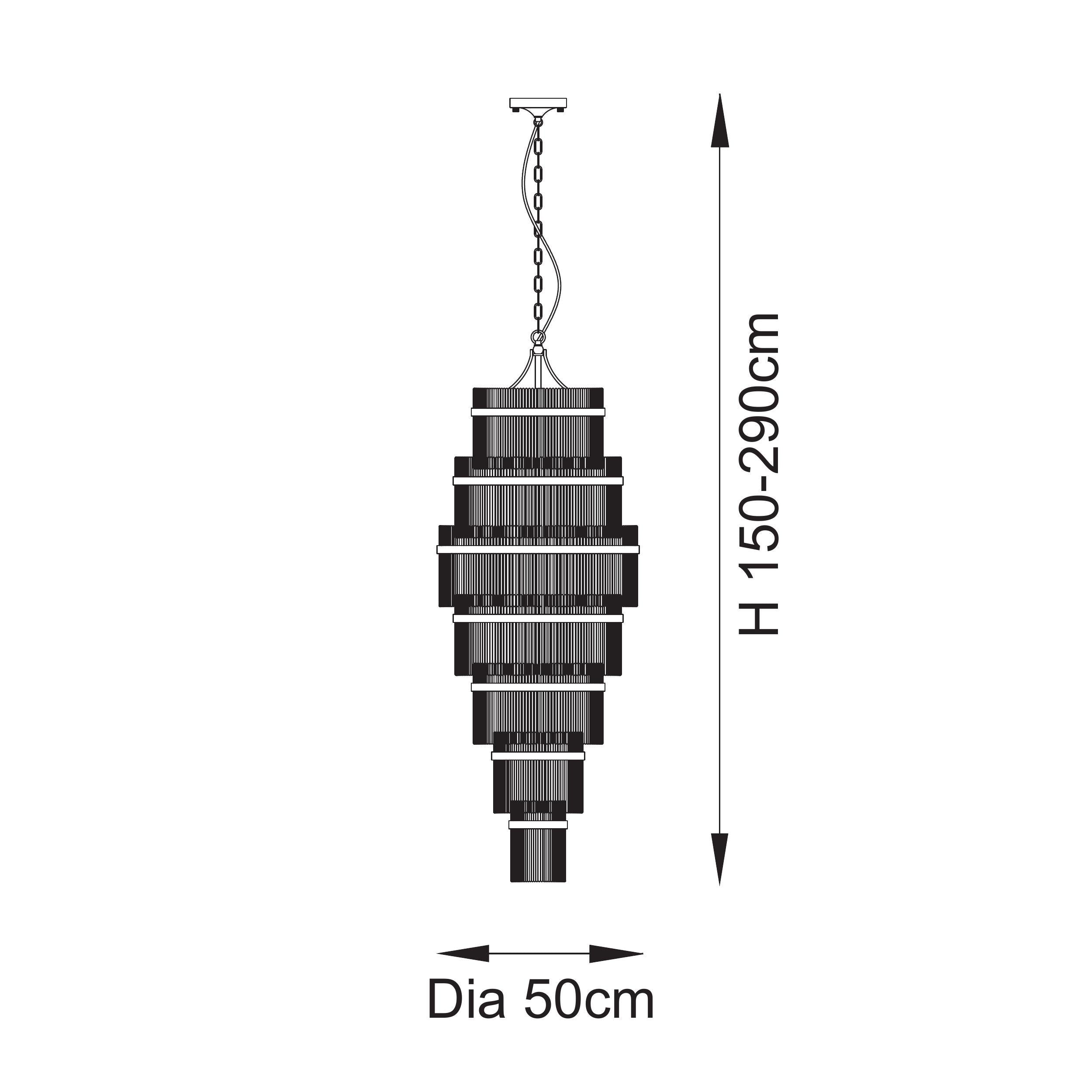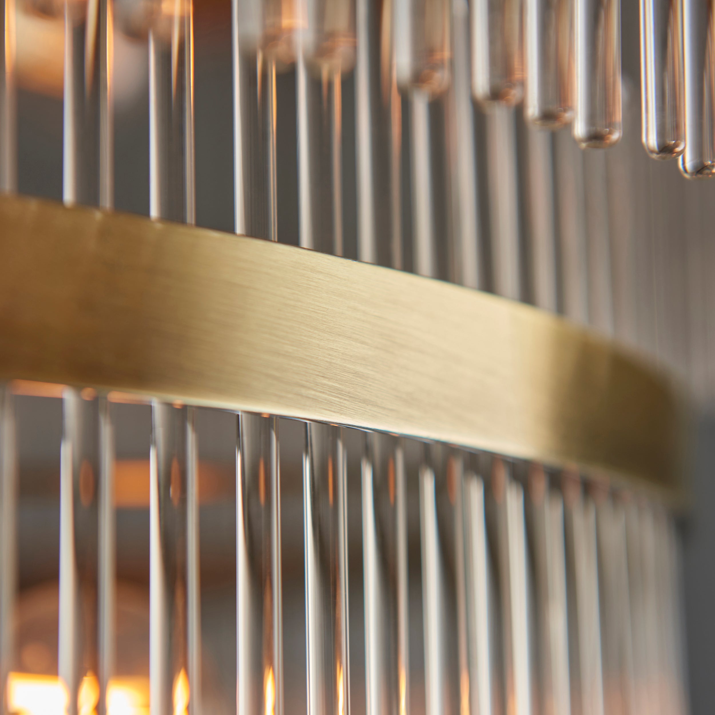 Create an impressive statement with this large 21 light multi tiered glass pendant, perfect for stairwells and high ceiling interiors. Finished in antique brass and decorated with clear glass rods that delicately diffuse the light, creating that classic iconic look.