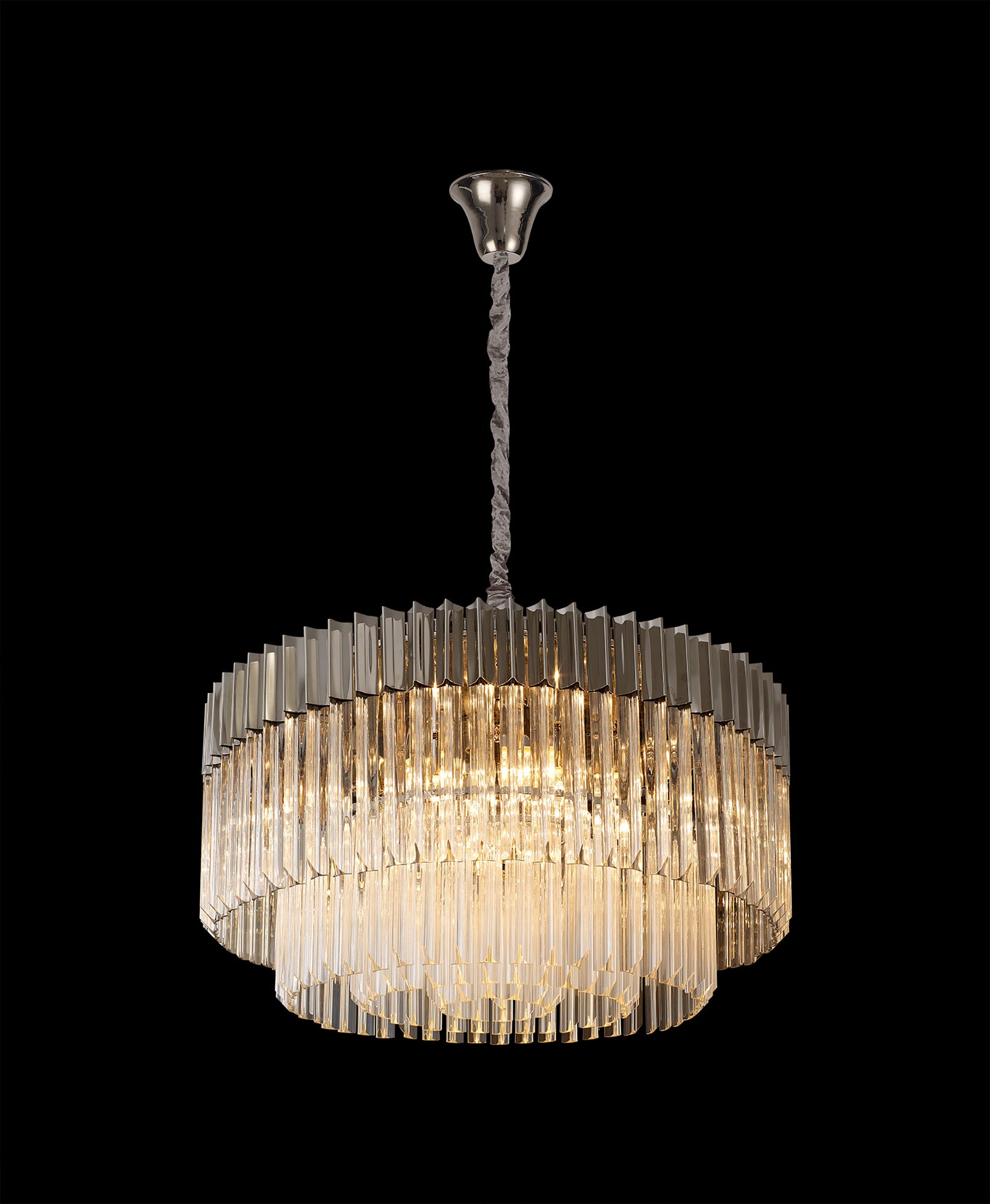 The popularity of the Knightsbridge collections initial release has been so overwhelming that the collection has now been extensively expanded to meet a wider range of specification needs. This contemporary design which originally combined a traditional brass finish with clear crystal glass pieces, now offers a polished nickel finish with either clear or smoked glass. The long angular shape of the glass which are in a tiered form, can now be found on larger more dramatic designs including a five tier and rectangular pendant to name only a few. Knightsbridge has a traditional noble effect composed with modern materials to create a range suitable for either a modern or more traditional room setting. The unique pyramid forms protruding from the frame provide an intriguing overall shape across this comprehensive collection.