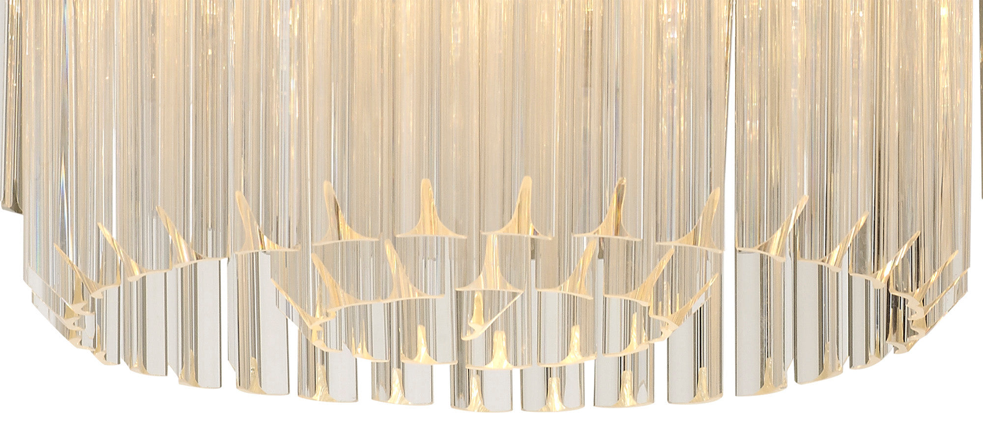 The popularity of the Knightsbridge collections initial release has been so overwhelming that the collection has now been extensively expanded to meet a wider range of specification needs. This contemporary design which originally combined a traditional brass finish with clear crystal glass pieces, now offers a polished nickel finish with either clear or smoked glass. The long angular shape of the glass which are in a tiered form, can now be found on larger more dramatic designs including a five tier and rectangular pendant to name only a few. Knightsbridge has a traditional noble effect composed with modern materials to create a range suitable for either a modern or more traditional room setting. The unique pyramid forms protruding from the frame provide an intriguing overall shape across this comprehensive collection.