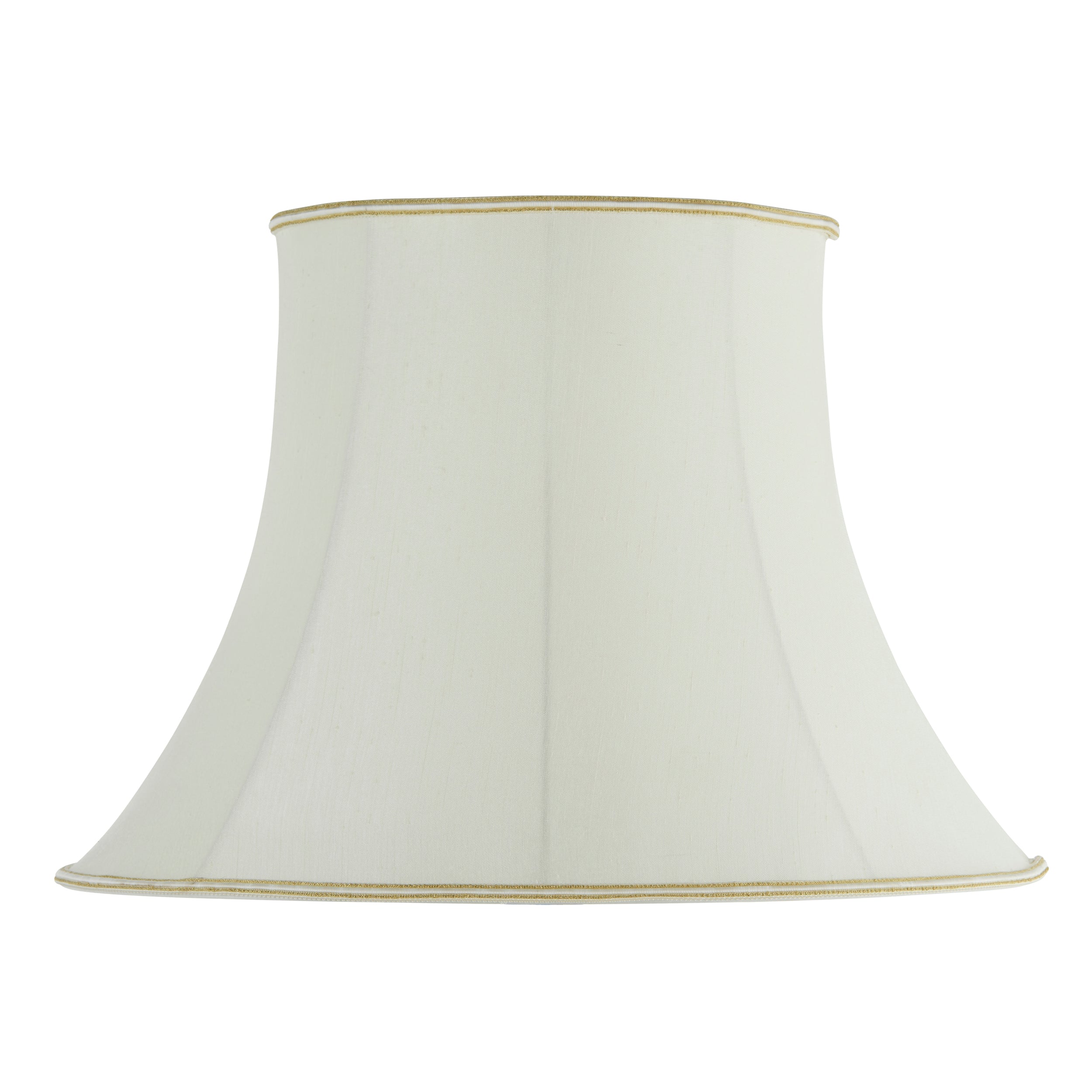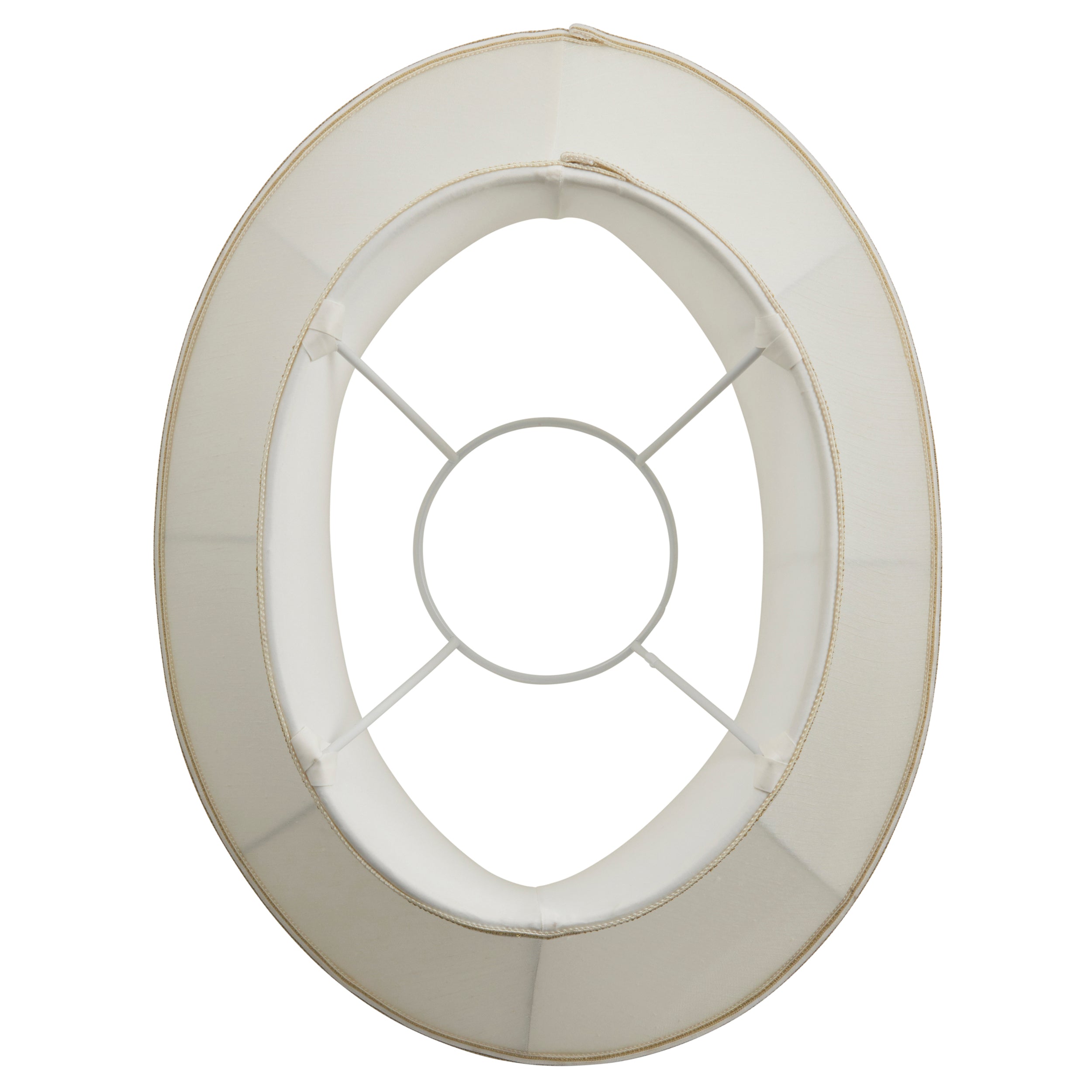 The 20 inch Celia handmade lamp shade is a balloon lined bowed oval in a cream fabric with a subtle woven trim on the top and bottom edges. Available in a choice of sizes