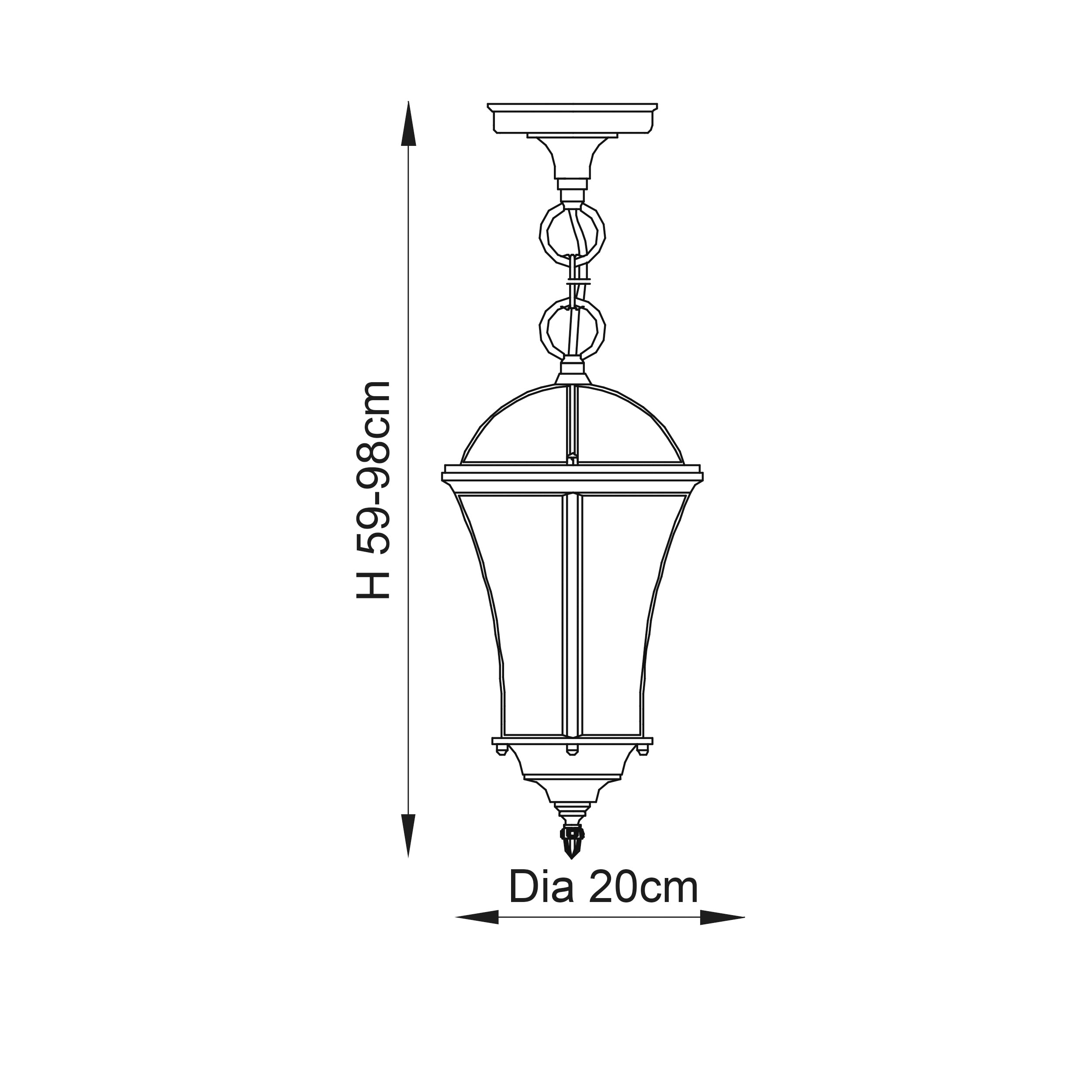 A traditional die cast aluminium hanging lantern with a matt black finish. It is IP44 rated so is suitable for outdoor use, and both dimmable and suitable for use with LED lamps. Others available in this range