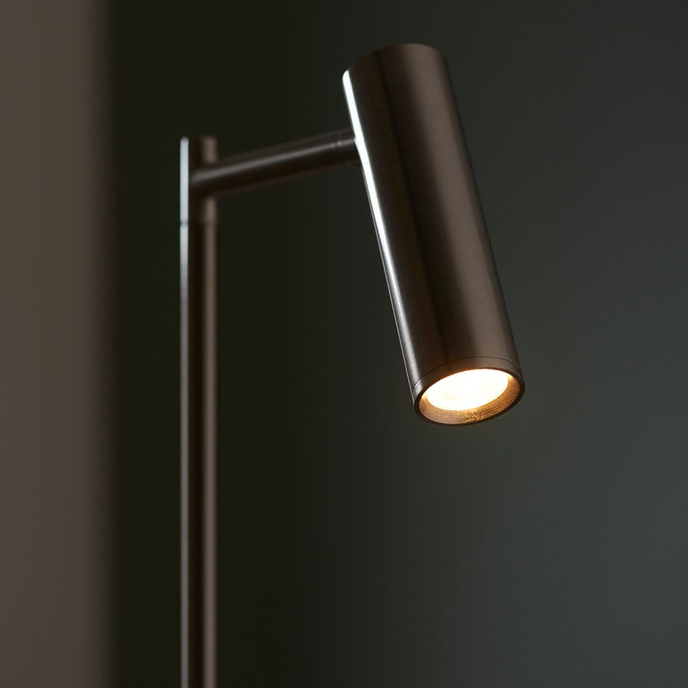 Modern reader floor lamp in stylish satin nickel finish with fully adjustable head; the ideal sofa or comfy chair companion. Direct the light exactly where you need it to be and adjust the brightness with easy to reach push button with 3 stage dimmer function. Other finishes available.
