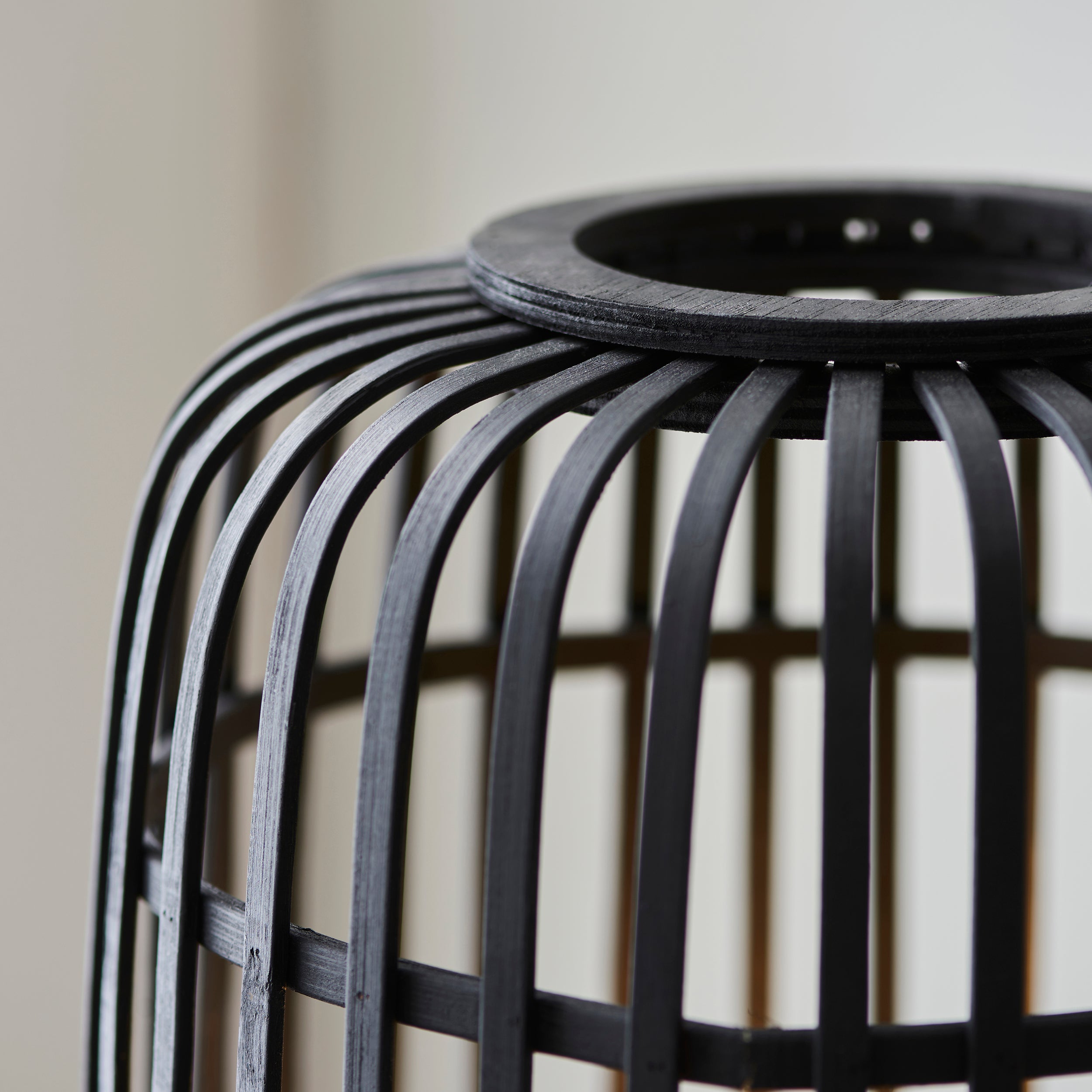 A simple and stylish floor light inspired by nature, with sustainably sourced dark bamboo cage, creating a soft warm light. Finished with matt black paint and dark wood detailing.
