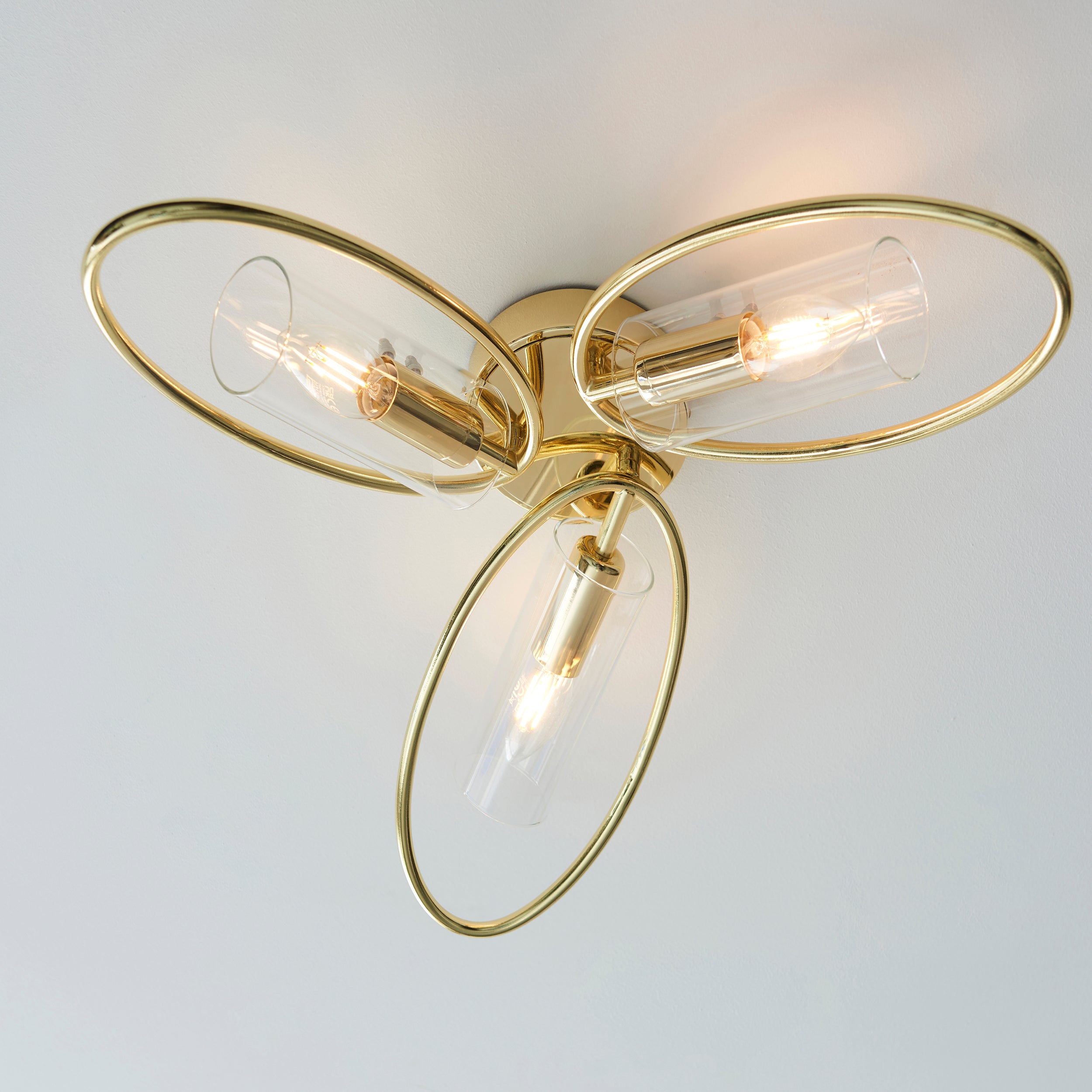 Clear glass framed by a soft modern ellipse shape in polished brass plate. A dimmable semi flush perfect for low ceilings. Other colour way also available.