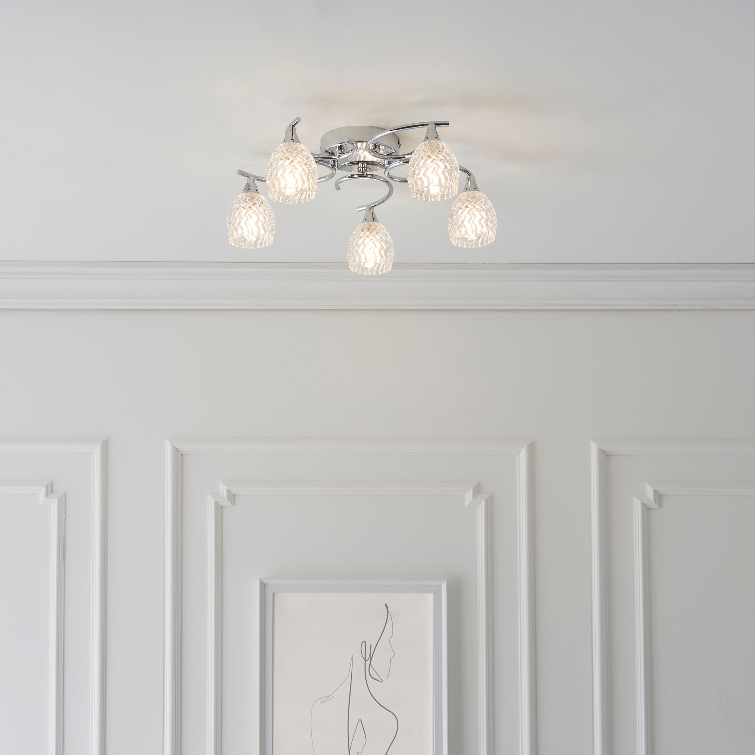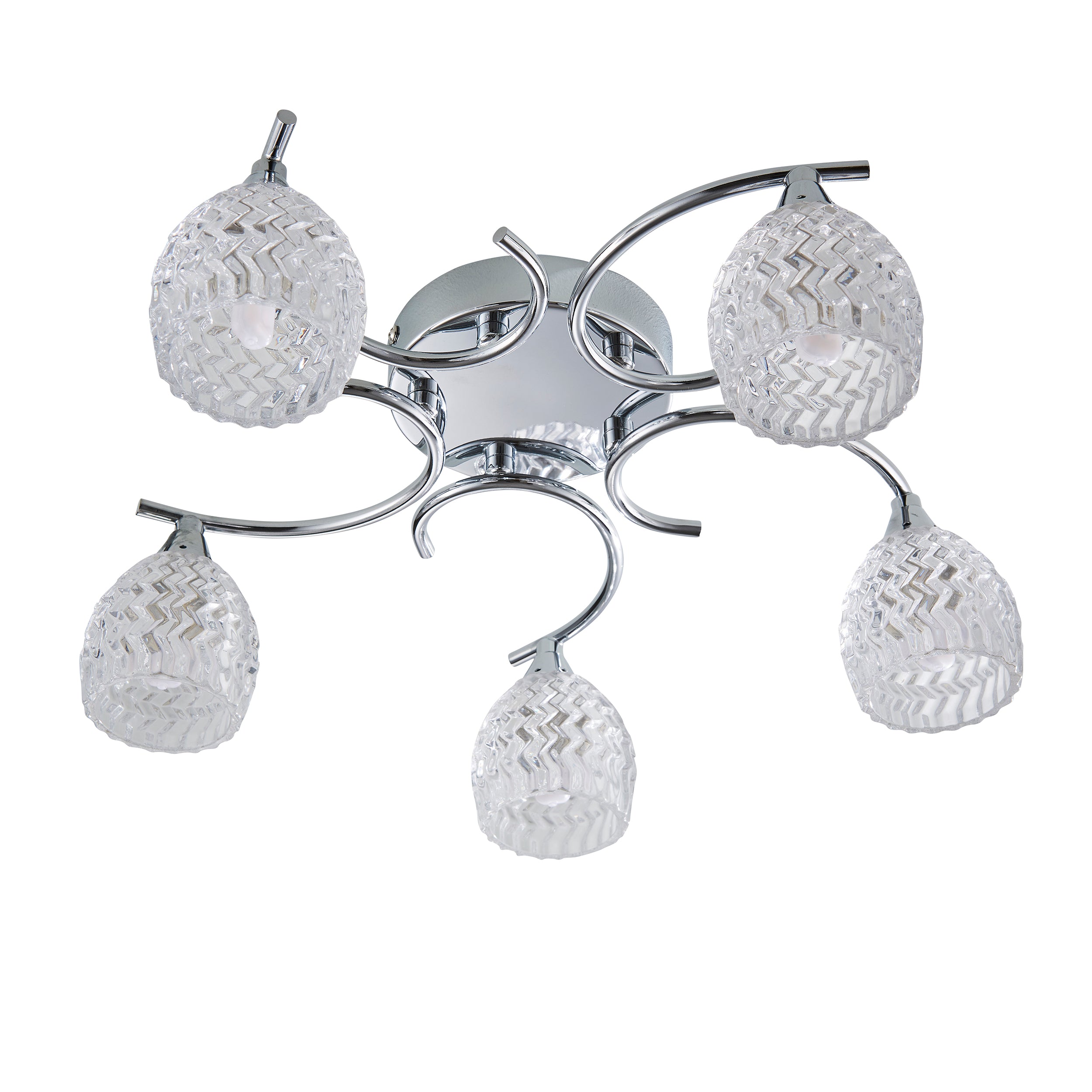 A 5 light flush ceiling fitting with curved metal arms in a chrome finish, and cut glass shades. suitable for use with LED lamps and dimmable. Matching items and other colour options available