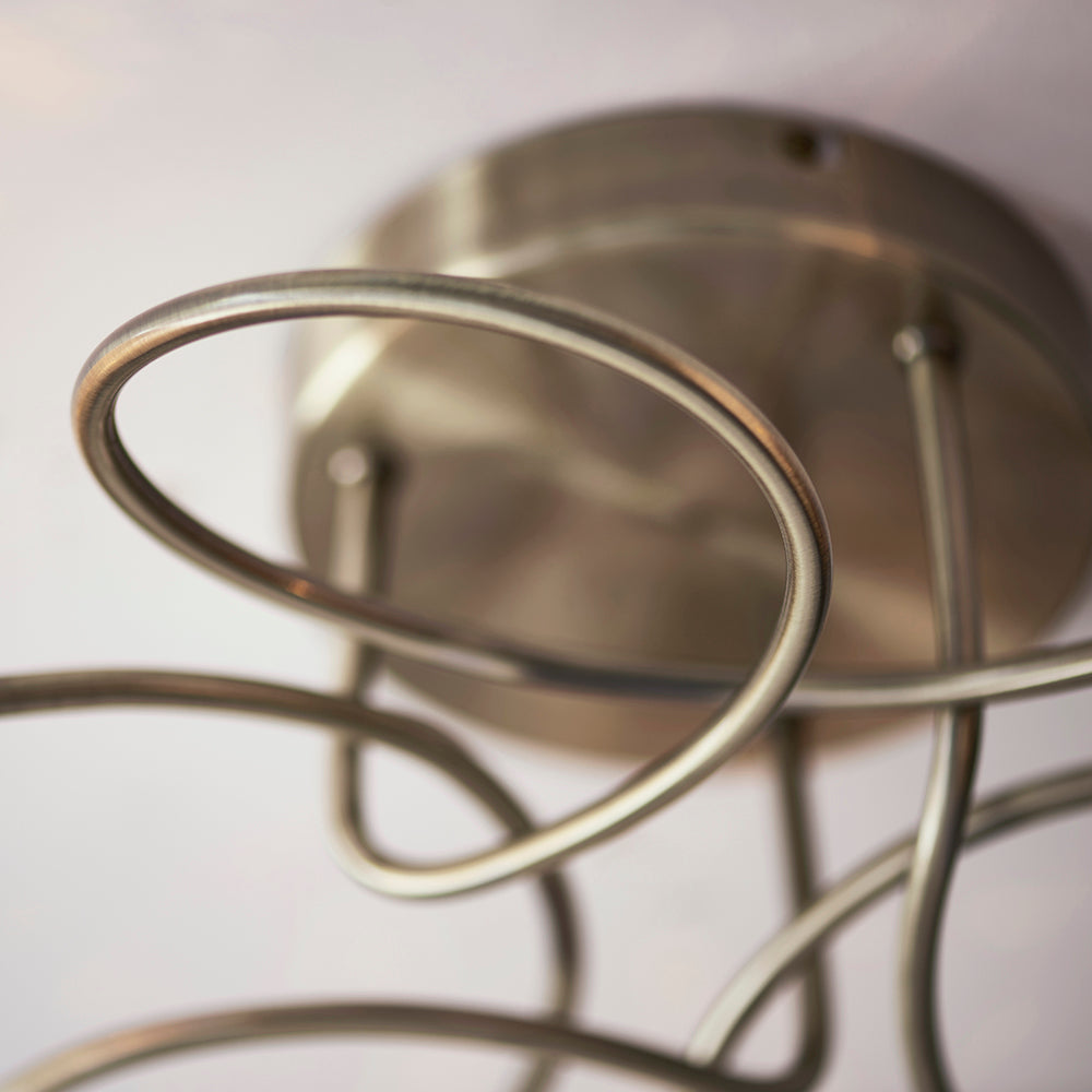 Modern design with a nod to the classic. Confetti glass is set amongst designer intertwined arms for antique brass plate finish flush light; perfect for low ceilings.