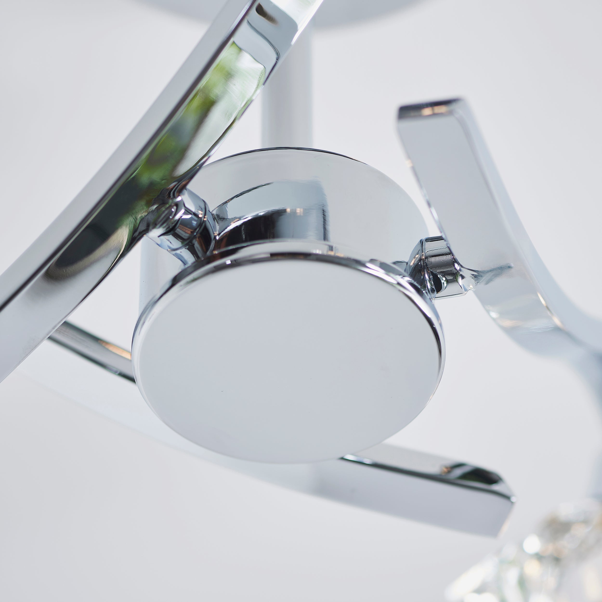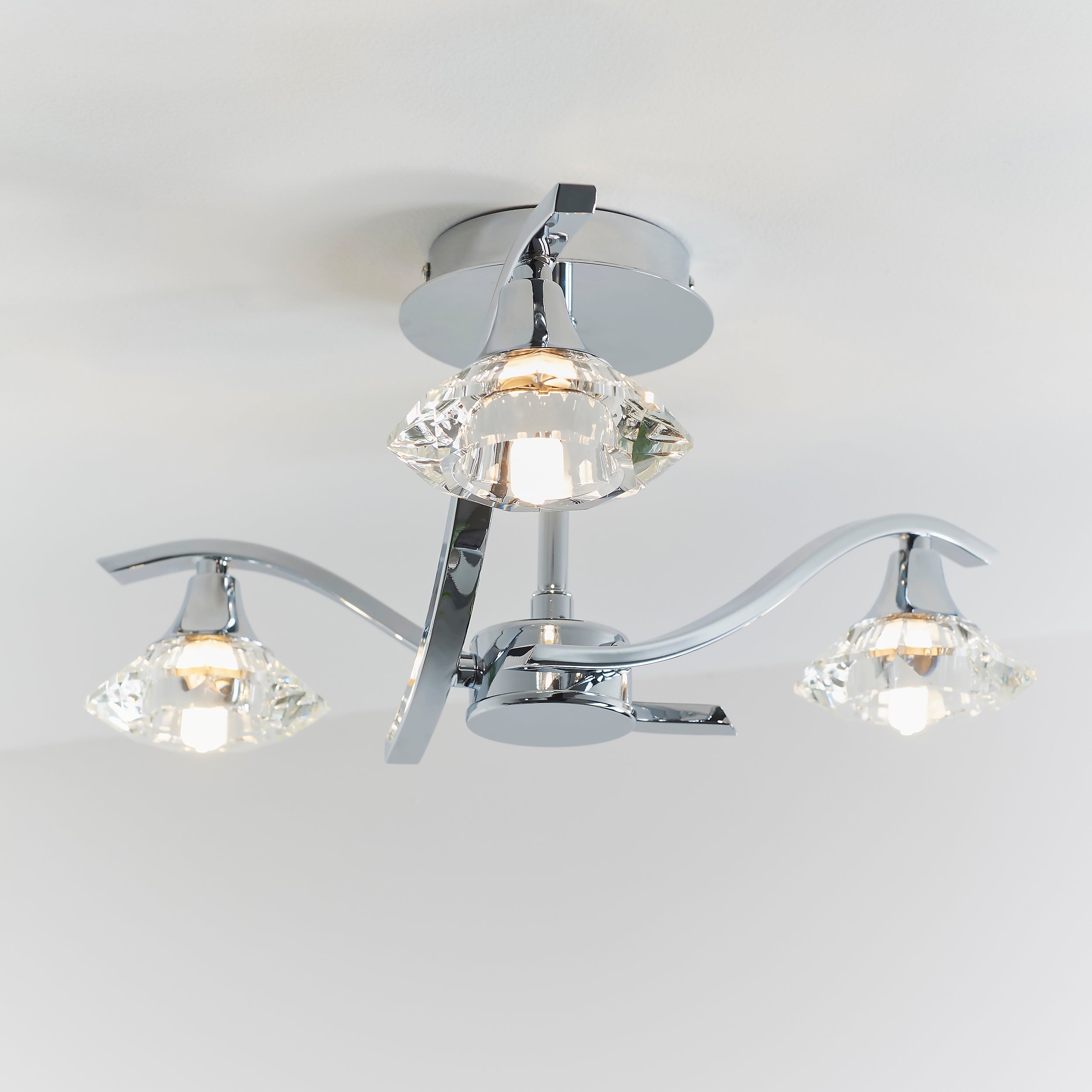The Langella 3 light semi flush is finished in chrome effect with clear crystal shades. This fitting is dimmable and suitable for use with LED lamps. Other finishes and ceiling, wall, table and floor options also available