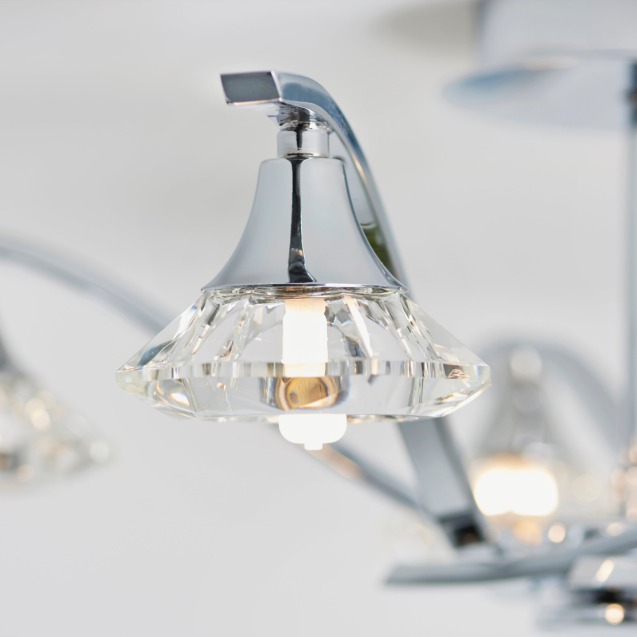 The Langella 5 light semi flush is finished in chrome effect with clear crystal shades. This fitting is dimmable and suitable for use with LED lamps. Other finishes and ceiling, wall, table and floor options also available
