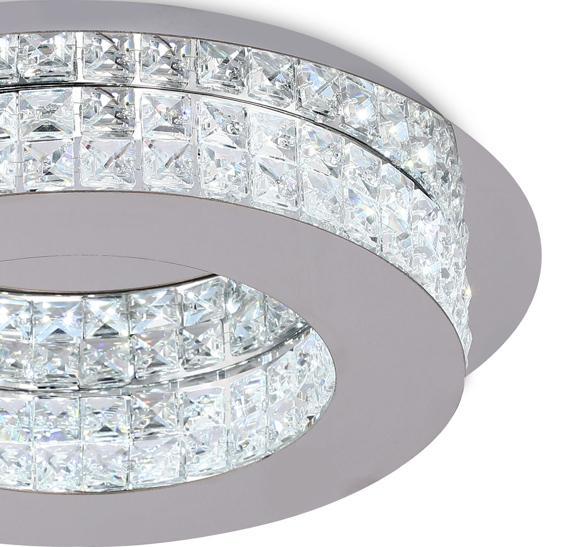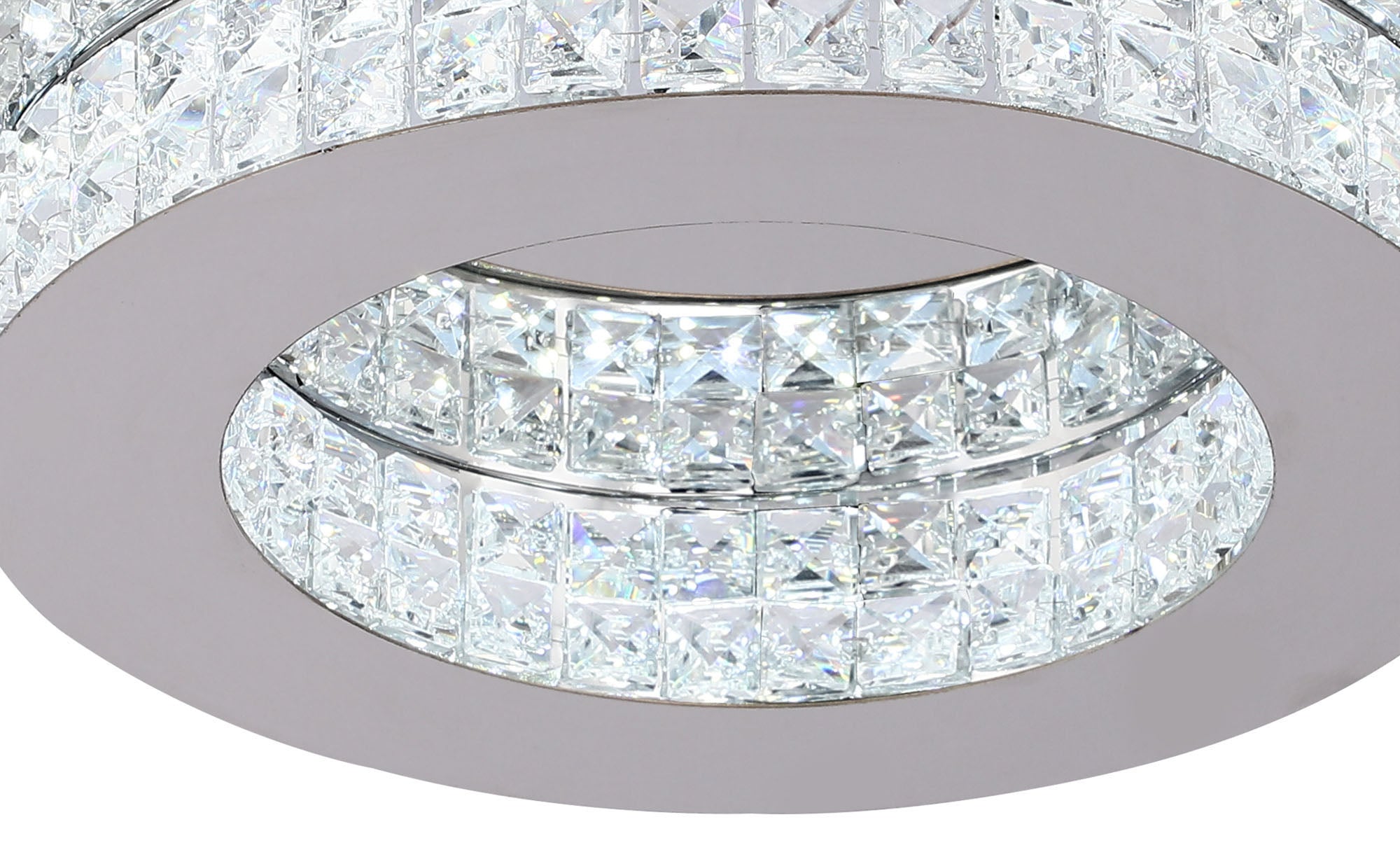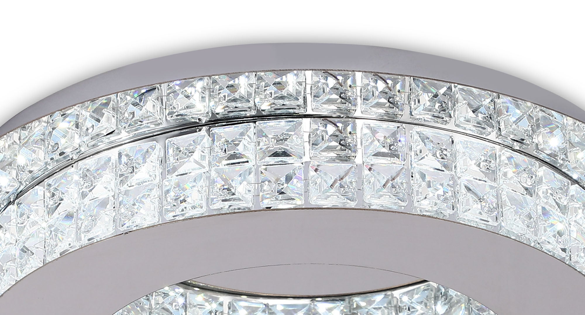 This stunning flush crystal ceiling light partners high quality clear crystal squares with a highly polished chrome finish to provide an enticing modern fitting. The light given from the integral 4000K LEDs refracts through the crystals producing subtle spectral ambience. The illumination is further amplified by the reflective mirror plate in the centre of the haler ring form of the framework. Cirenz is the ideal accompaniment to any stylish low ceiling living setting.