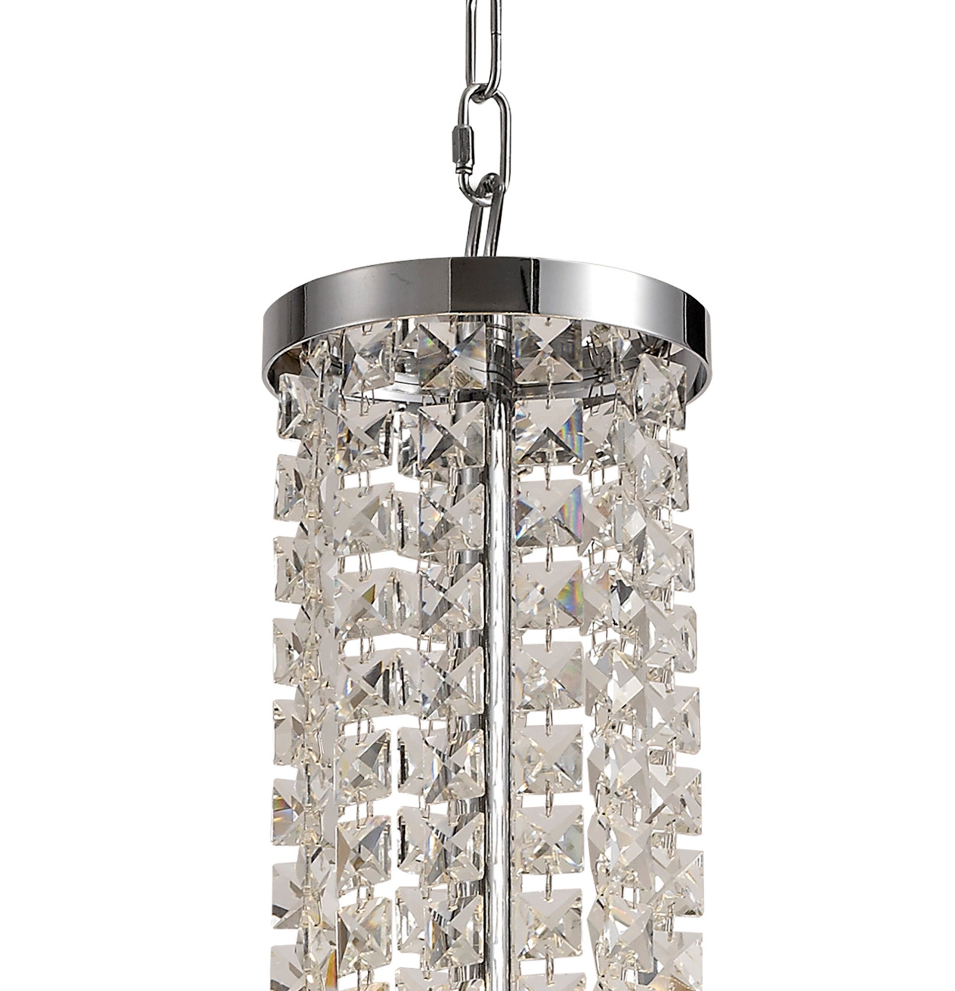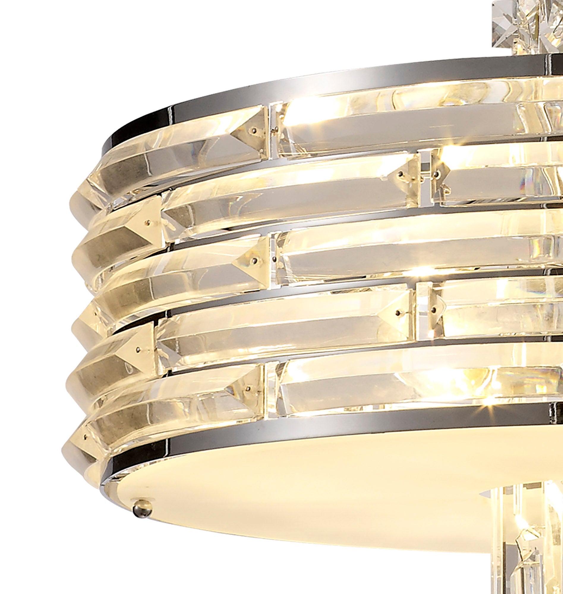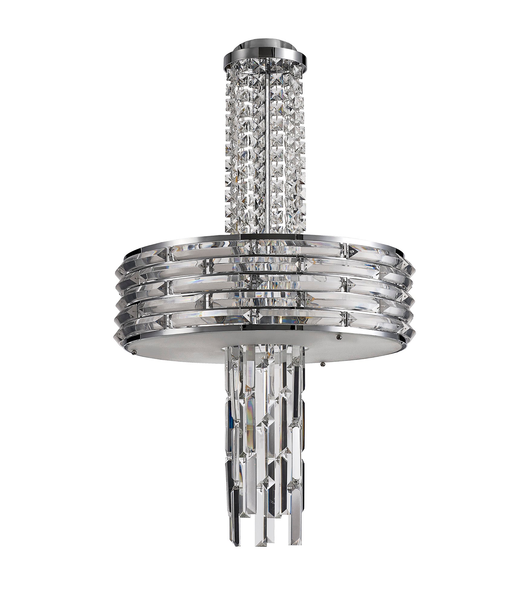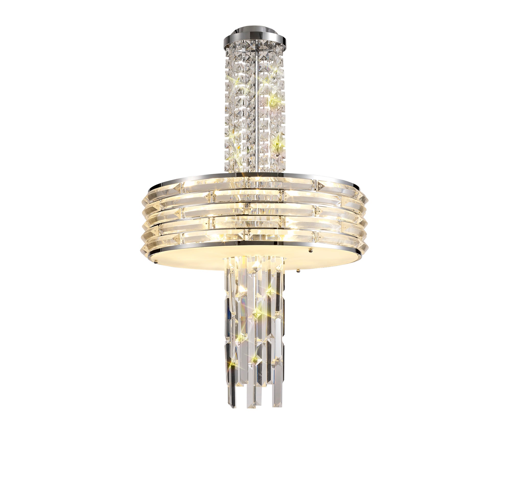 Kensington is an exquisite crystal fixture combining a variety of different high quality crystal components to amplify its distinctive presence. This ultra-modern creation begins with a waterfall of square crystal pieces stopping at the wider, originally formed frame with curved rows of long slim rectangular crystals inserted into minimalistic polished chrome metalwork. This section conceals the E14 lampholders which can take a maximum of 40W. The cascading crystals resume beneath the frosted diffuser transforming from square pieces into more substantial rectangular crystals. Kensington's intricate facets make a fascinating crystal pendant which can be converted into a semi ceiling light if required.