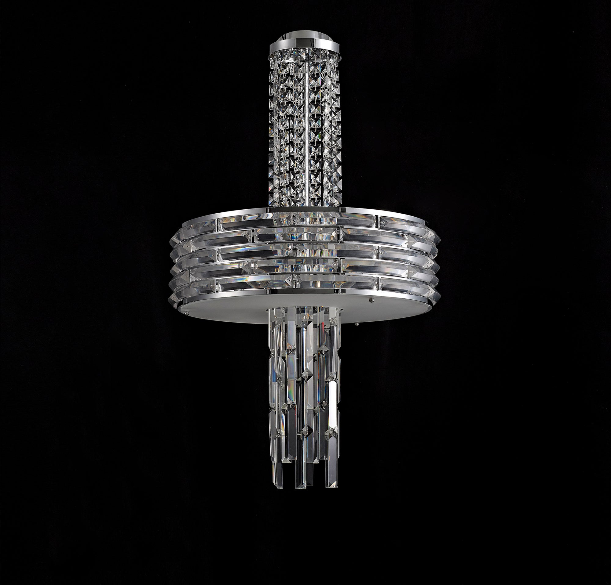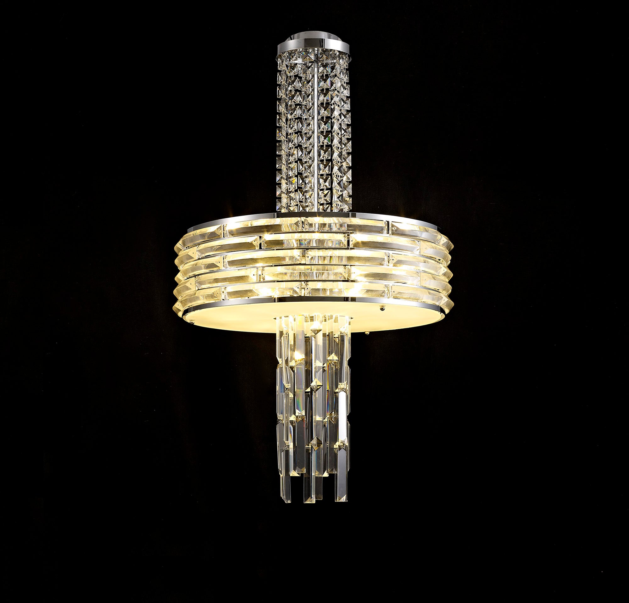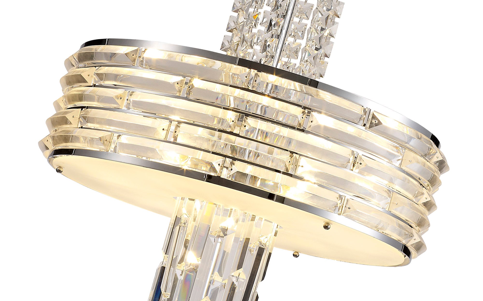 Kensington is an exquisite crystal fixture combining a variety of different high quality crystal components to amplify its distinctive presence. This ultra-modern creation begins with a waterfall of square crystal pieces stopping at the wider, originally formed frame with curved rows of long slim rectangular crystals inserted into minimalistic polished chrome metalwork. This section conceals the E14 lampholders which can take a maximum of 40W. The cascading crystals resume beneath the frosted diffuser transforming from square pieces into more substantial rectangular crystals. Kensington's intricate facets make a fascinating crystal pendant which can be converted into a semi ceiling light if required.