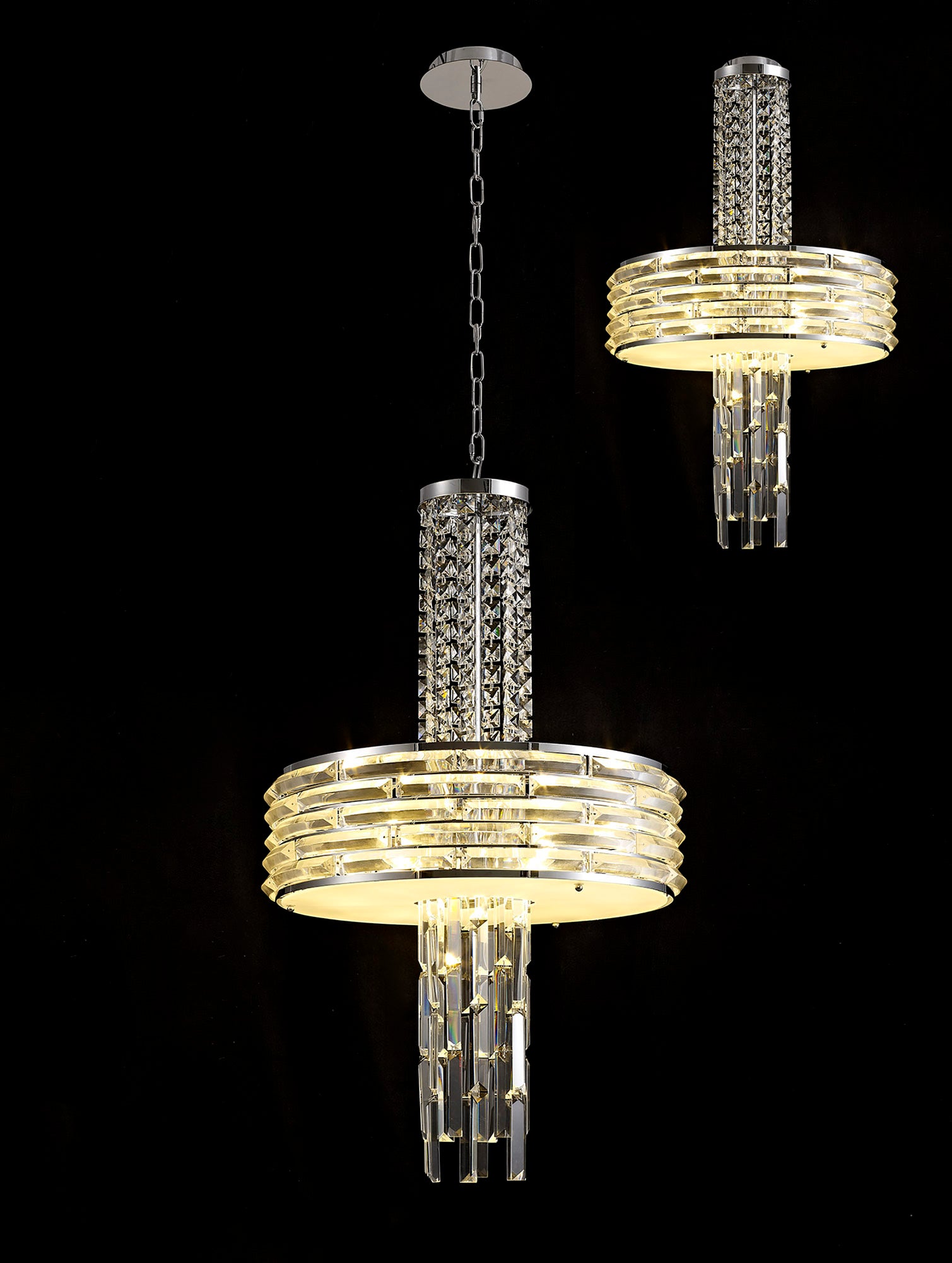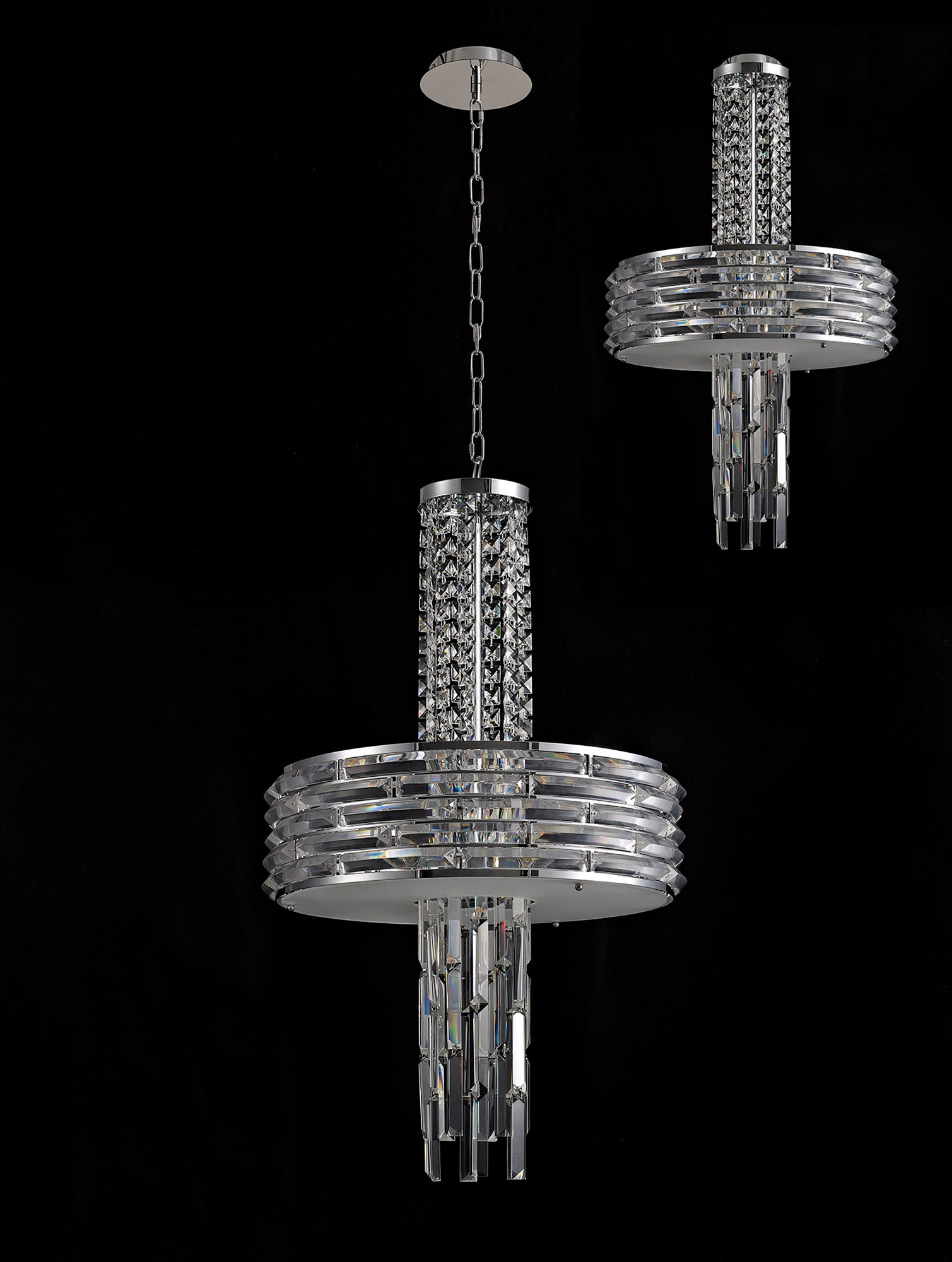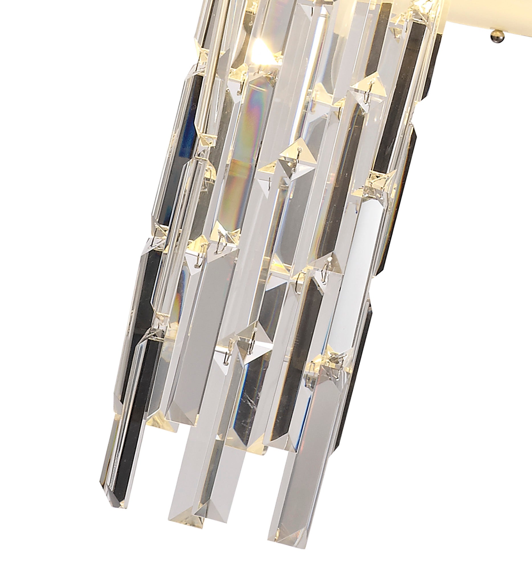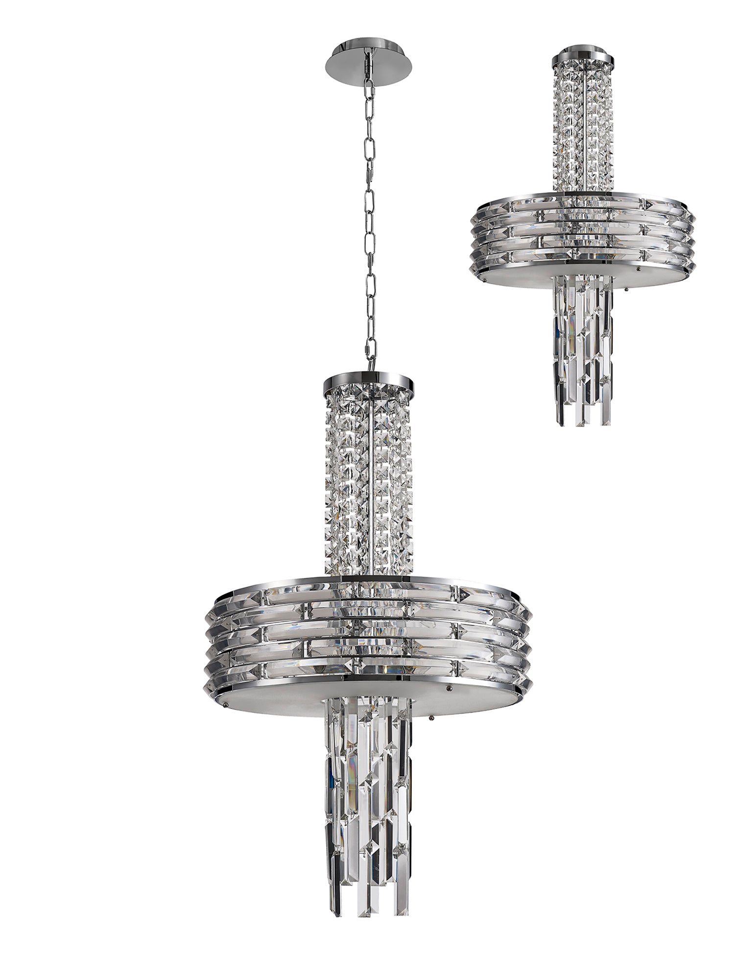 Kensington is an exquisite crystal fixture combining a variety of different high quality crystal components to amplify its distinctive presence. This ultra-modern creation begins with a waterfall of square crystal pieces stopping at the wider, originally formed frame with curved rows of long slim rectangular crystals inserted into minimalistic polished chrome metalwork. This section conceals the E14 lampholders which can take a maximum of 40W. The cascading crystals resume beneath the frosted diffuser transforming from square pieces into more substantial rectangular crystals. Kensington's intricate facets make a fascinating crystal pendant which can be converted into a semi ceiling light if required.