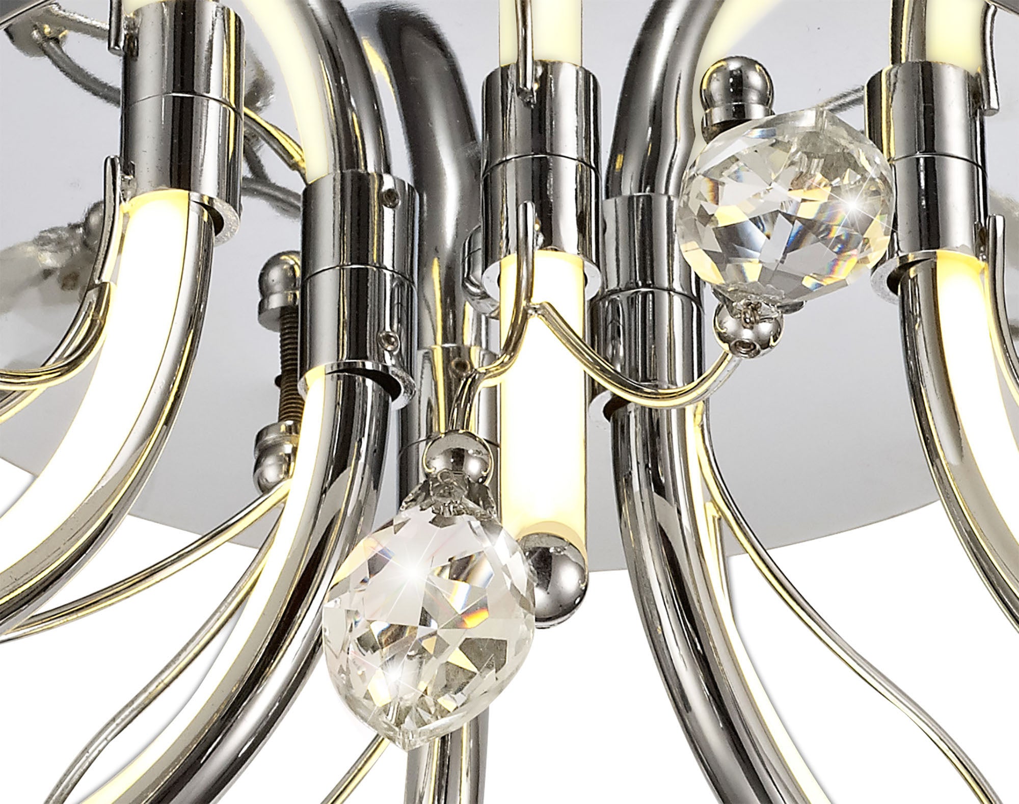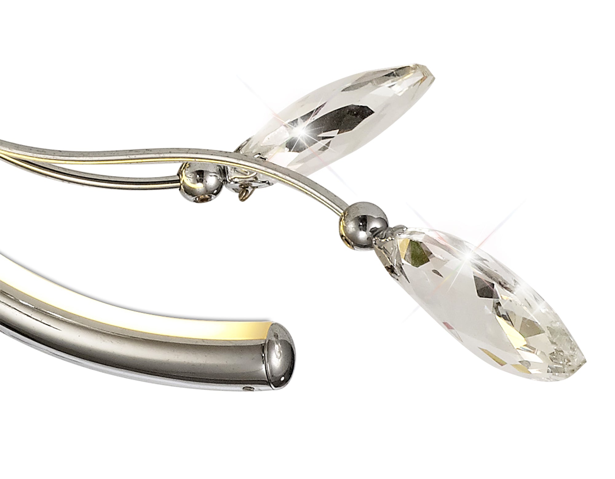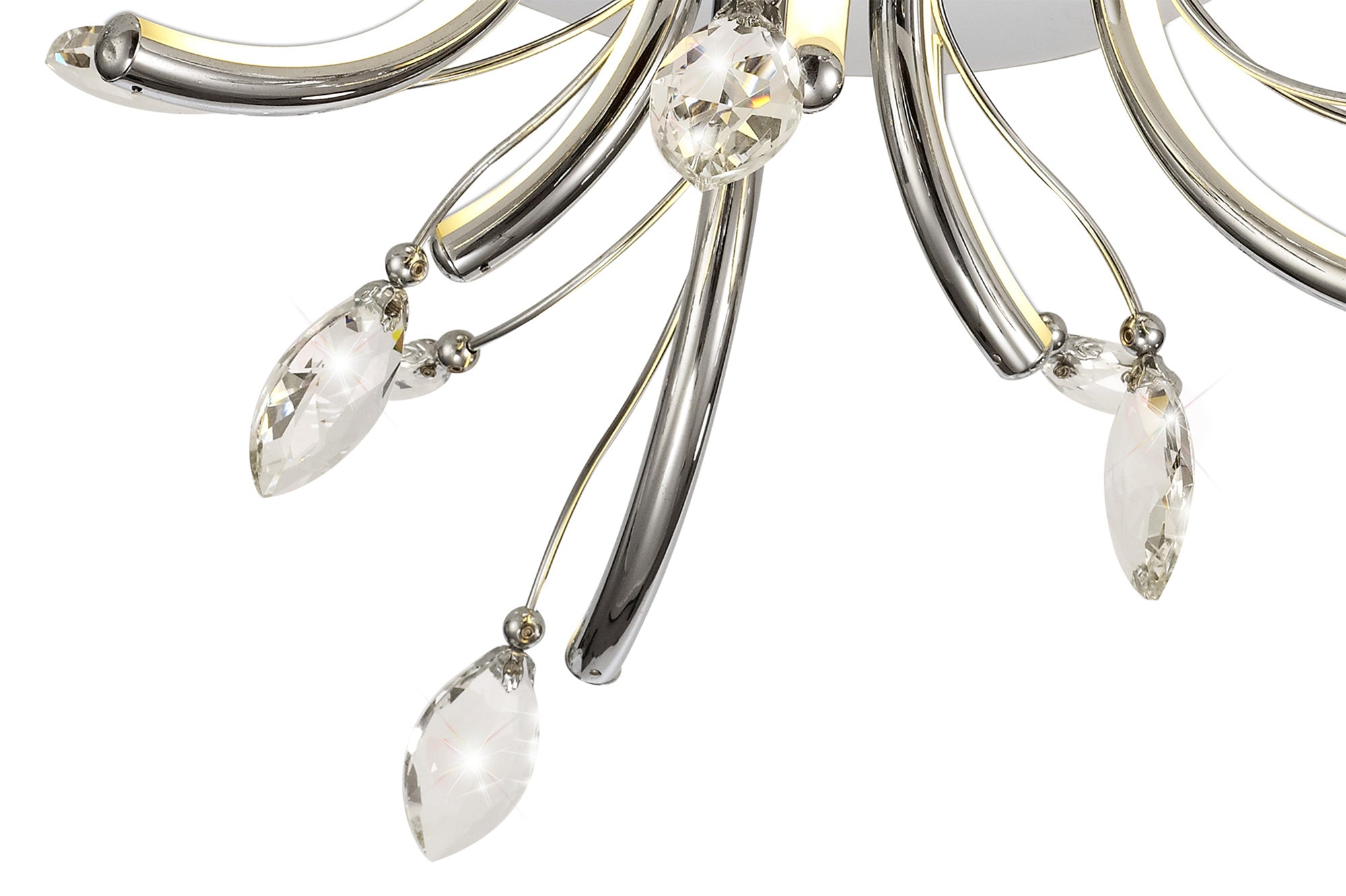 Cathrinee breaks away from the common methods of displaying integral LED lighting which have now become the norm for modern designs. The warm light from the LEDs are reflected throughout the fitting as a whole, diffused along the curved chrome arms protruding from the ceiling plate. The curvature of these arms first sending the light in an outwards direction then begins to throw the light at an upward angle. This ensures the leaf shaped clear crystals, fixed to the ends of the polished chrome waved stems, are enhanced by the LED light to produce a dazzling effect. With various lighting options available, Cathrinee's sophisticated elegance is striking even when unlit.