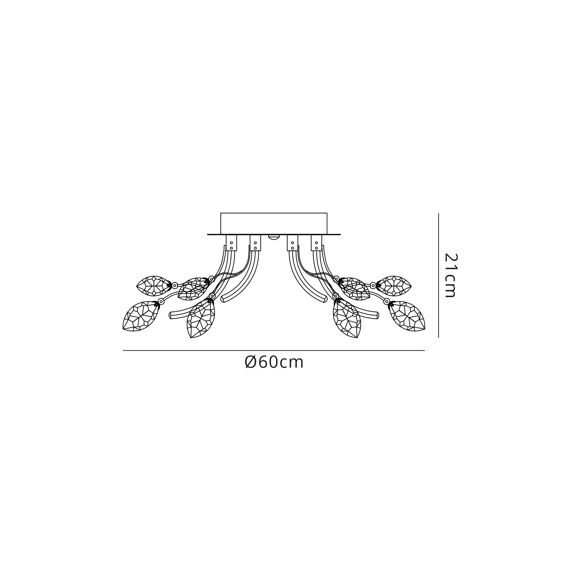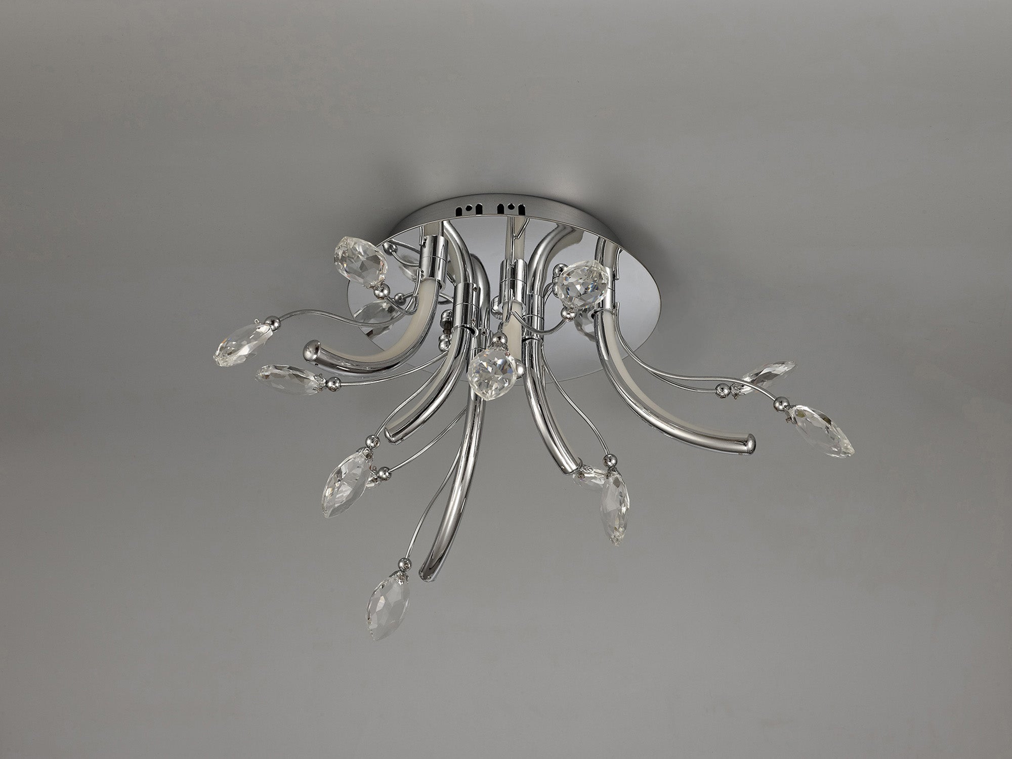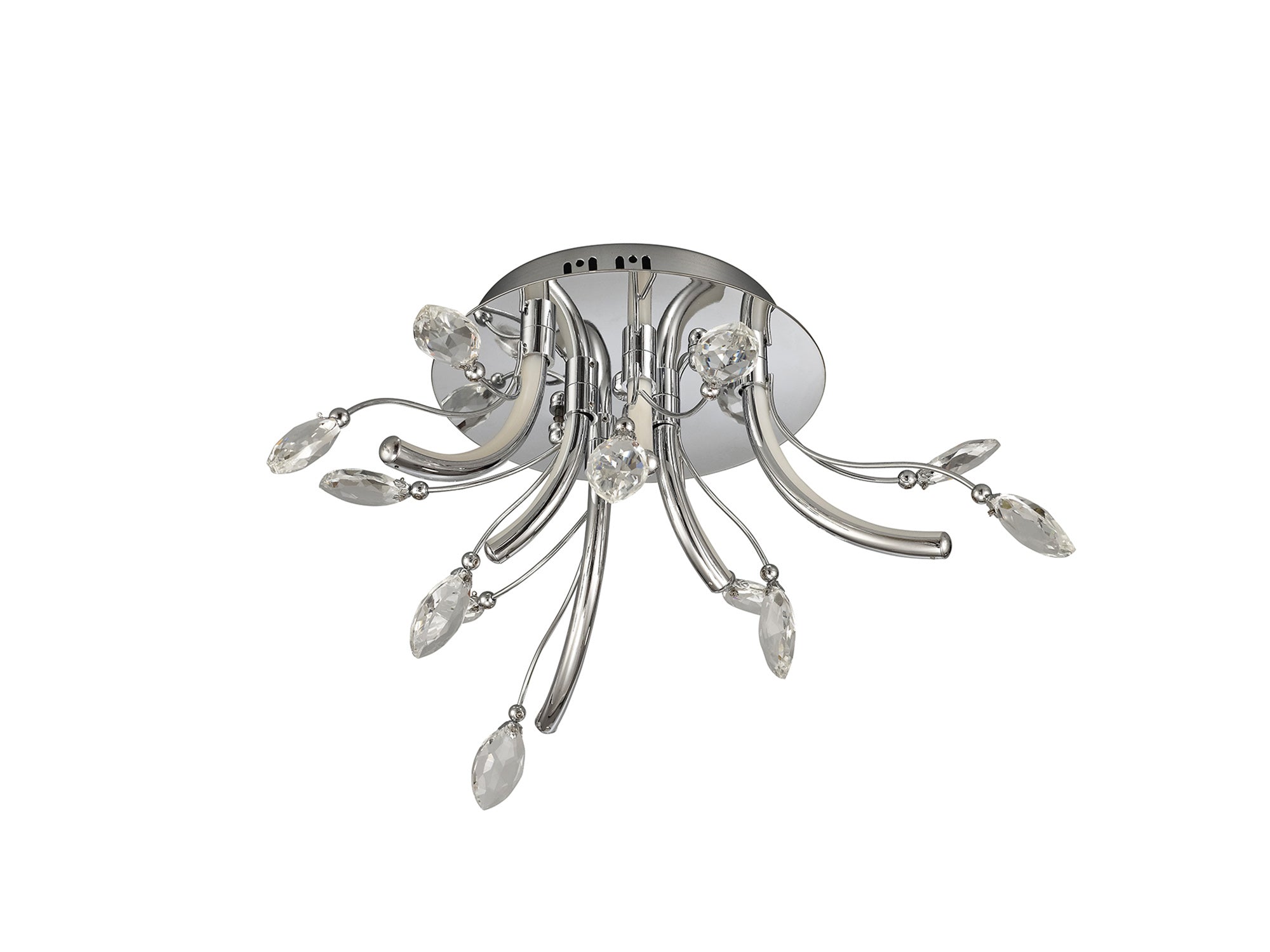 Cathrinee breaks away from the common methods of displaying integral LED lighting which have now become the norm for modern designs. The warm light from the LEDs are reflected throughout the fitting as a whole, diffused along the curved chrome arms protruding from the ceiling plate. The curvature of these arms first sending the light in an outwards direction then begins to throw the light at an upward angle. This ensures the leaf shaped clear crystals, fixed to the ends of the polished chrome waved stems, are enhanced by the LED light to produce a dazzling effect. With various lighting options available, Cathrinee's sophisticated elegance is striking even when unlit.