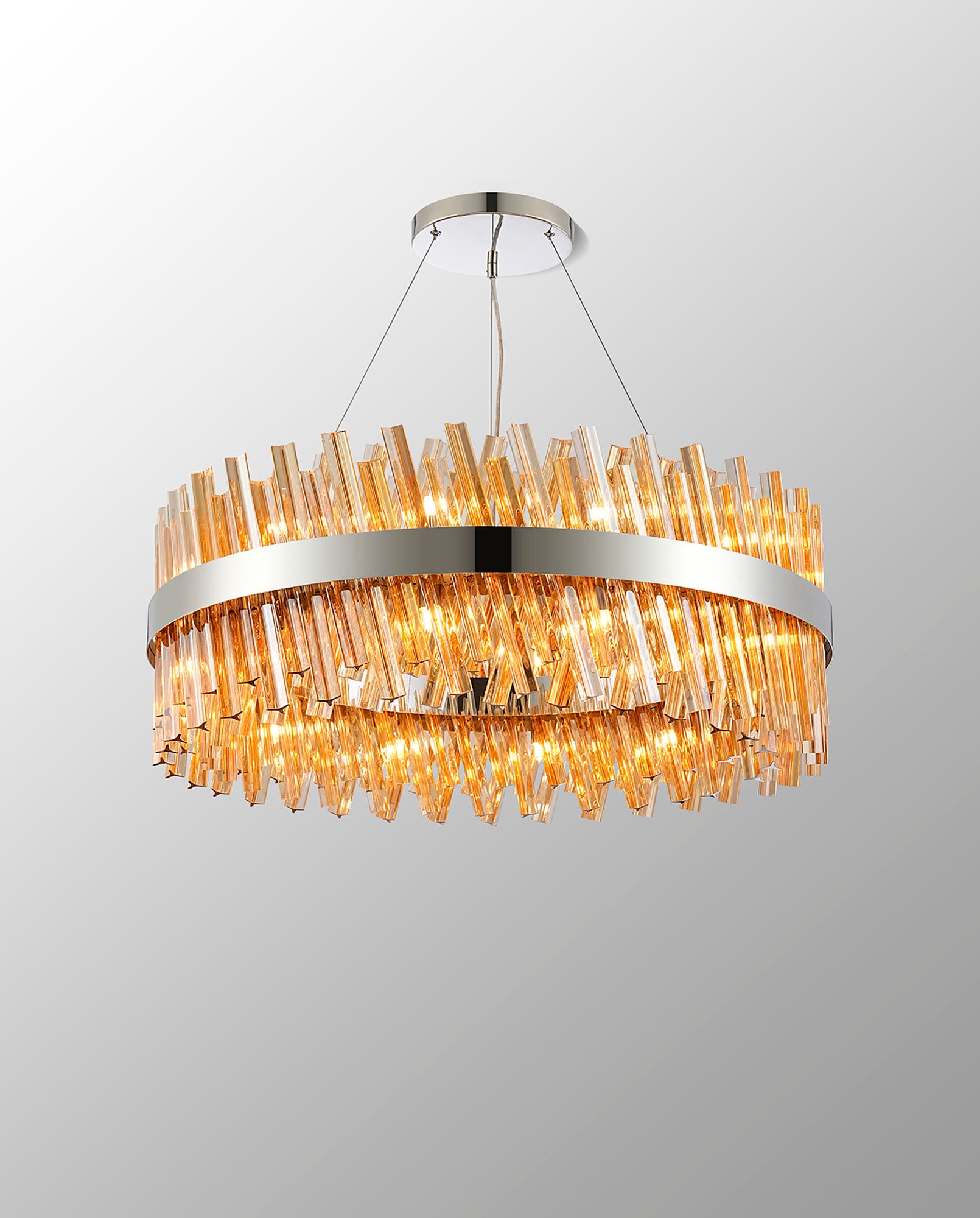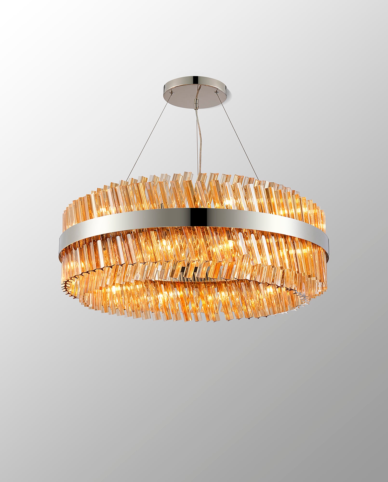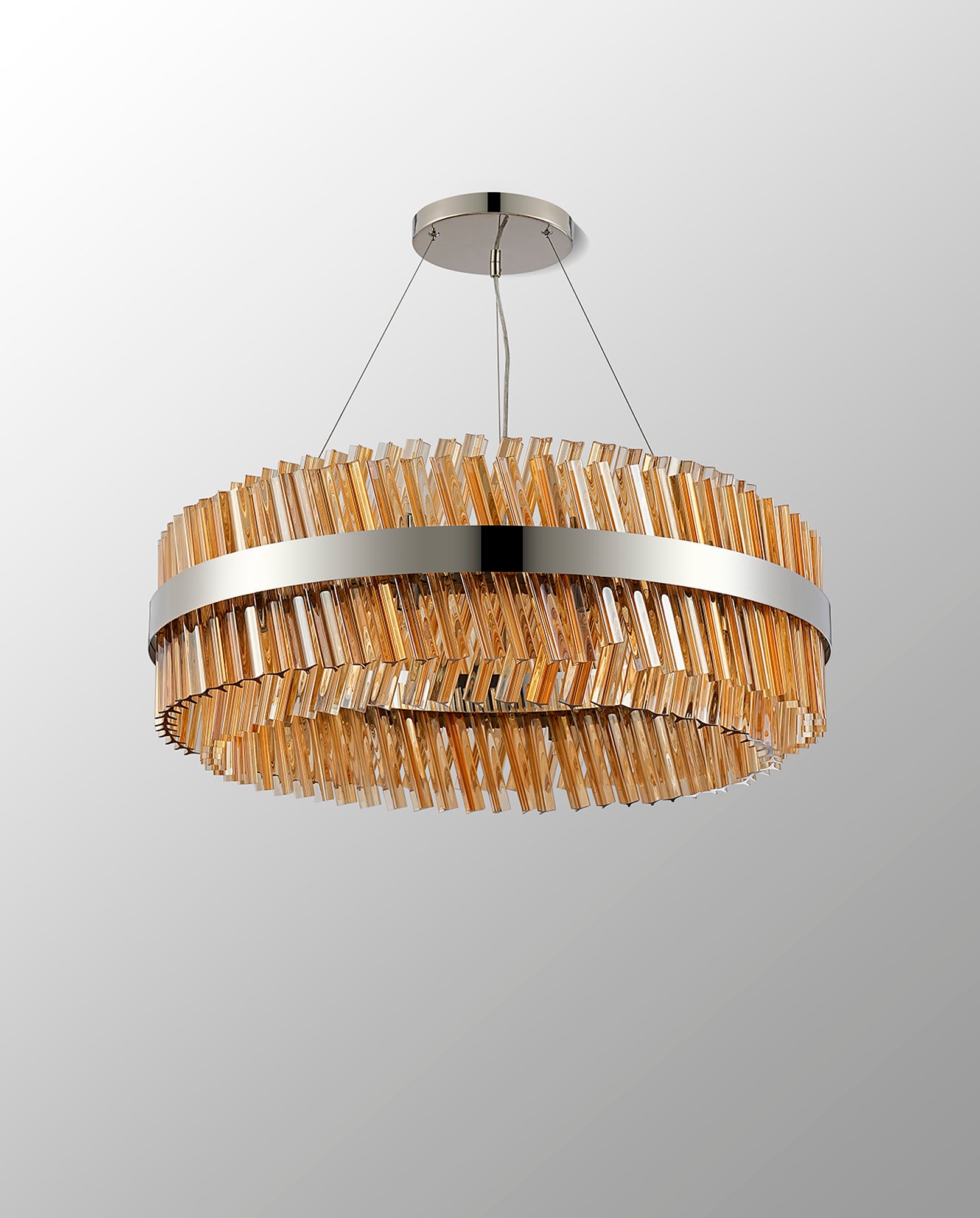 Brief Description Paddington 24 x G9, Pendant Round, Polished Nickel/Amber (23.13kg)