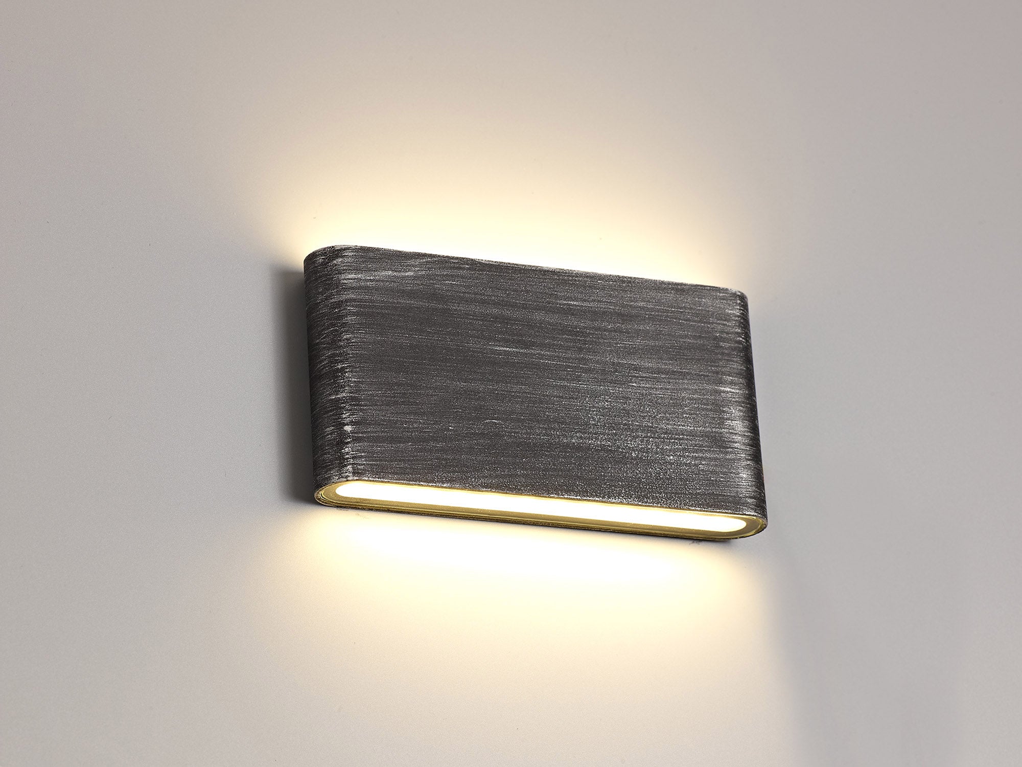 Lily harmoniously combines traditional weathered aspects with modern technology to create an interesting IP rated collection of wall lamps. Available in two sizes the integral 3000K LEDs are diffused across the longest edge of the rounded rectangular frame. The LEDs modern presence is tempered by the rustic brushed black and silver colour finish, giving the impression of repurposed metalwork. The minimal projection of this range ensures the reduction of obstruction caused by the wall lamp regardless of its application.